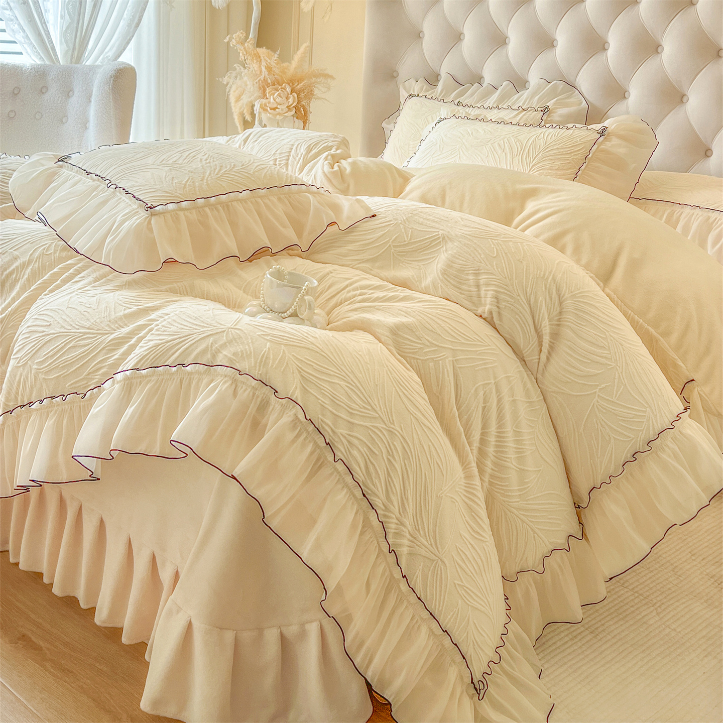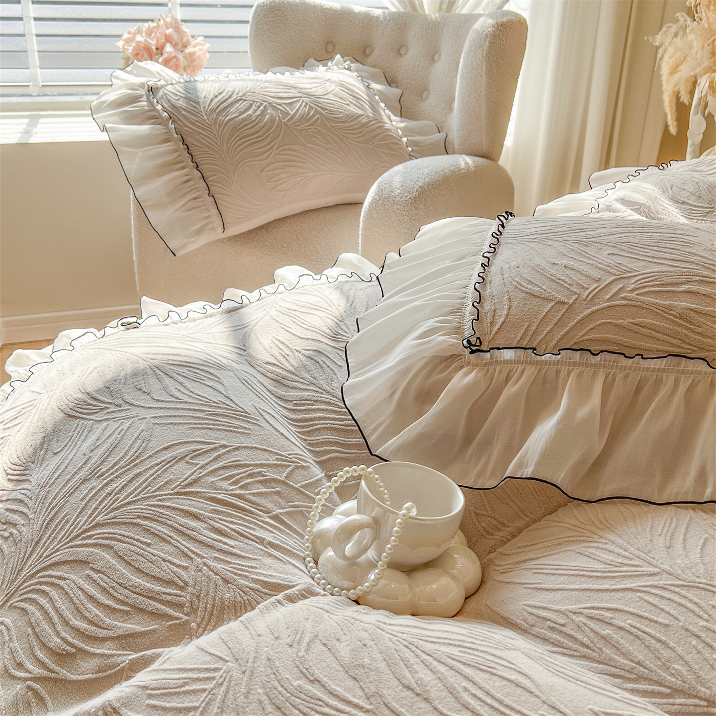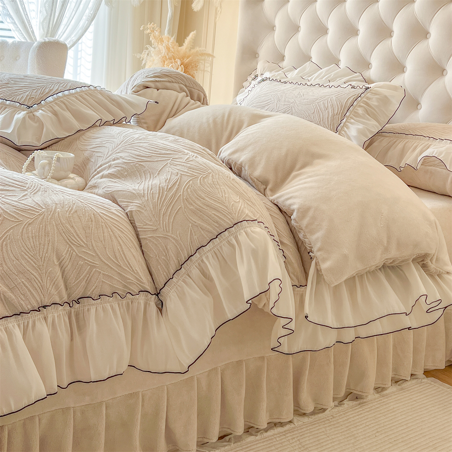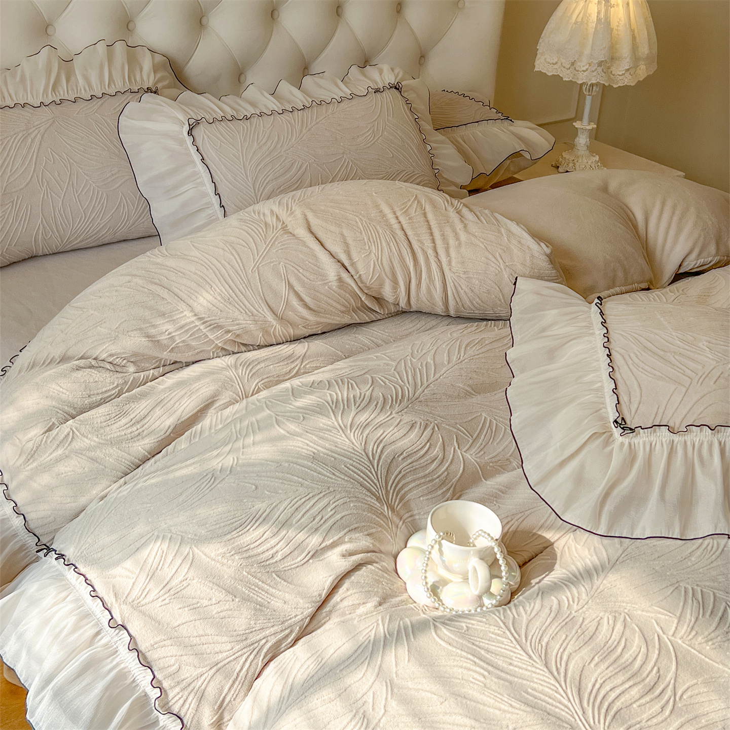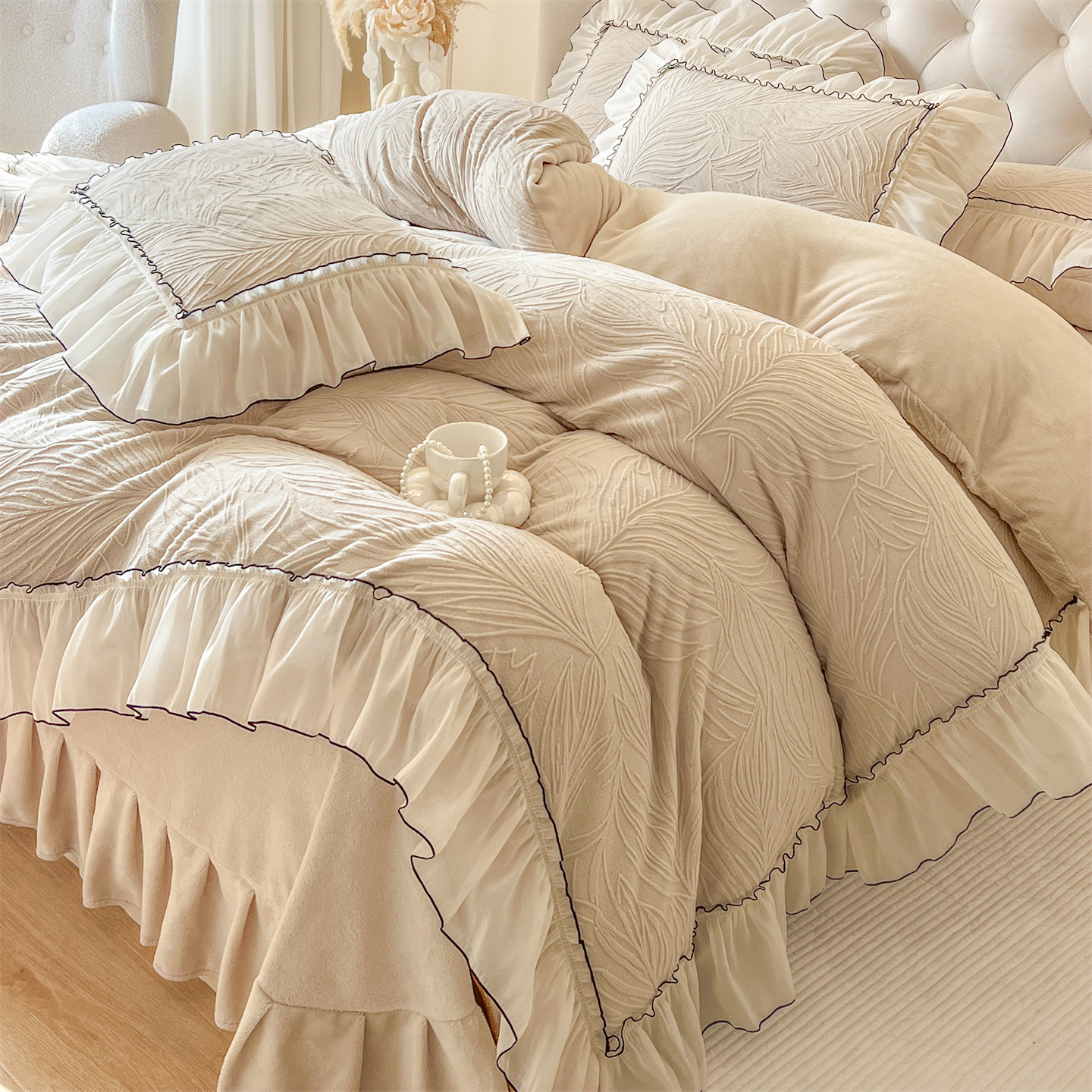 商品名称:满座家居 2025爆款230克高克重雕花牛奶绒床盖四件套 金枝玉叶-米咖