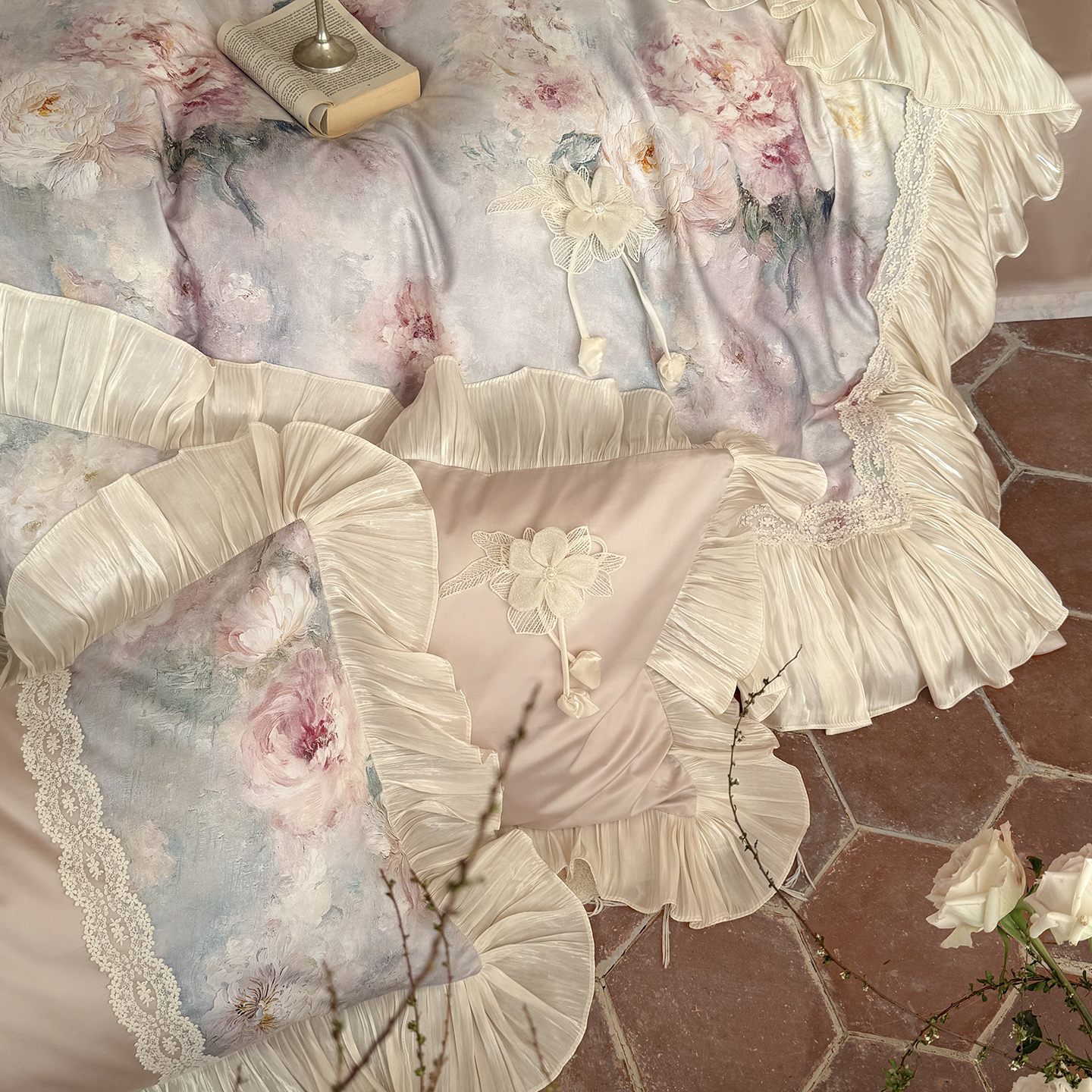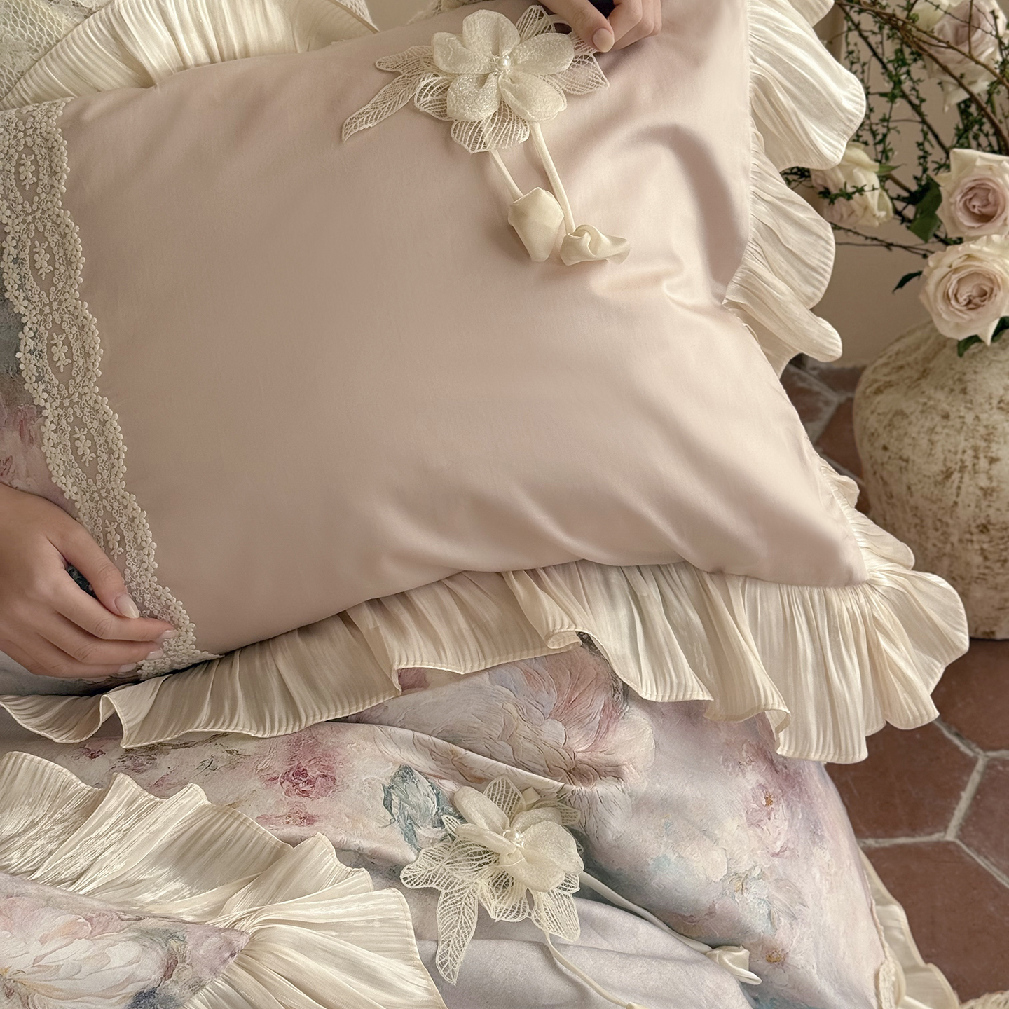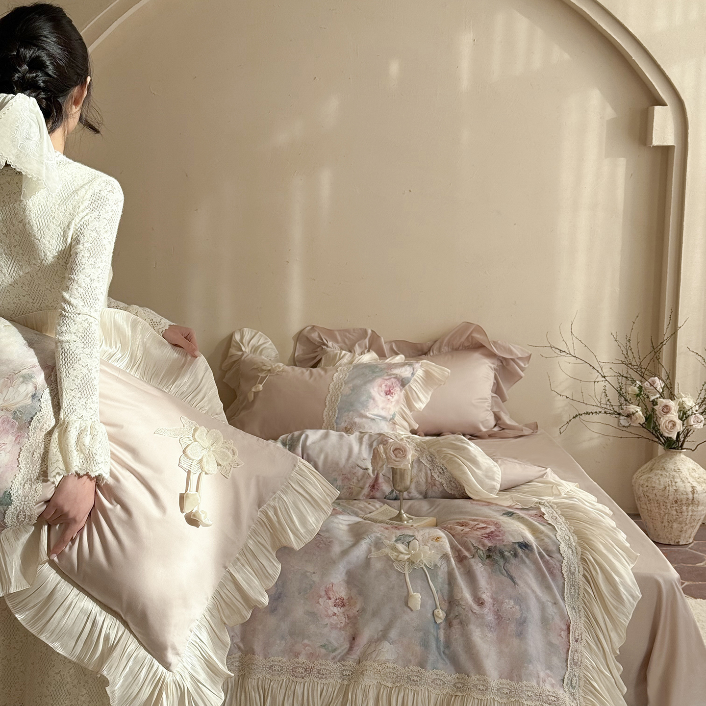 (总)佳汐蓝 2025春夏新品双层皱皱纱刺绣+织带+荷叶边四件套--白茶花,奶白,曲奇