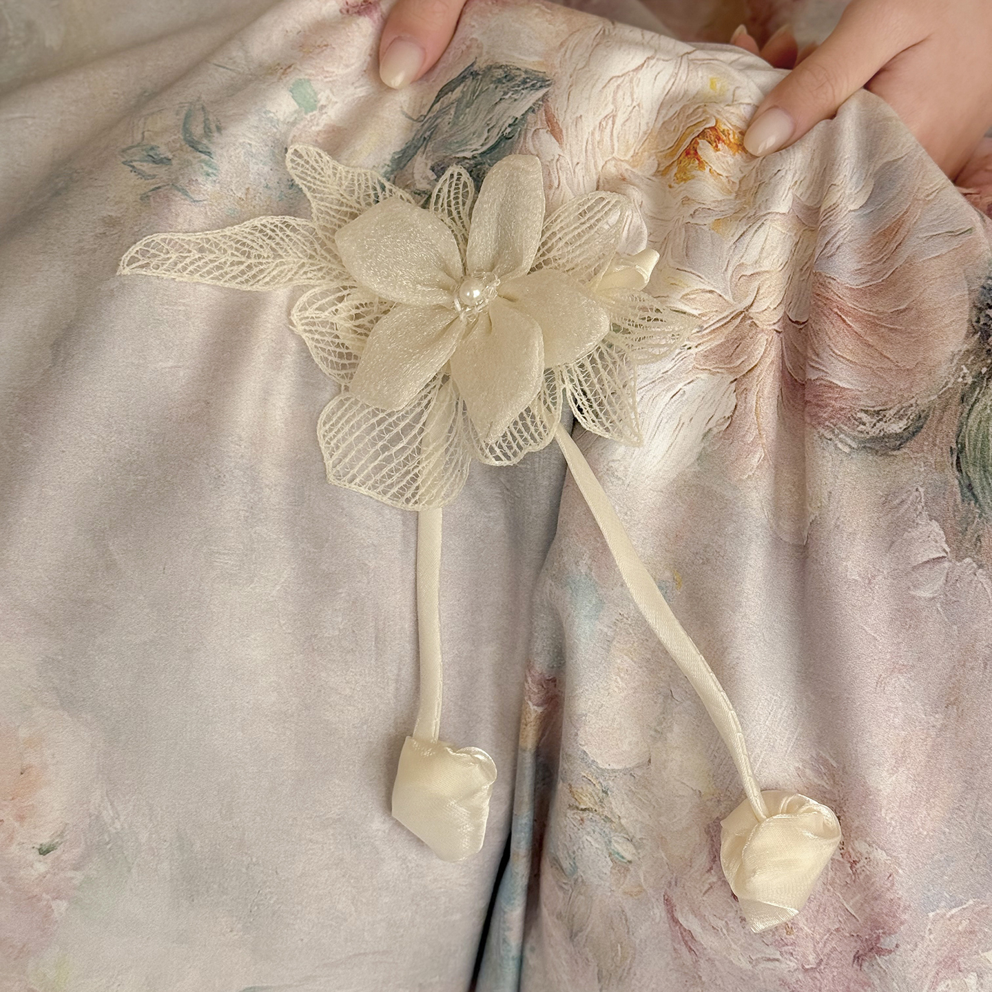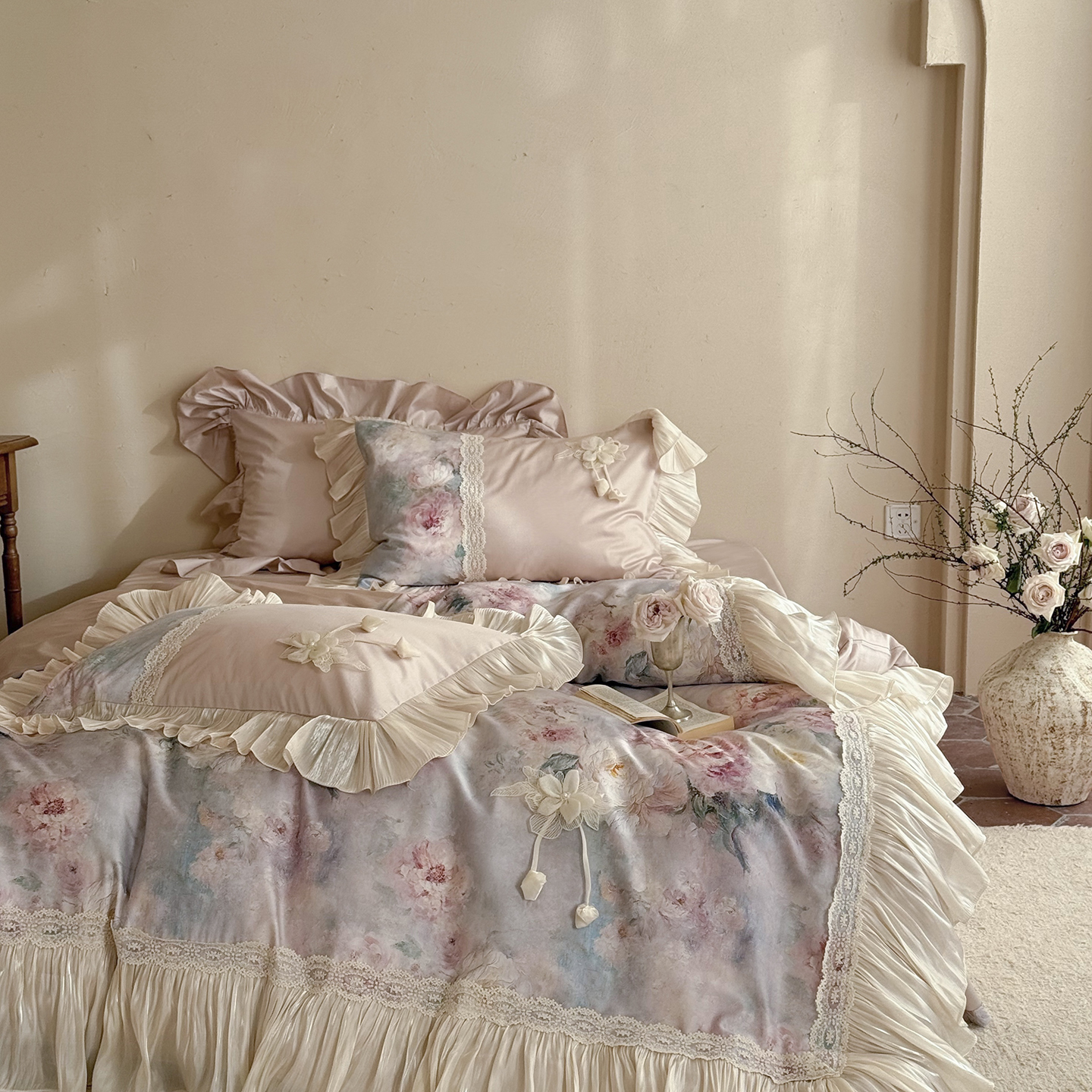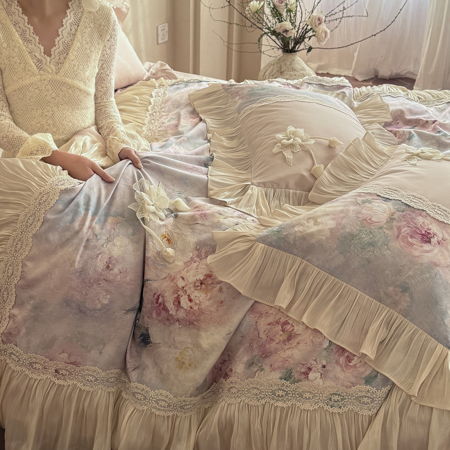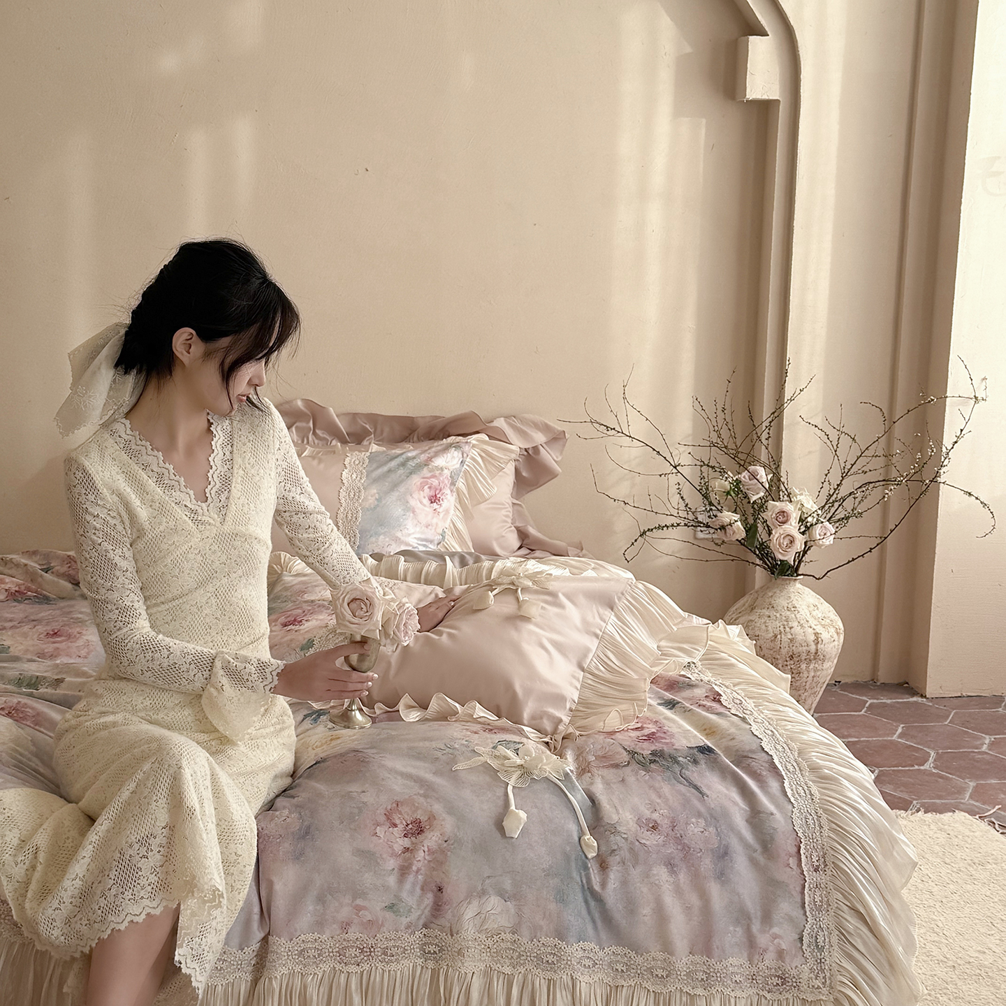 (总)佳汐蓝 2025春夏新品双层皱皱纱刺绣+织带+荷叶边四件套--白茶花,奶白,曲奇