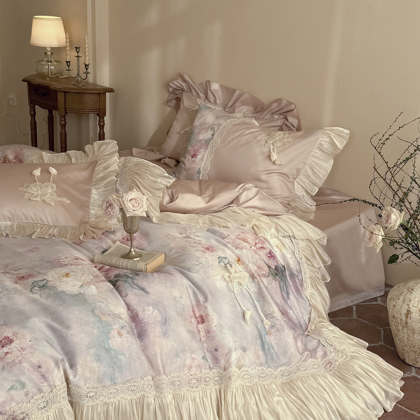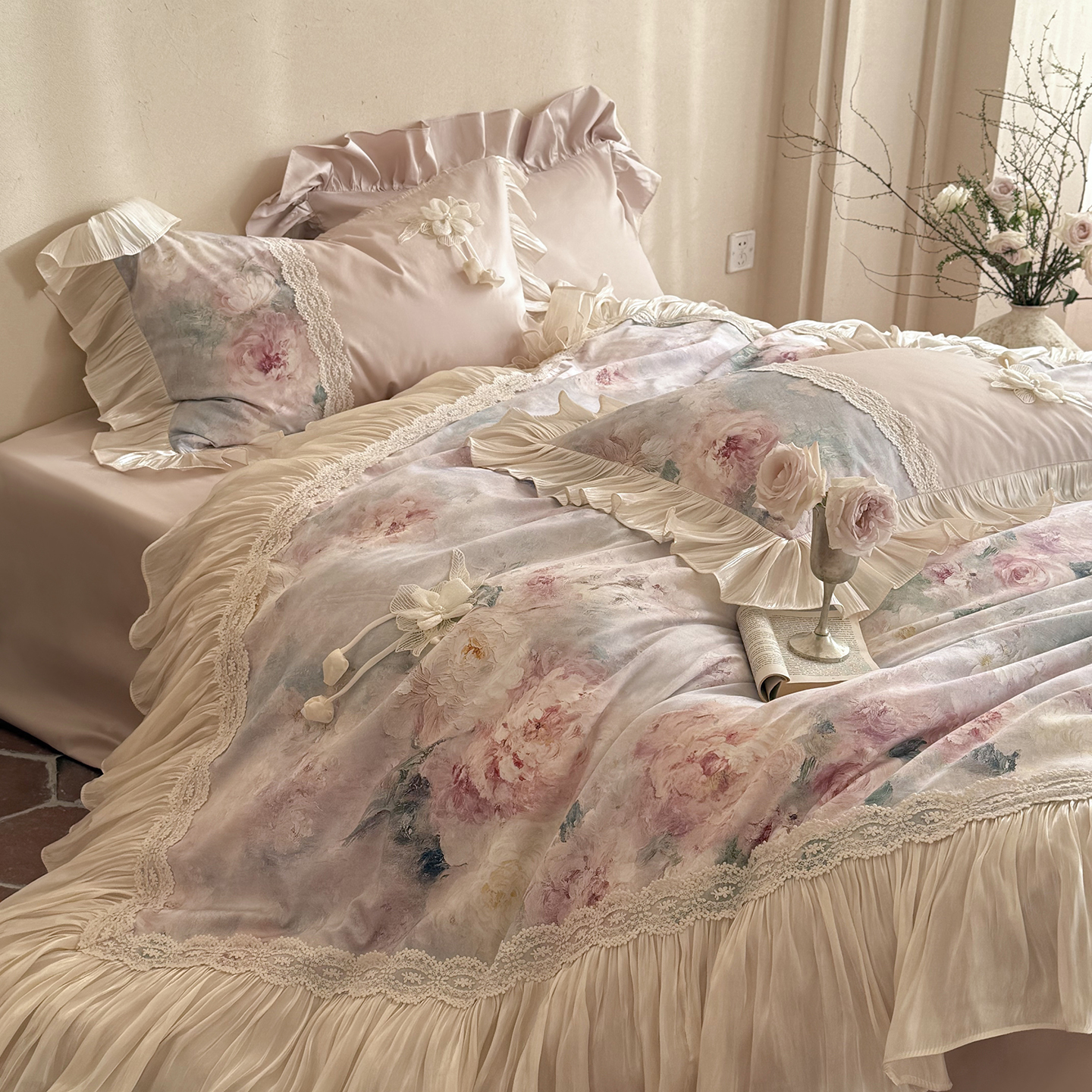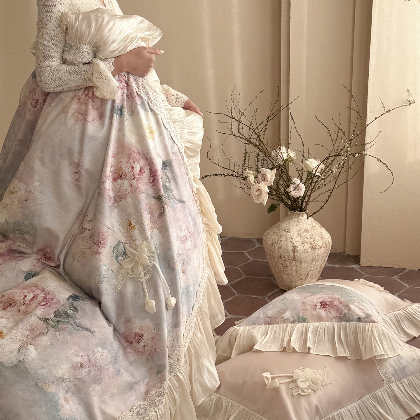 (总)佳汐蓝家纺 2026新款春夏棉麻新品印花+流光纱四件套-春缇玫瑰,春缇玫瑰