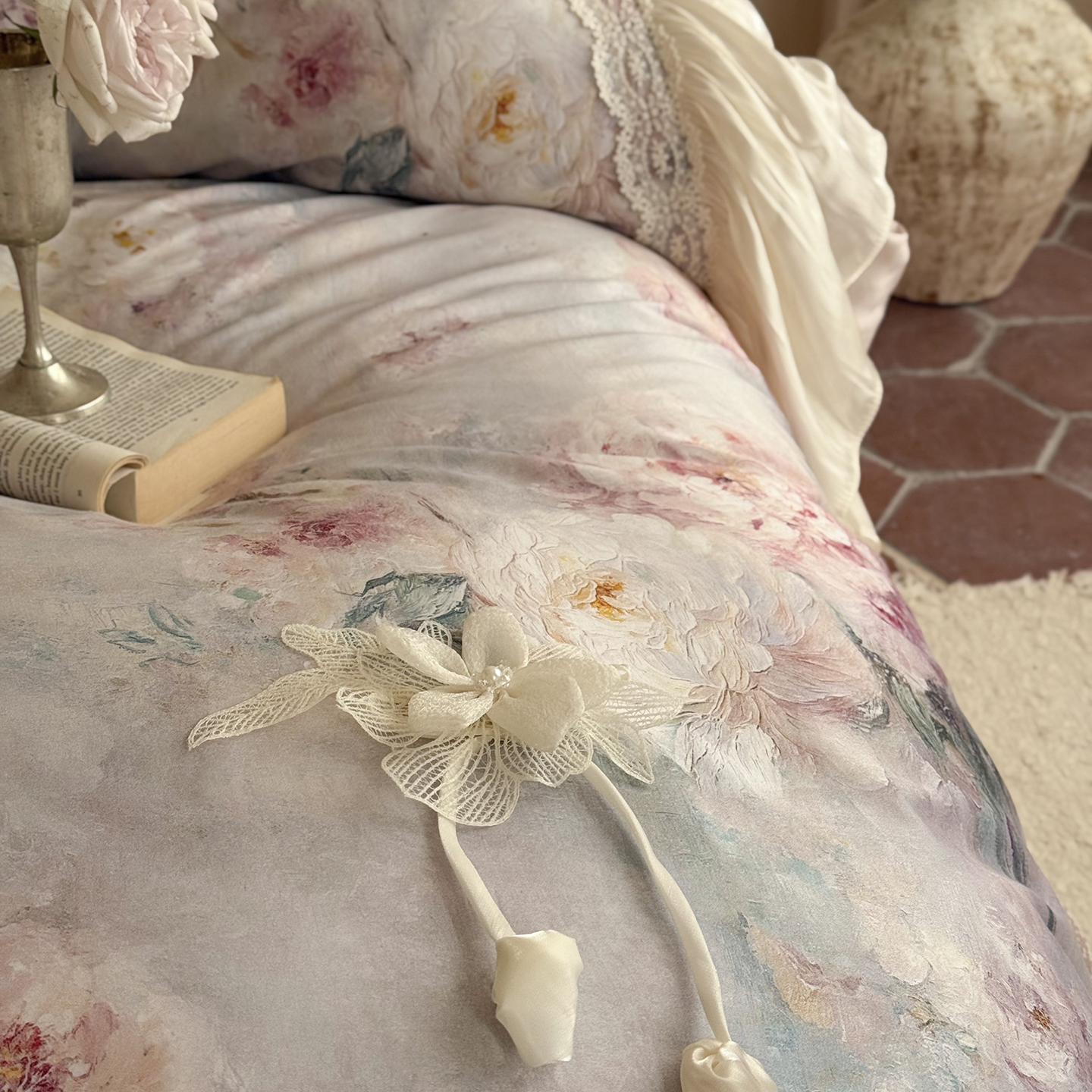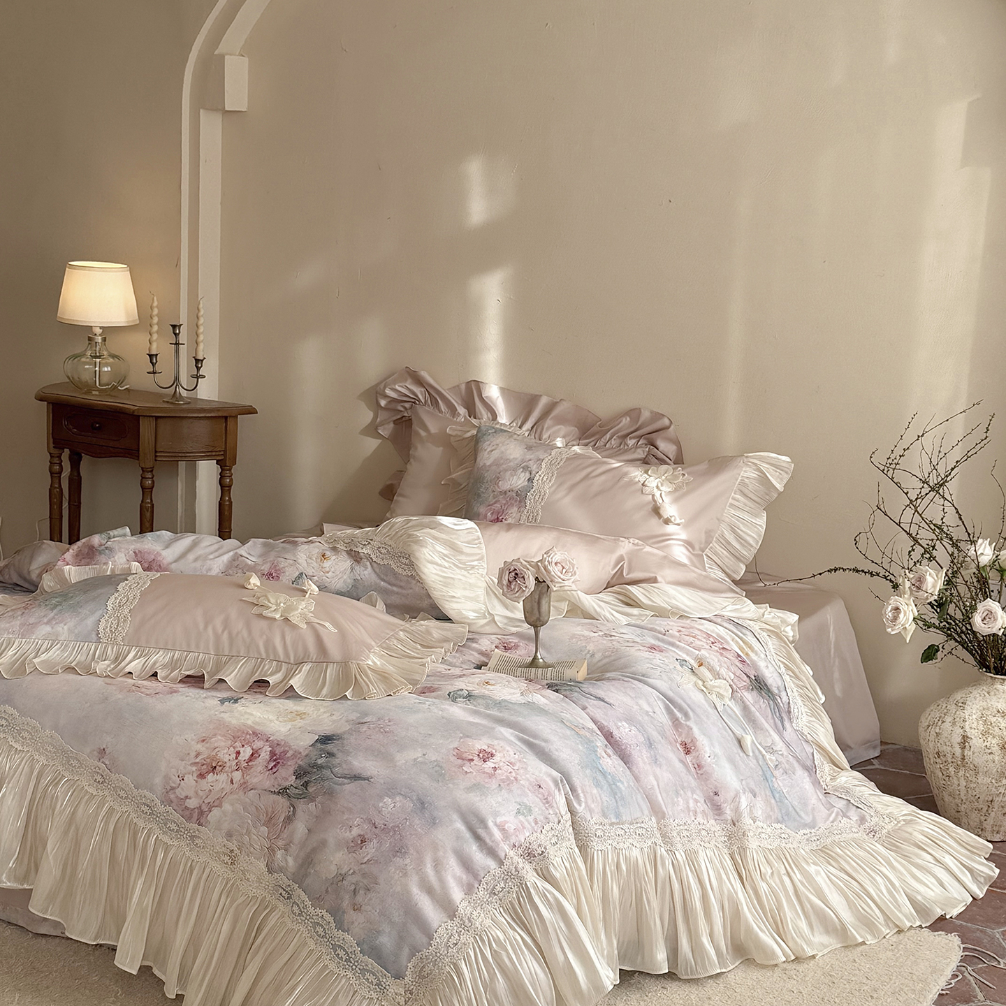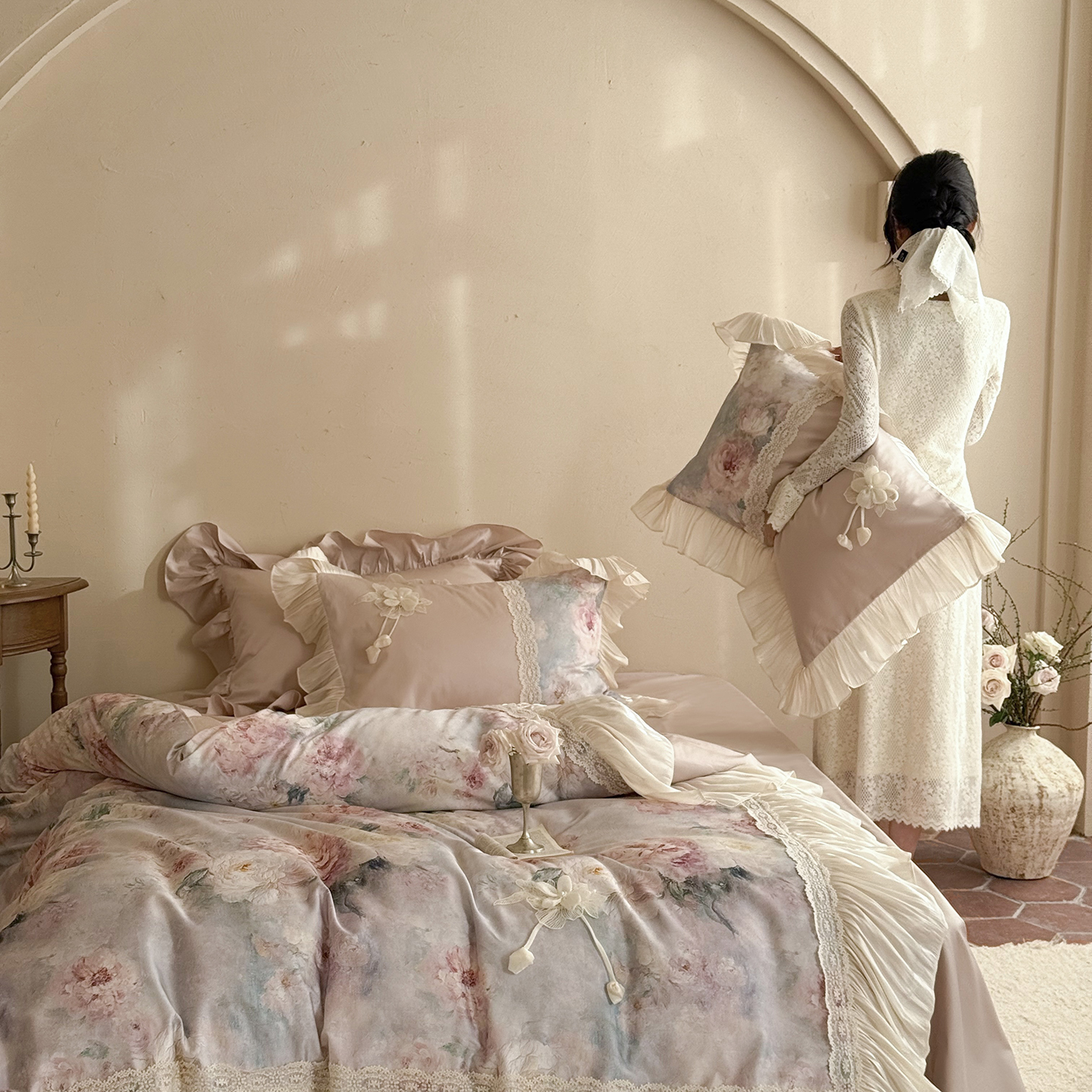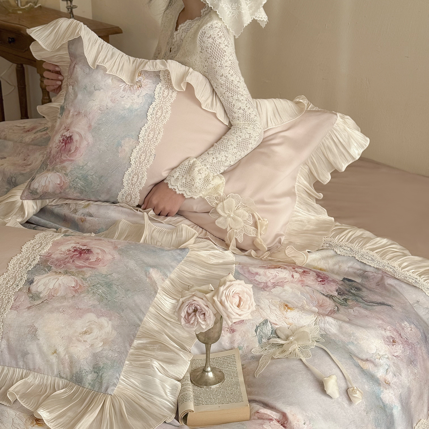 (总)佳汐蓝家纺 2026新款春夏棉麻新品印花+流光纱四件套-春缇玫瑰,春缇玫瑰