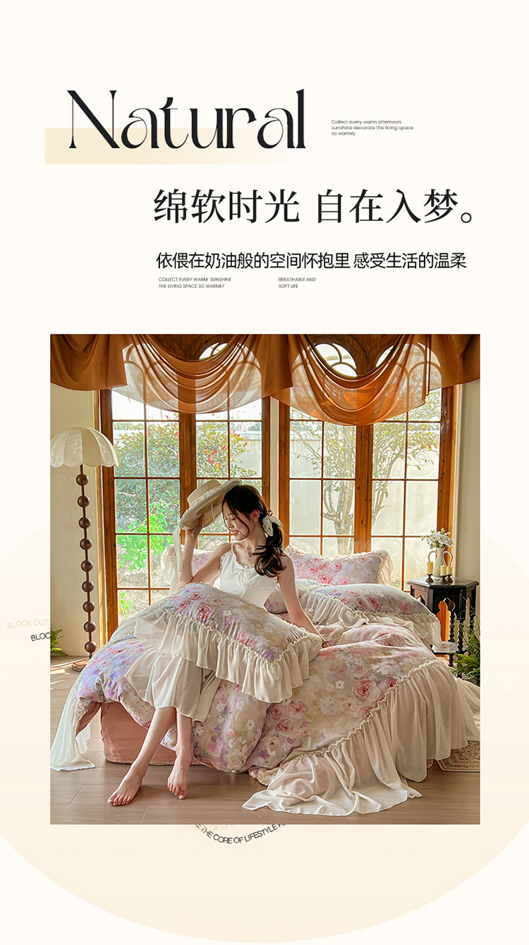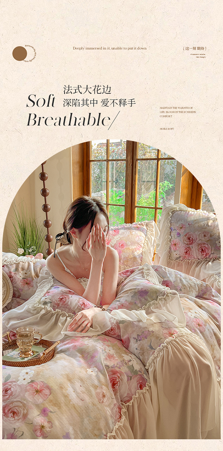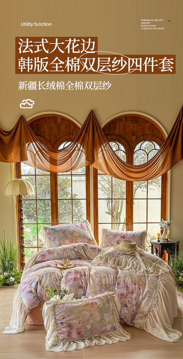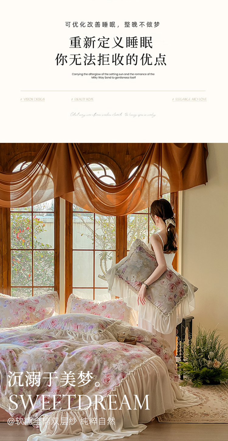 (总)【苏东来】2026高端韩版法式花边纯棉全棉双层纱四件套复古赫本公主风浪漫荷叶边花卉纯棉四件套被套床单,青黛,芳菲,花隐,拾光里里,木槿,蔷薇恋人,虞美人,疏影,暮色玫瑰,爱丽丝