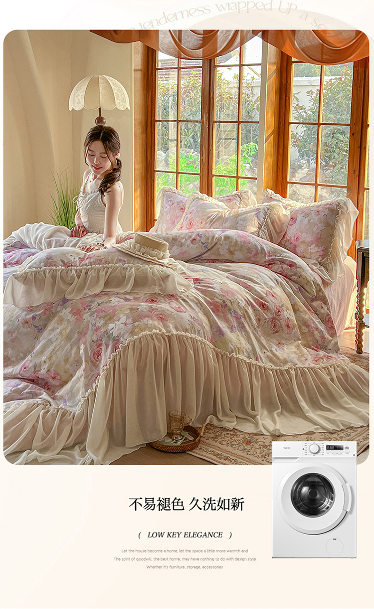 (总)【苏东来】2026韩版蕾丝花边纯棉全棉双层纱四件套印花纯棉四件套法式赫本木耳花边全棉公主双层纱四件套,紫薇花,夕颜,海盐气泡蓝,白玫瑰,晴空,香槟玫瑰,白茶,暗香,玫瑰庄园,甜心小兔粉,蜜桃玫瑰,小苍兰,小梨漫,春意浓,西海岸蓝,西海岸紫,马卡龙,春日女孩,兔软软,樱花,花漾甜心,紫苏,乌梅子酱