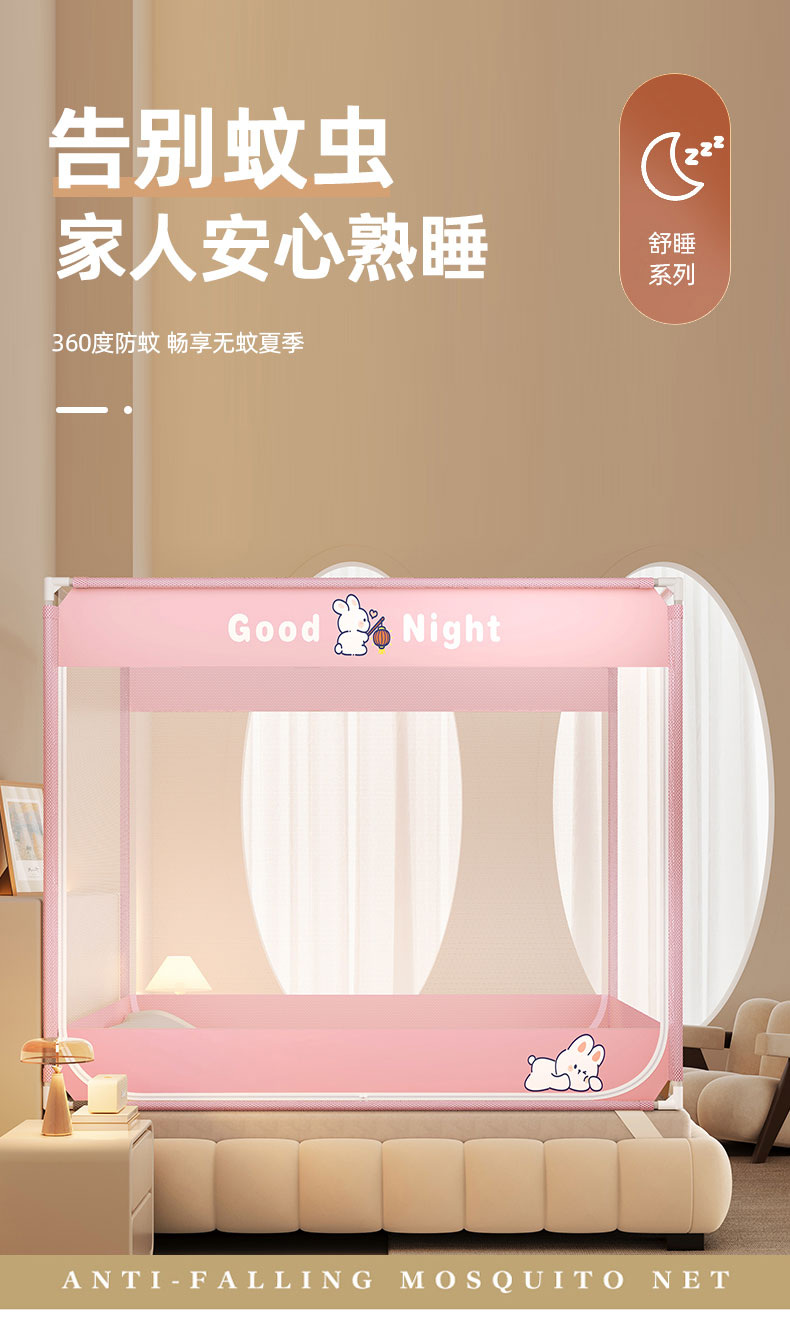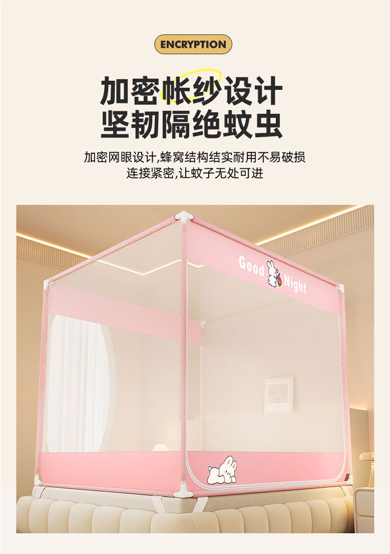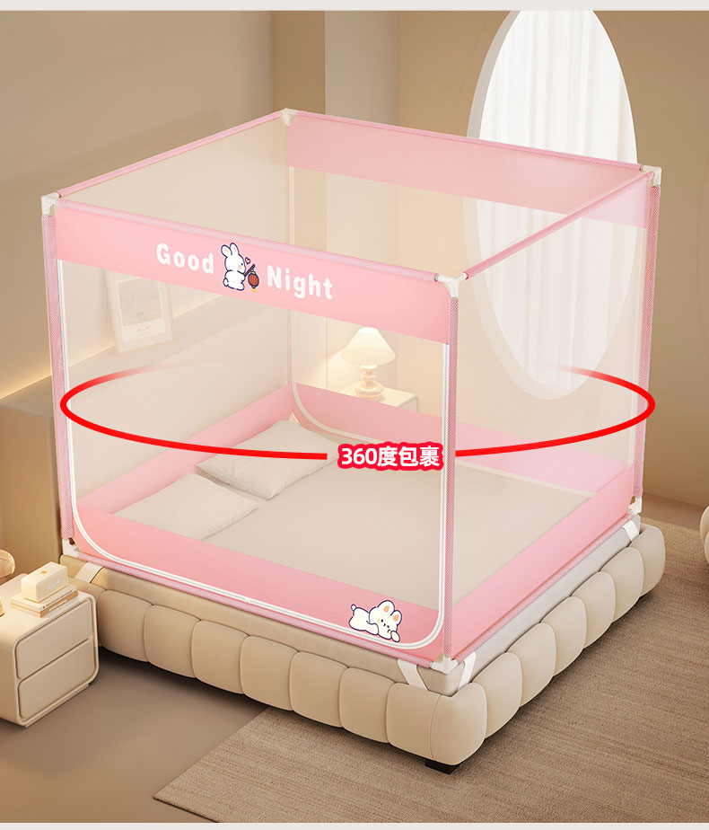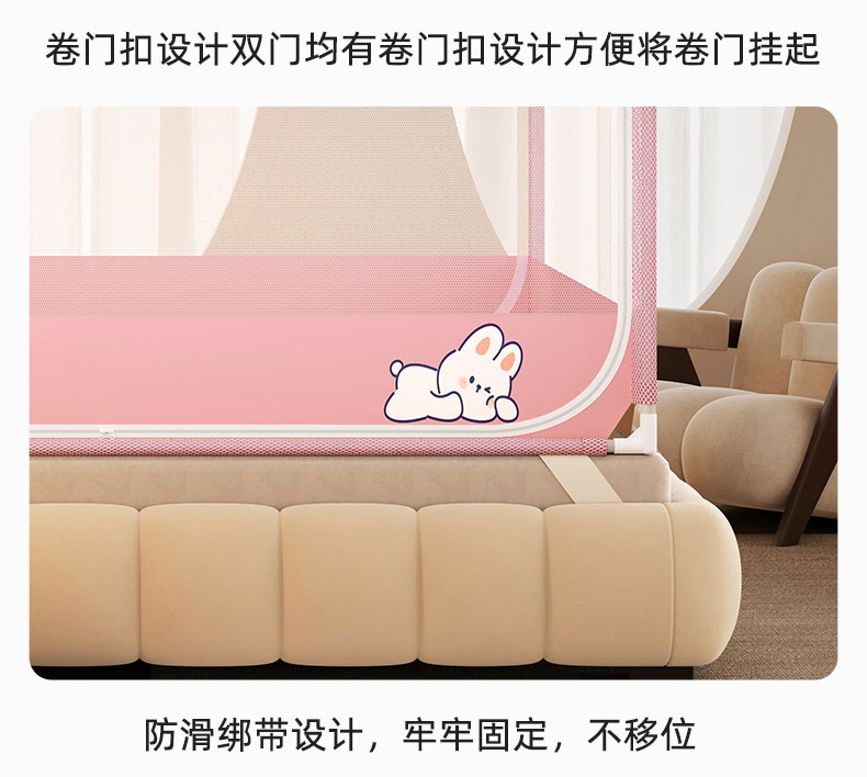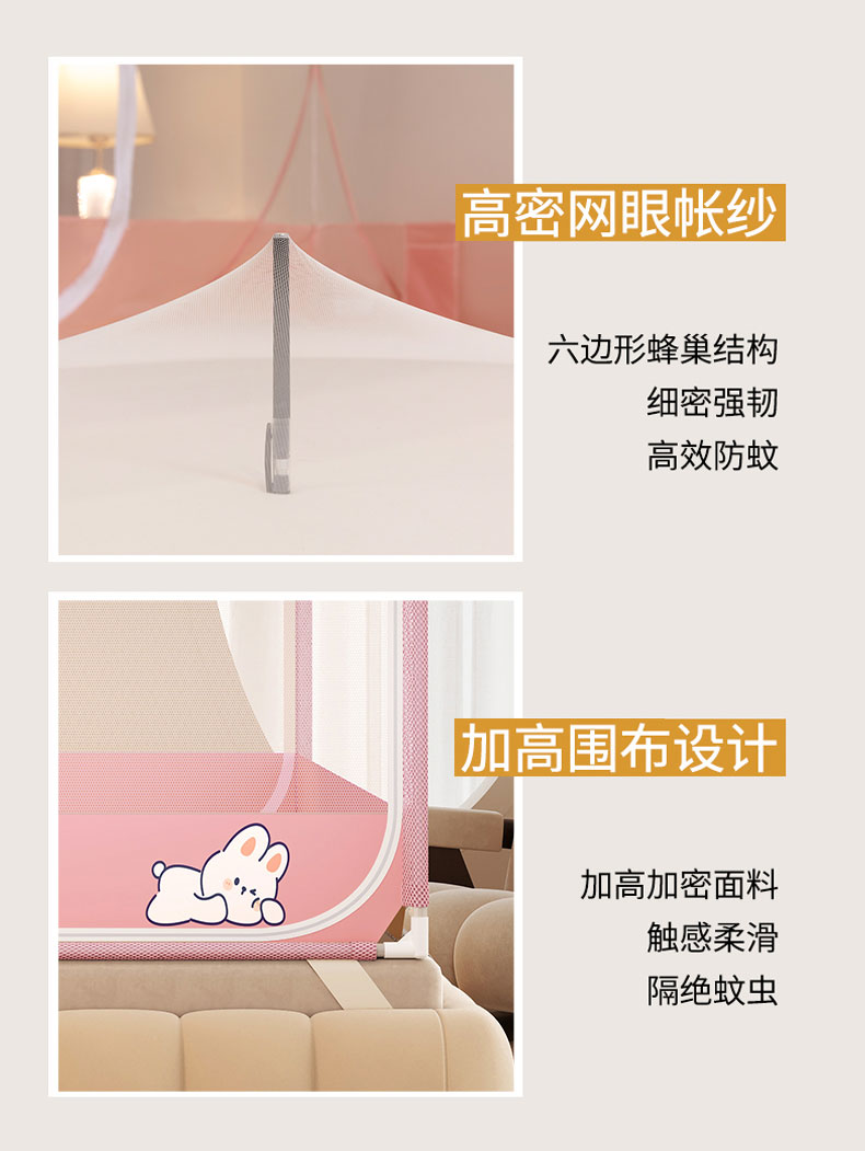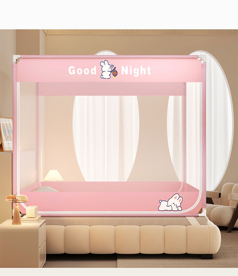 商品名称:青竹苑 2026新款双门全底外穿坐床式蚊帐儿童防摔防蚊拉链方帐 兔子粉
