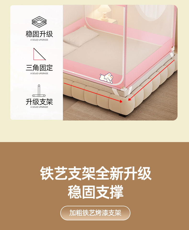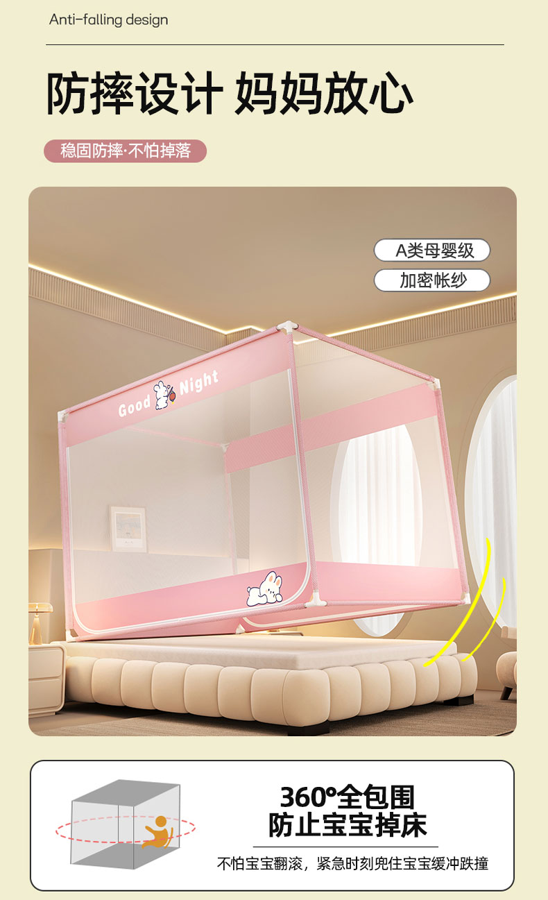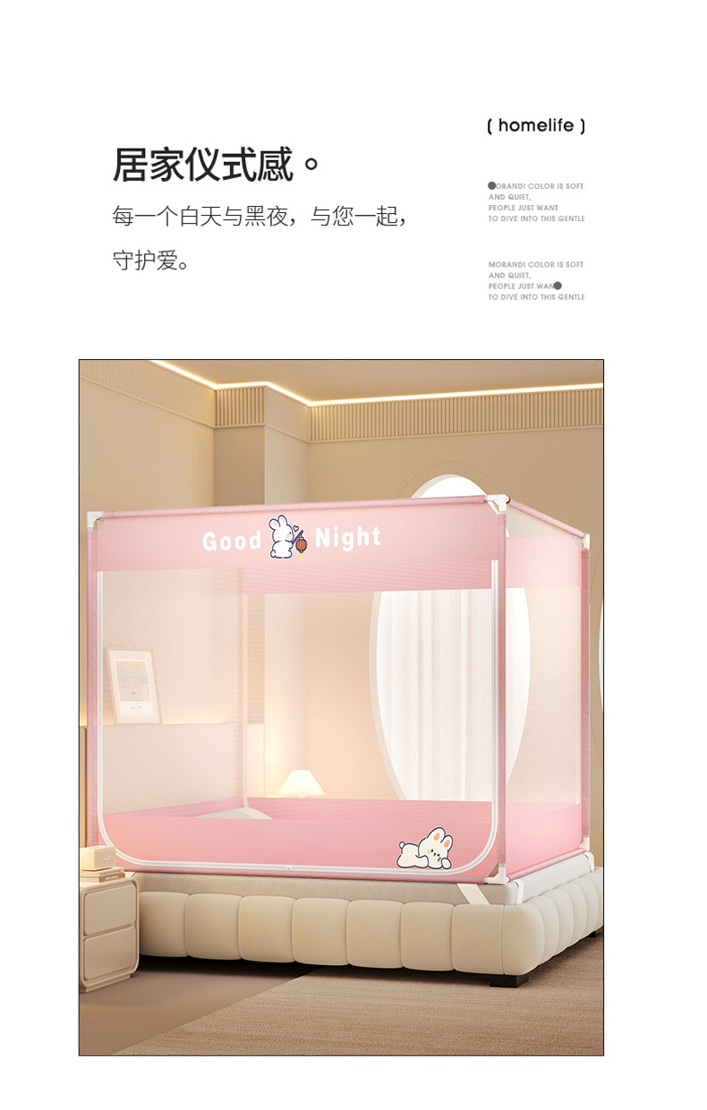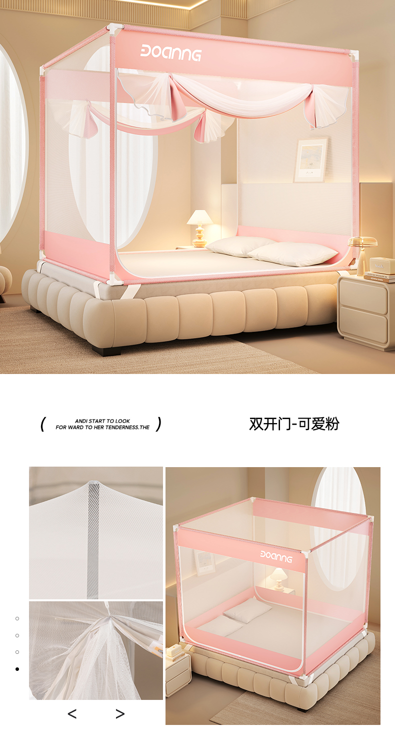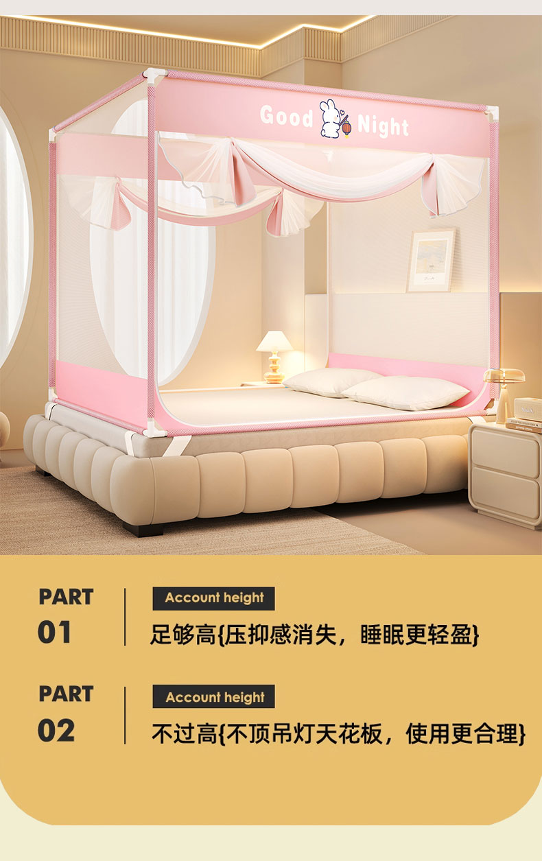 商品名称:青竹苑 2026新款双门全底外穿坐床式蚊帐儿童防摔防蚊拉链方帐 兔子粉