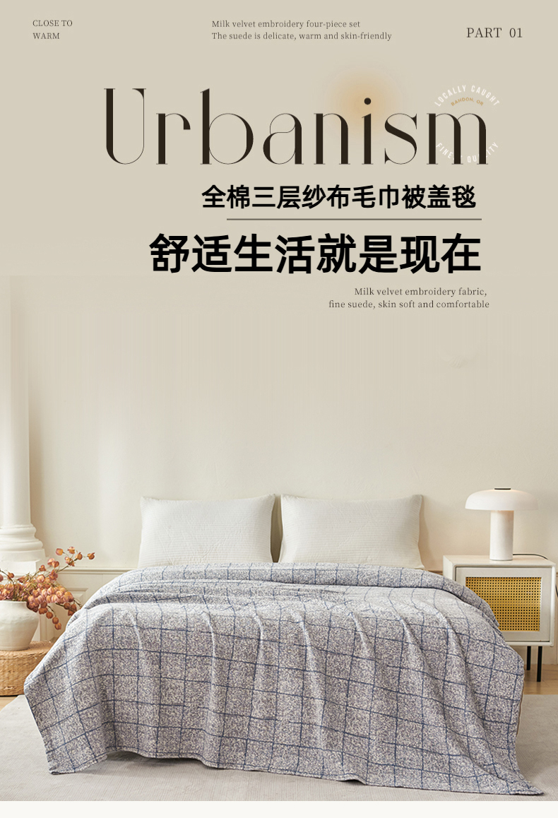 (总)悦然毛巾被 2026新款全棉纯棉三层水洗色织纱布毛巾被盖毯夏凉被空调被,繁花似锦,净色玫瑰,摩登,清格慢居灰,清格慢居蓝