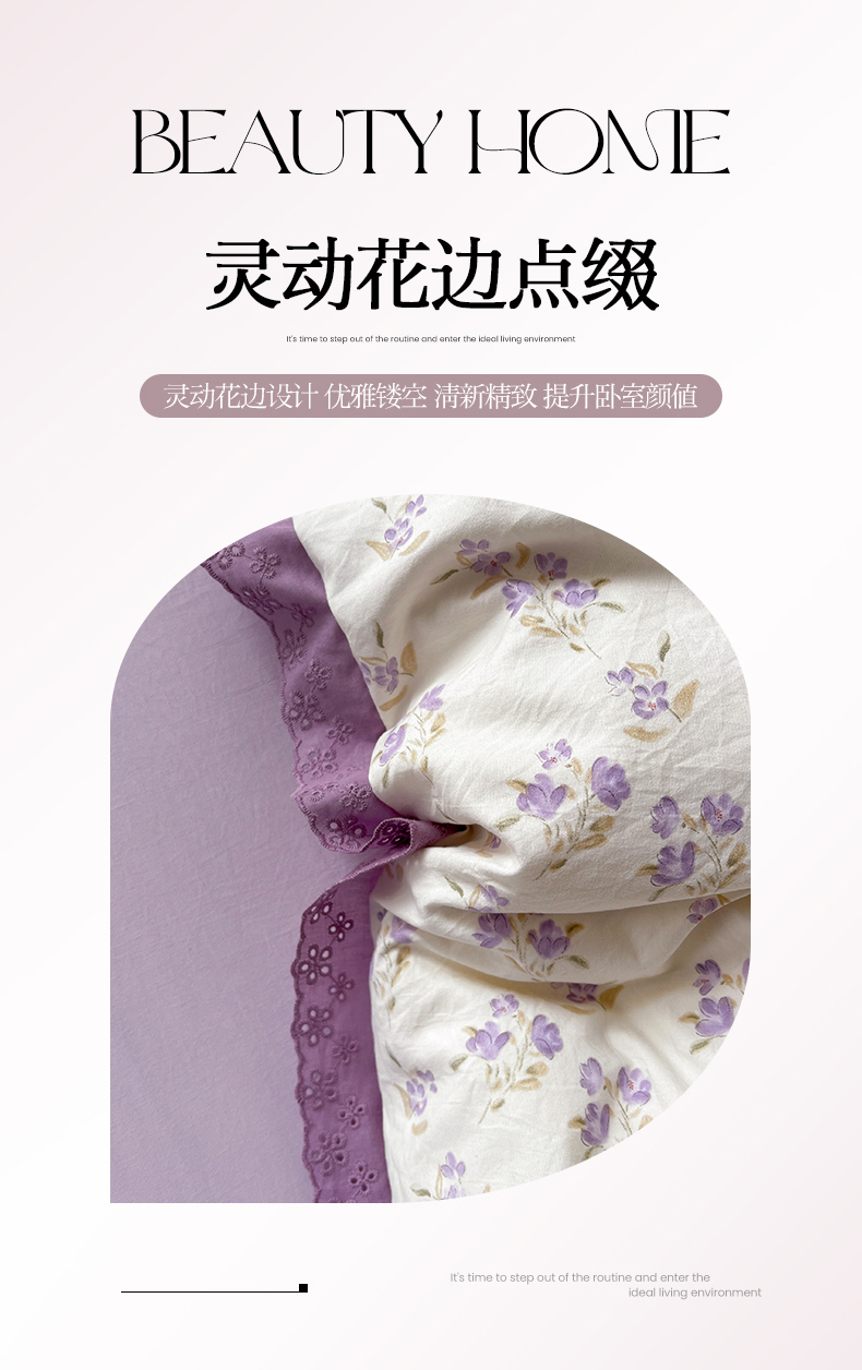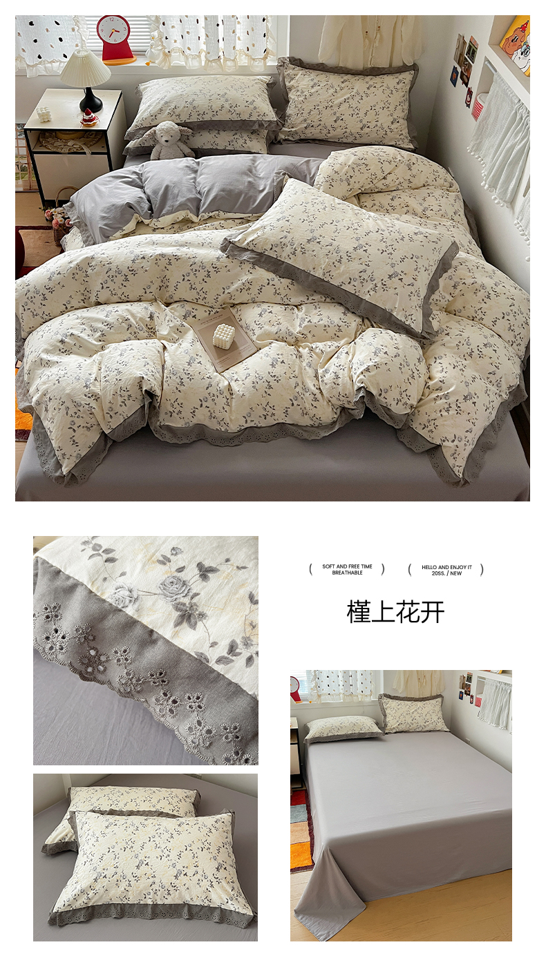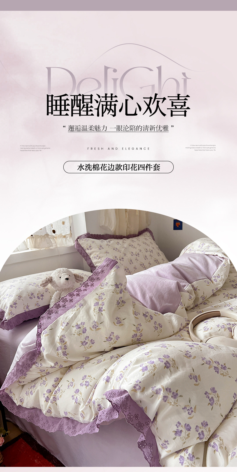 (总)逸林家纺《原希尔顿逸林》 2026新款春款古法水洗棉法式立体全棉花边拼接款四件套学生三件套单品被套枕套,狗狗家族,兔子园,知否,雨沫,花影,七分甜,漫花蝶舞,莓朵,组合图仅供展示-不可下单