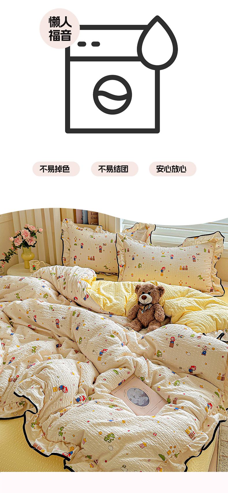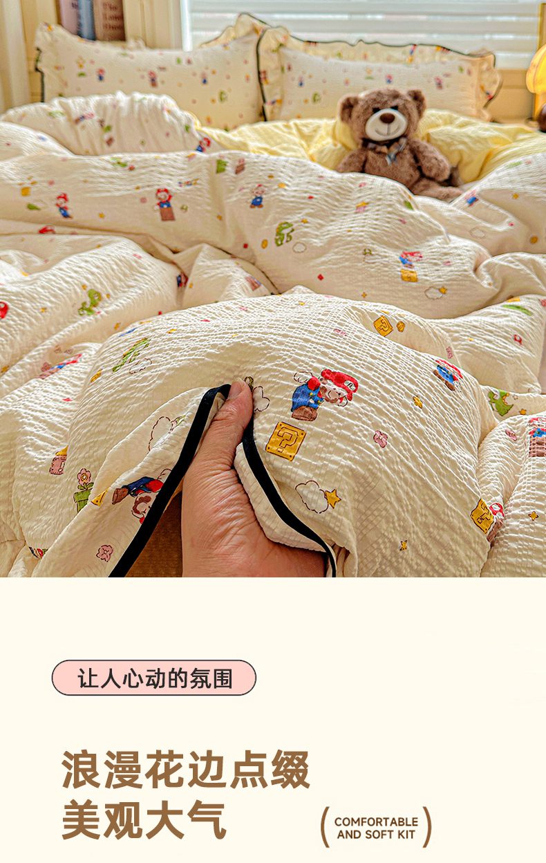 (总)芯贝儿 2026新品加厚法式泡芙棉水洗棉云感皱皱双层纱花边四件套,马上有钱,爱心蝴蝶结,彩色爱心,超级玛丽,蝶梦,快乐小熊,蓝调,萌宠,柠夏,奇奇乐园,青花,小飞马,小雪人,旋转木马