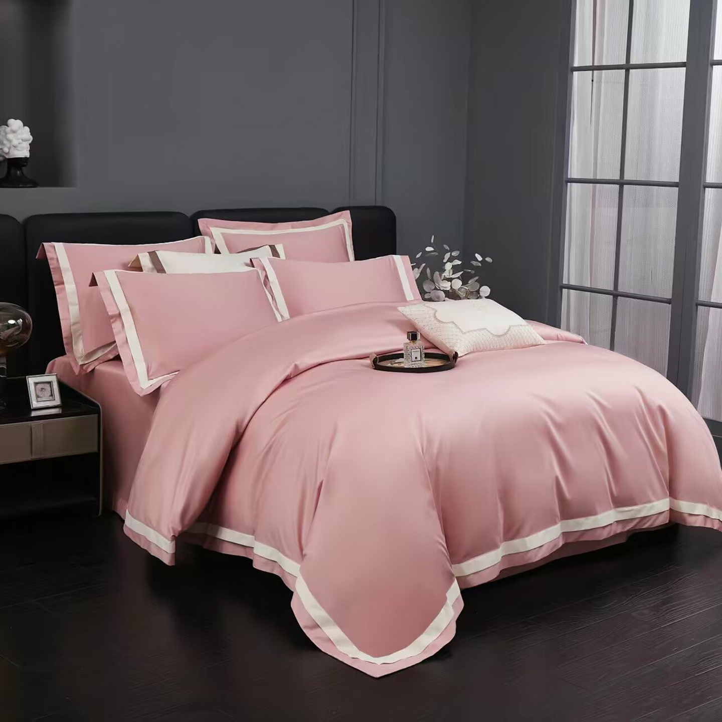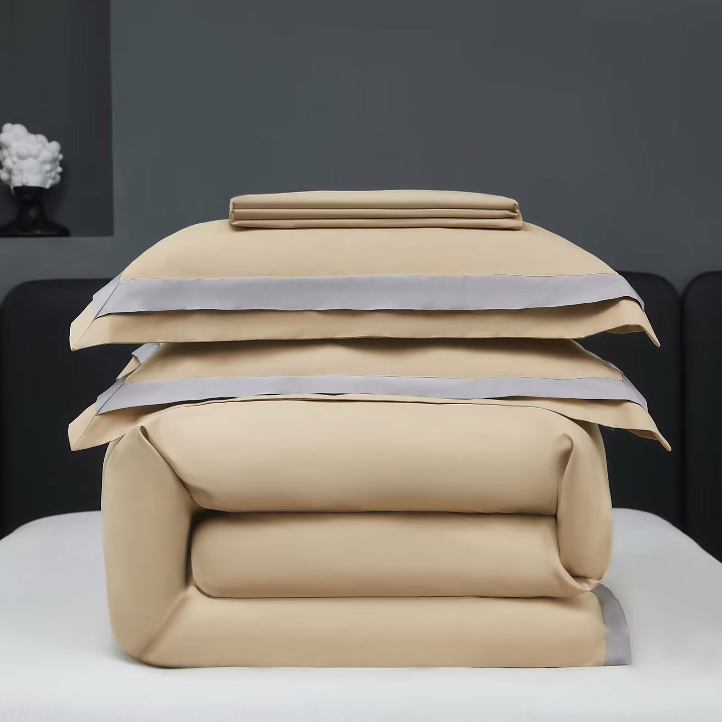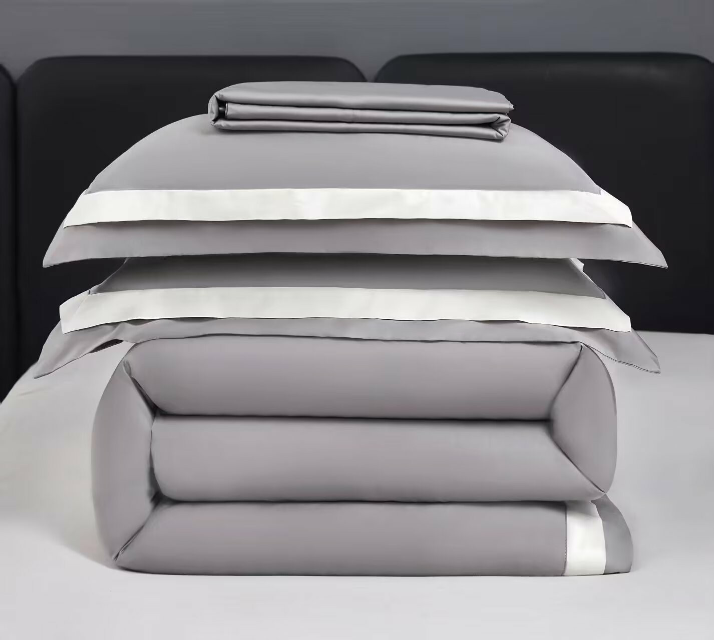 商品名称:沐珩家纺 2026新款双拼角拼色100s长绒棉工艺四件套-凯伦 凯伦-弥漫灰