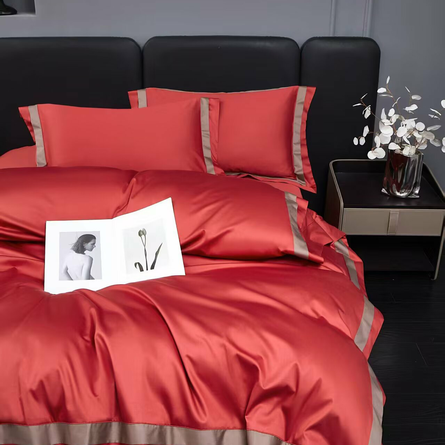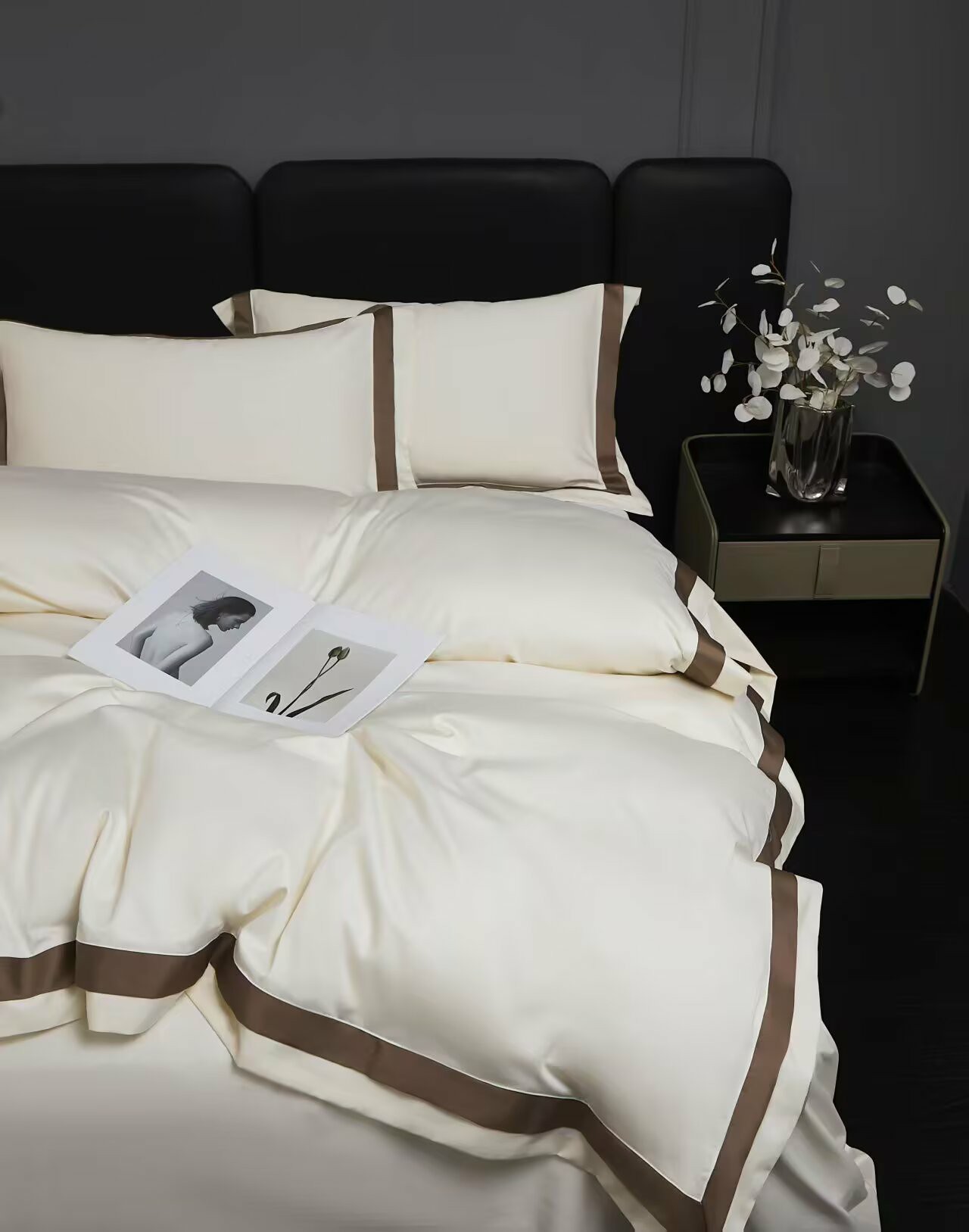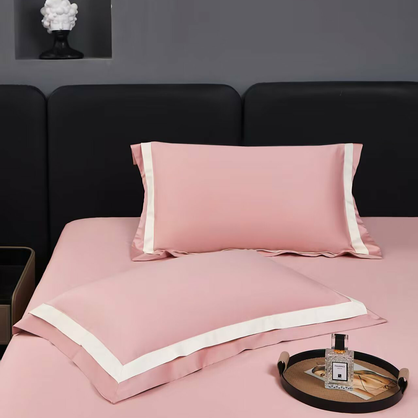 商品名称:沐珩家纺 2026新款双拼角拼色100s长绒棉工艺四件套-凯伦 凯伦-弥漫灰