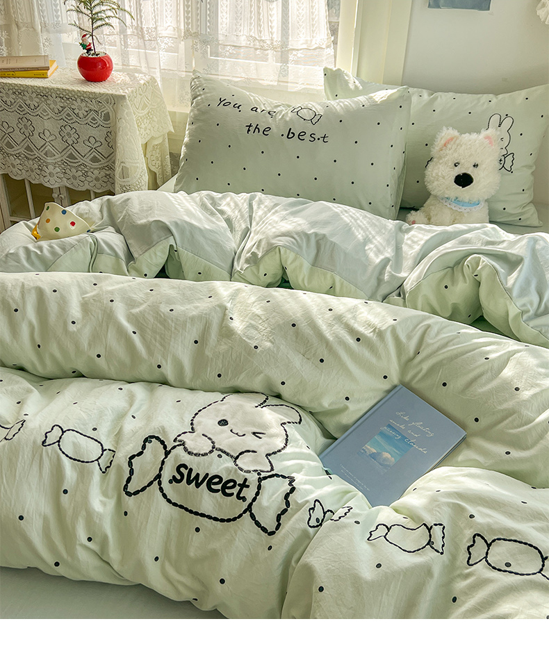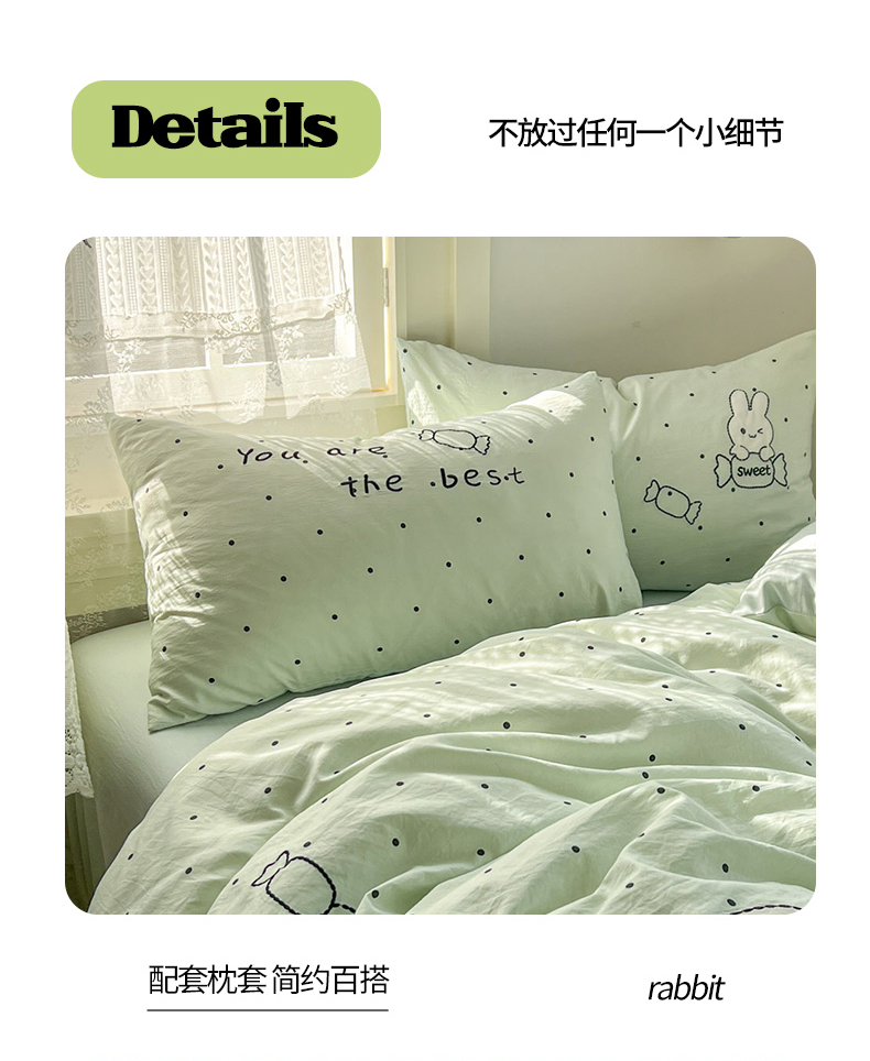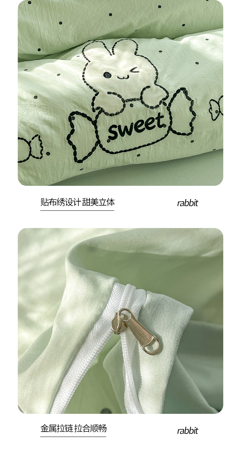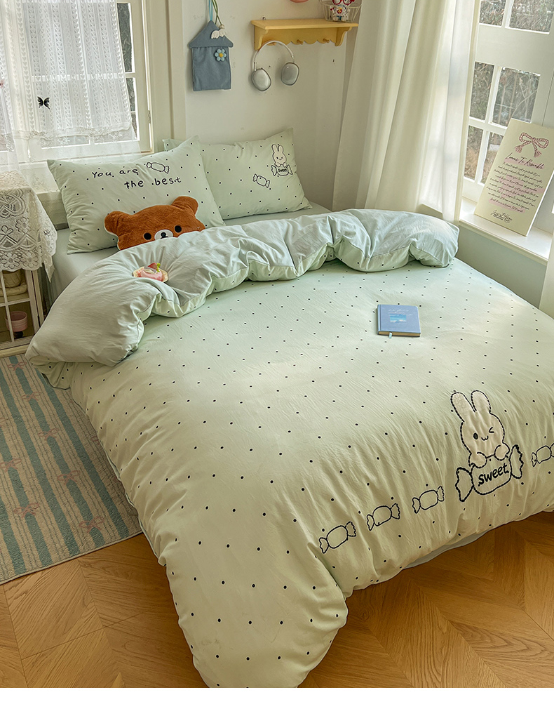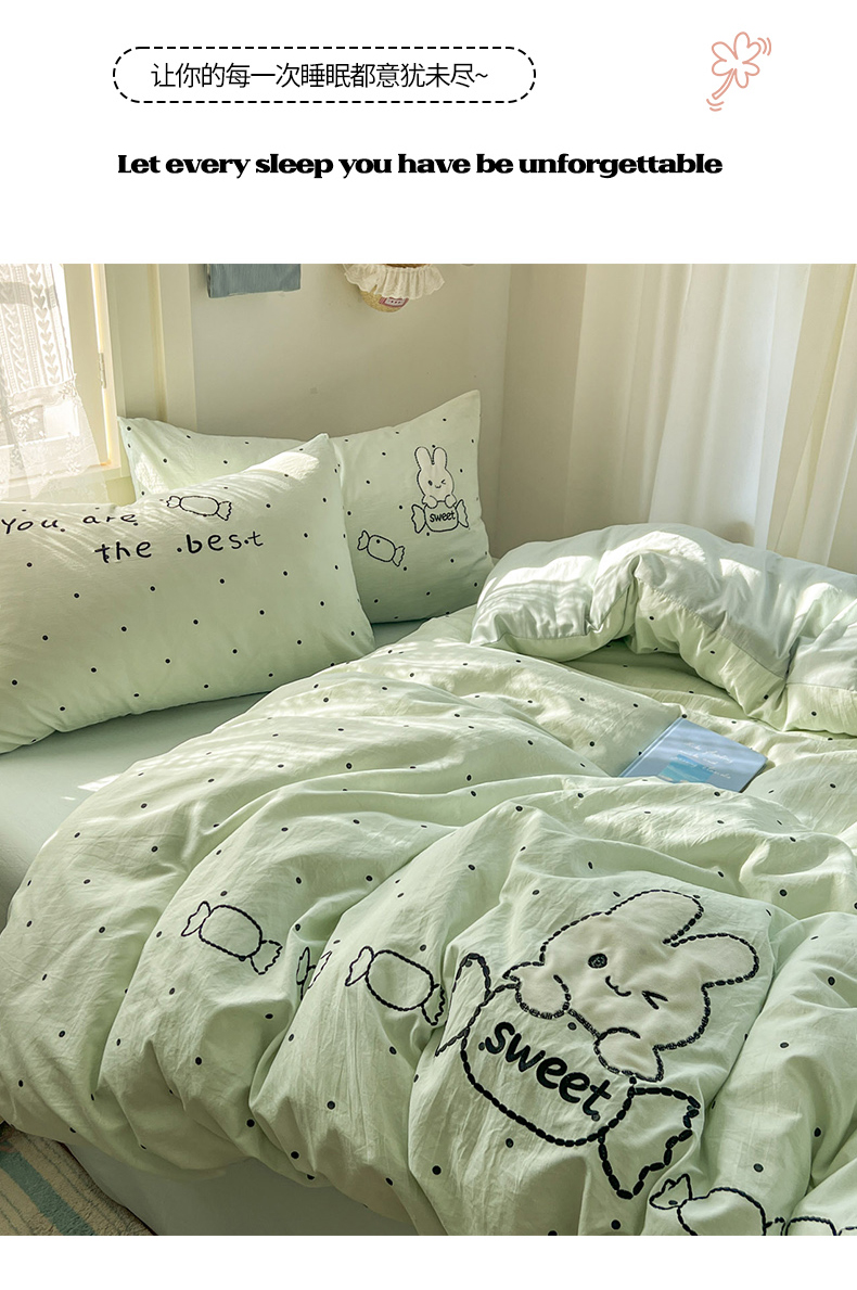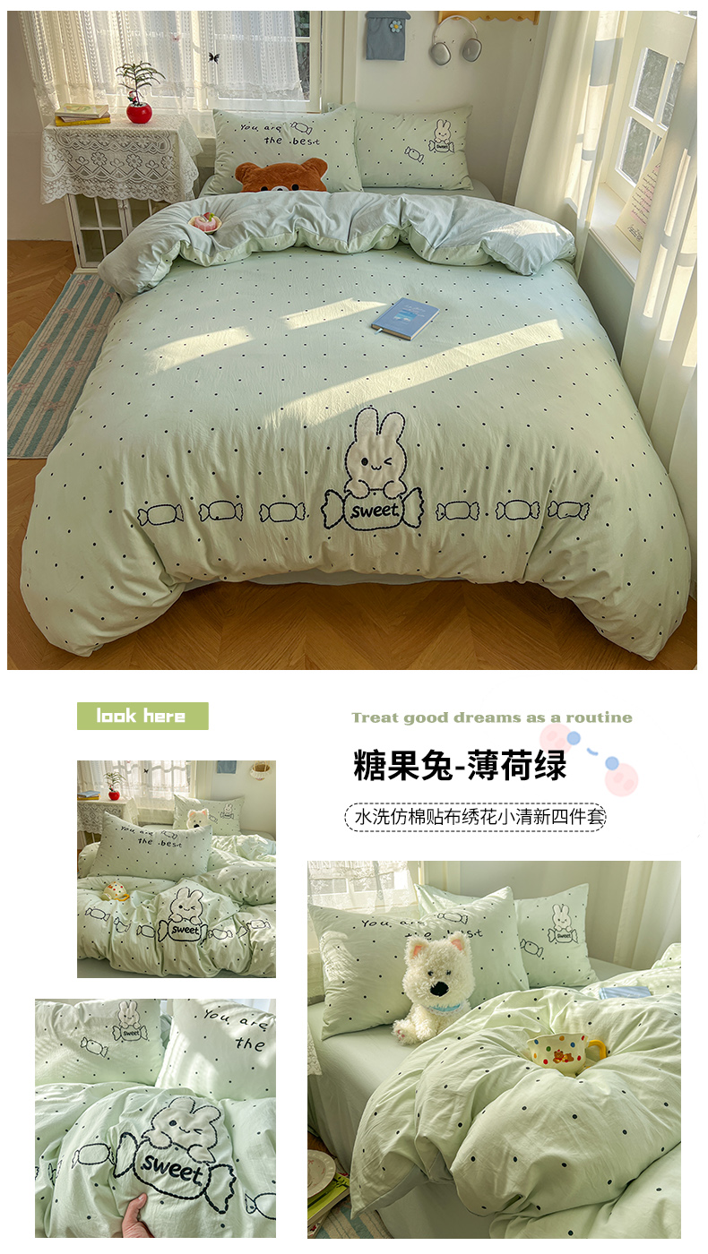当前位置: 91家纺网 > 商品网购 > 床品套件 > 四件套 > 水洗棉四件套 > 贝凯瑞 2026新款仿棉木棉水洗棉绣花ins小清新床裙床单款四件套-糖果兔系列 糖果兔-薄荷绿