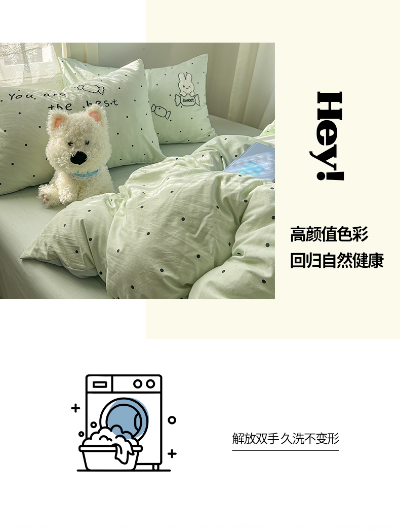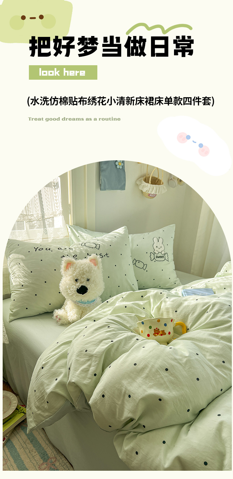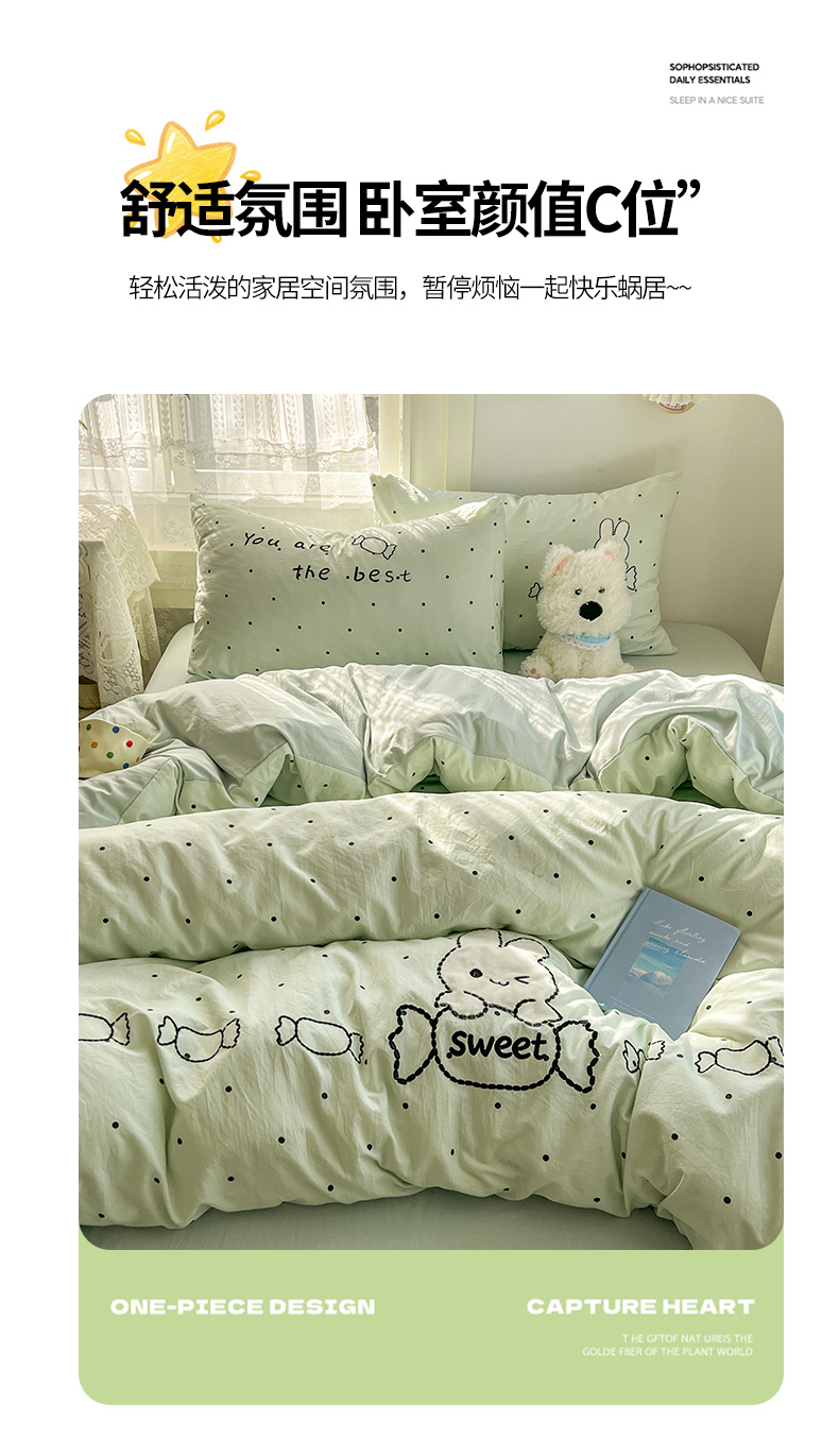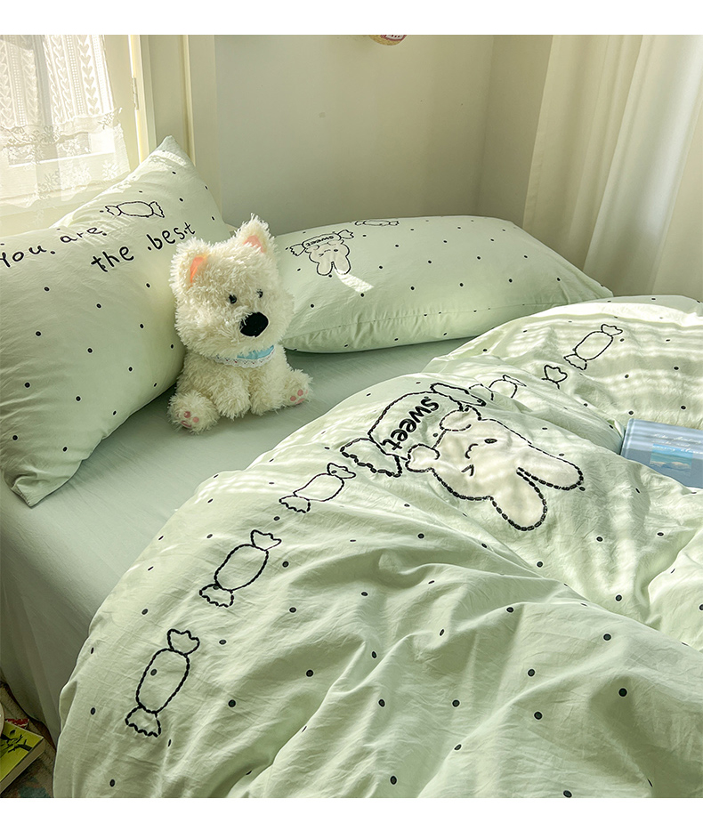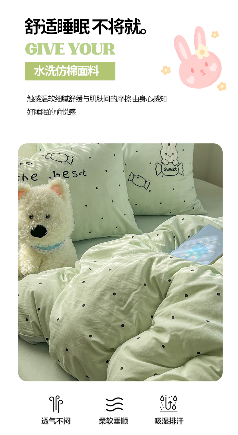当前位置: 91家纺网 > 商品网购 > 床品套件 > 四件套 > 水洗棉四件套 > 贝凯瑞 2026新款仿棉木棉水洗棉绣花ins小清新床裙床单款四件套-糖果兔系列 糖果兔-薄荷绿