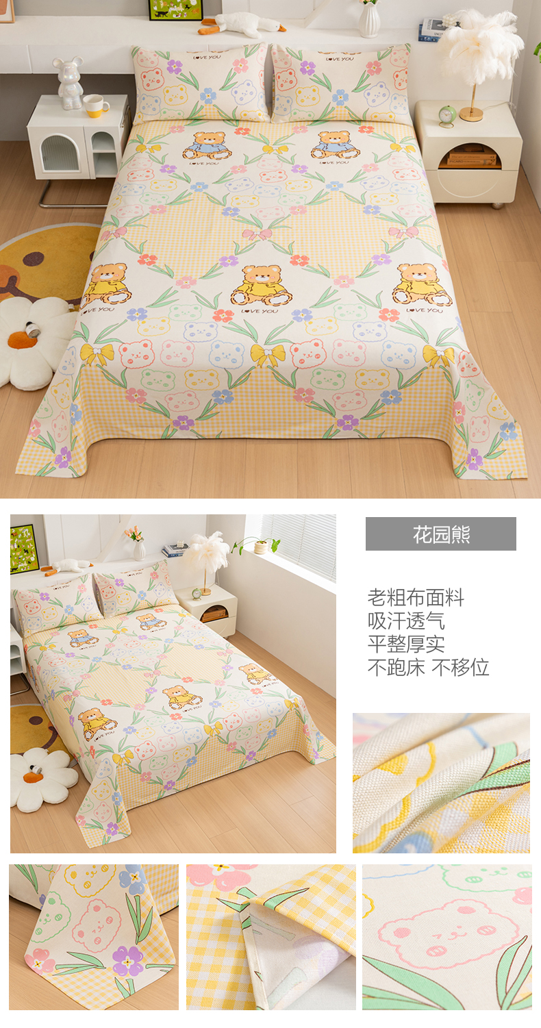 (总)居美良品 2026新款加厚215克老粗布床单卡通花卉可做凉席二三件套,竹趣,爱心花朵,朵朵兔,花园熊,滑板狗,酷酷熊,绿意盎然,莓影缤纷,萌宠乐园,诗意花坊,恬静,童梦乐园,熊猫宝贝,绚丽,幽雅,组合叠拍图仅展示不可下单