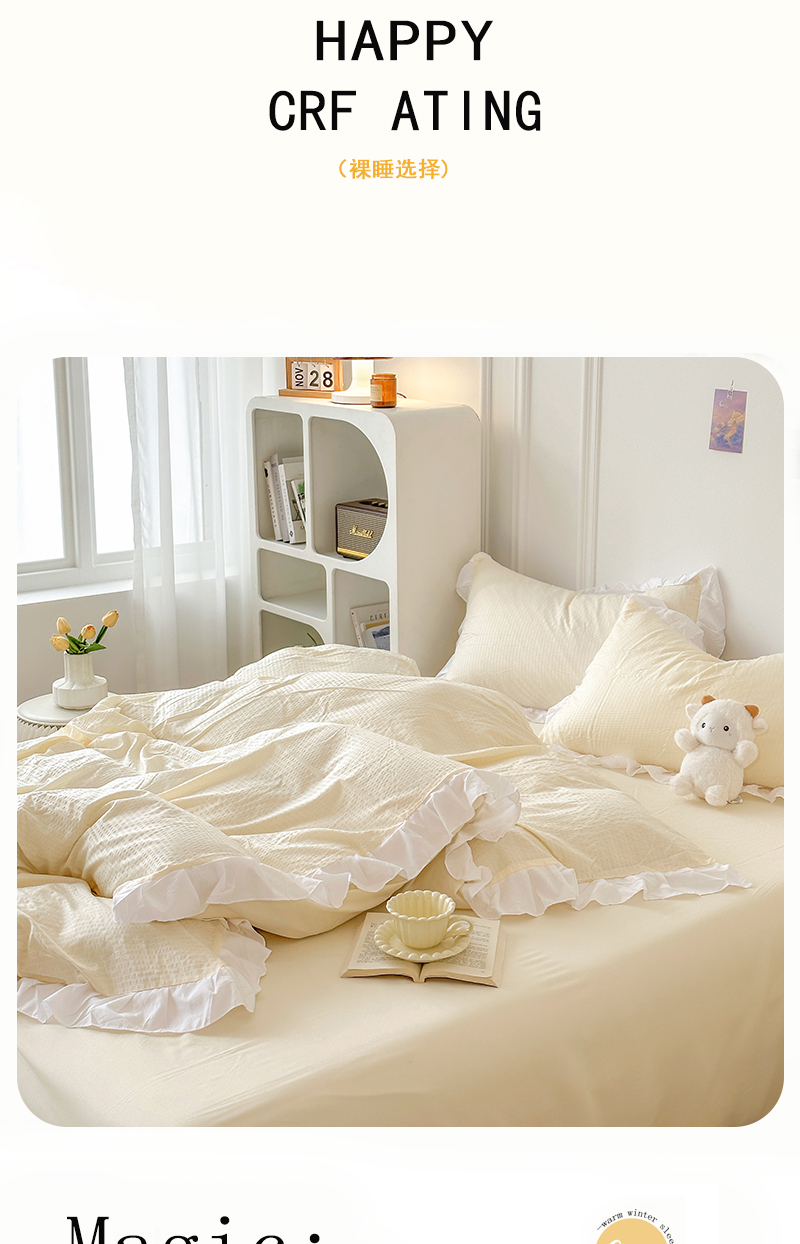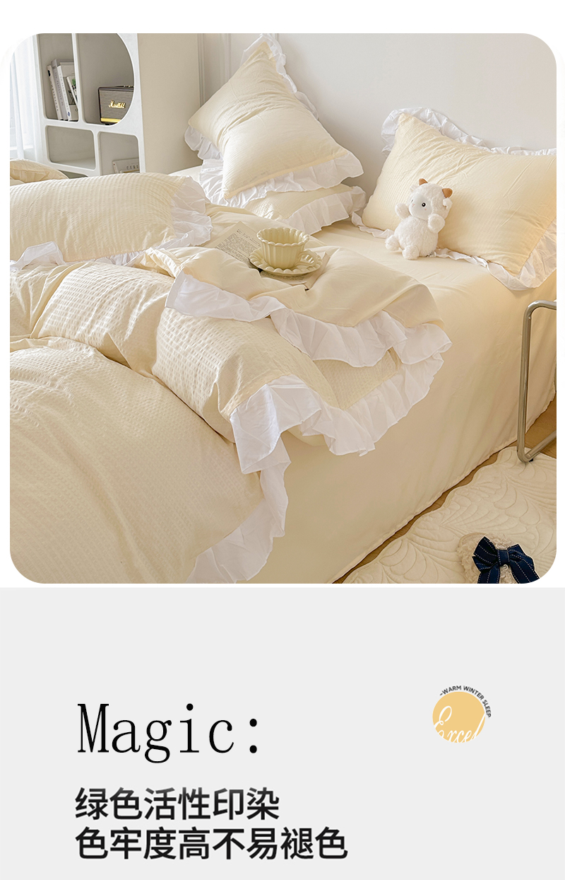 (总)啊雅家居 2026新款轻奢韩式花边华夫格四件套,梦幻粉,梦幻黄,梦幻灰,梦幻兰,梦幻绿