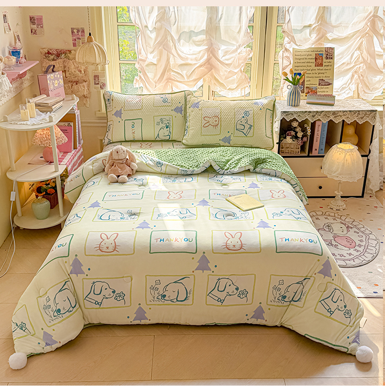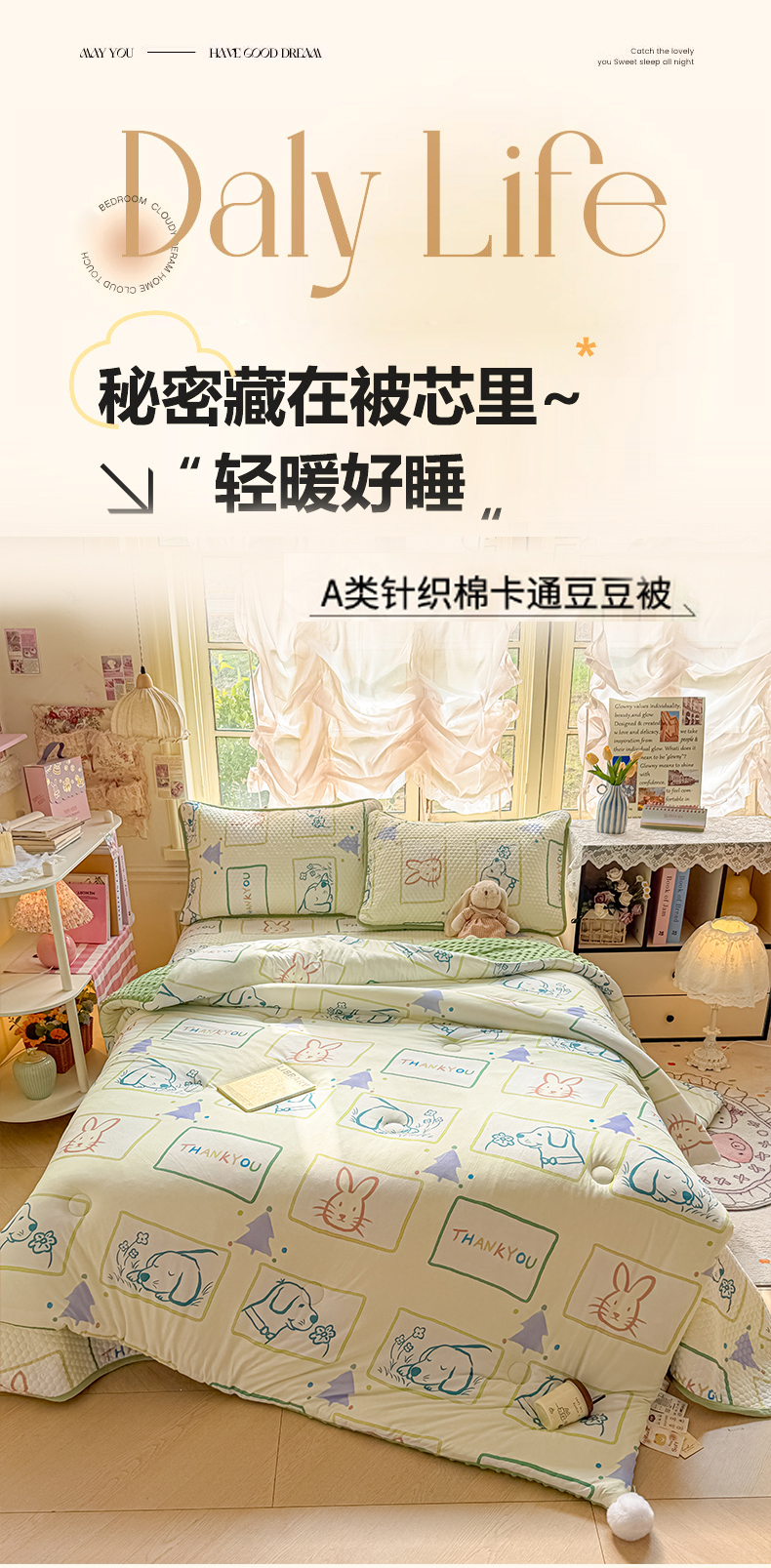 商品名称:宜家坊 2026直播热款A类针织棉豆豆被夏被春秋被空调被儿童学生大版卡通被子被芯 叠拍组合图