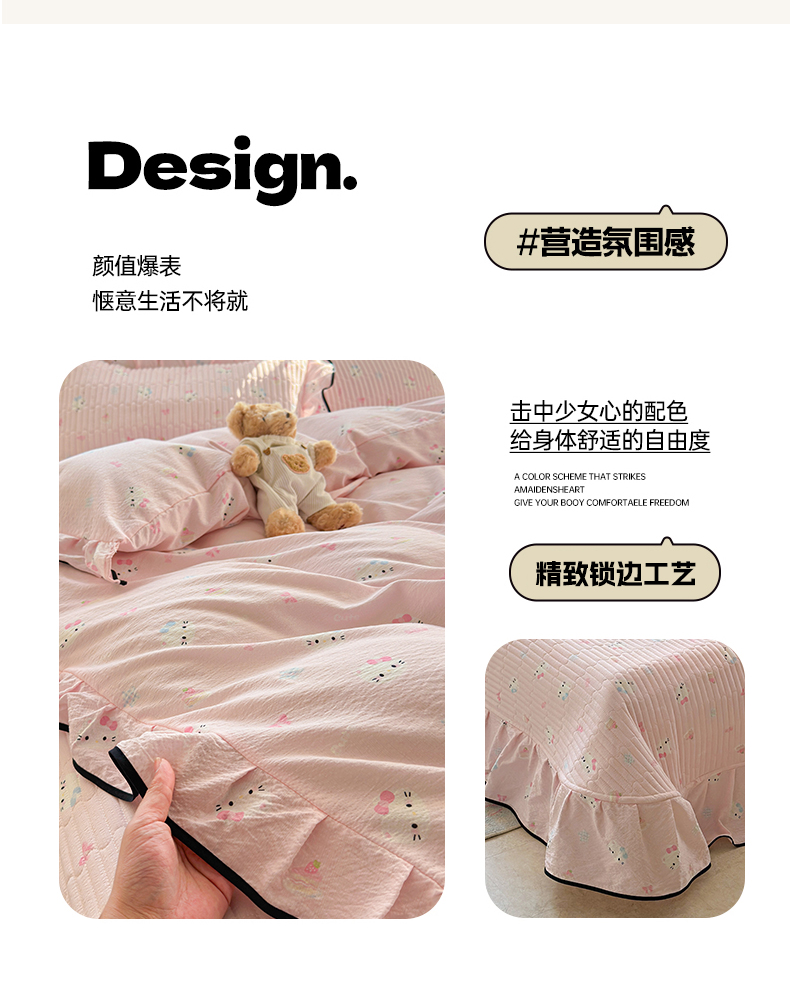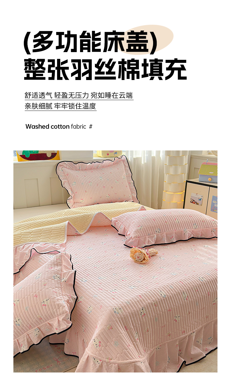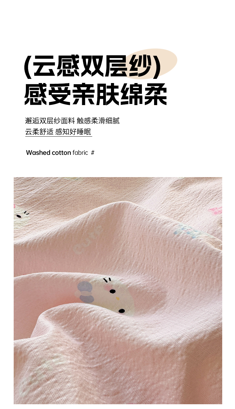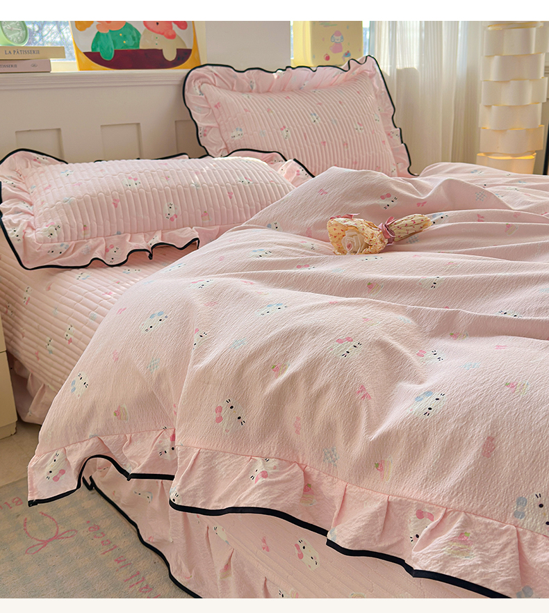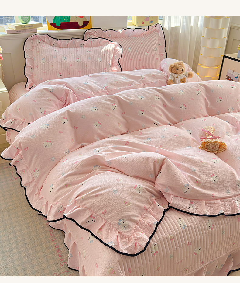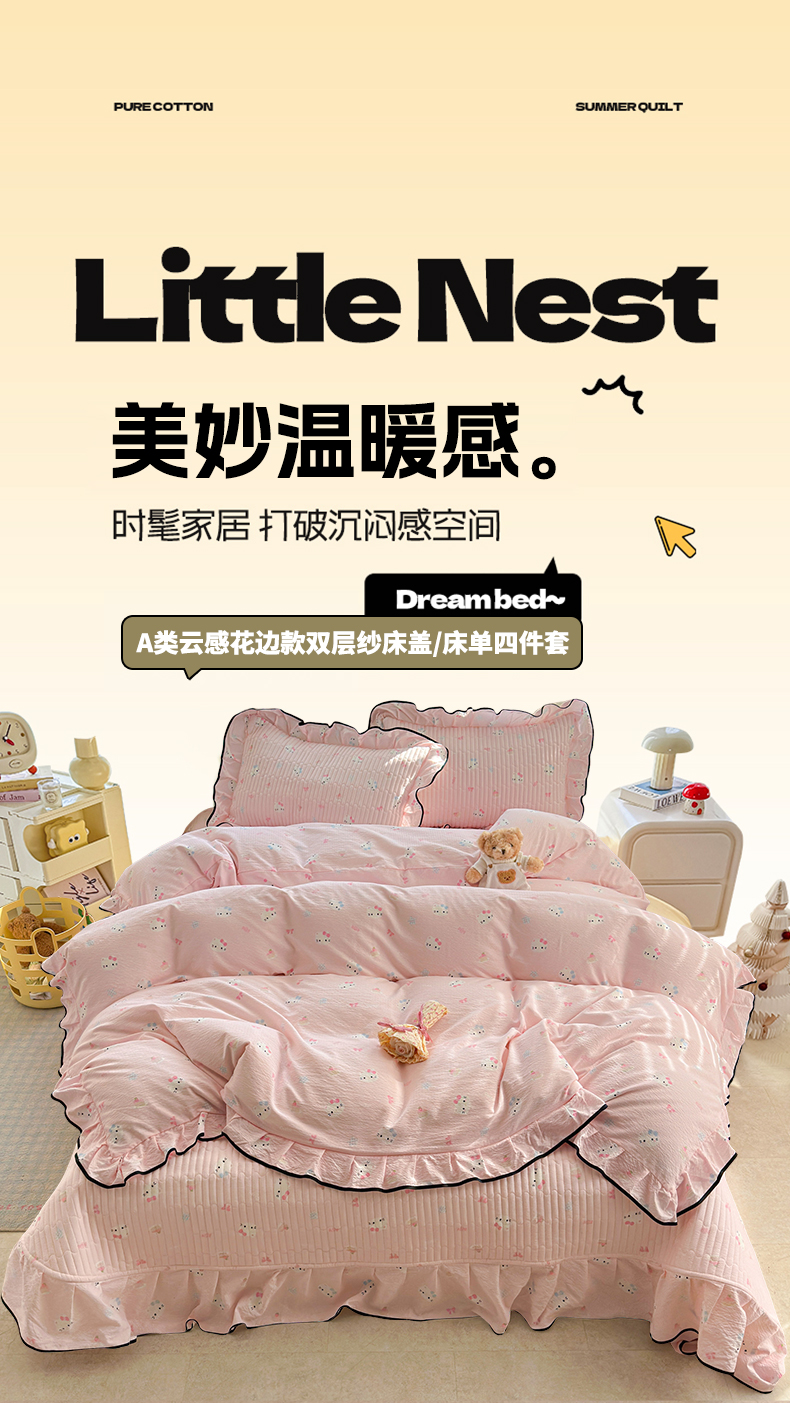 当前位置: 91家纺网 > 商品网购 > 床品套件 > 四件套 > 其它四件套 > 壹和 2026新款A类云感花边款双层纱床盖款和床单款四件套单床盖单被套 粉雾猫咪