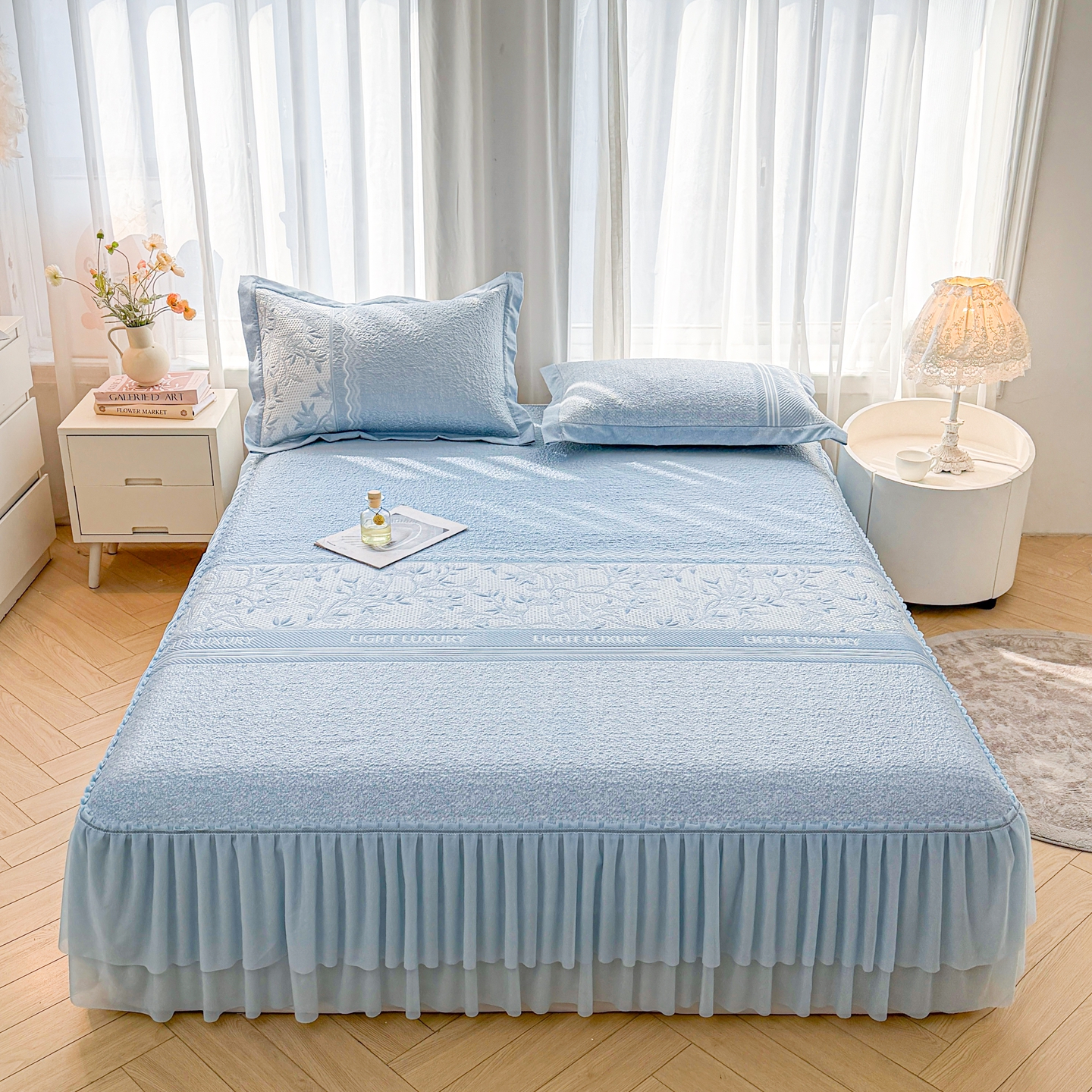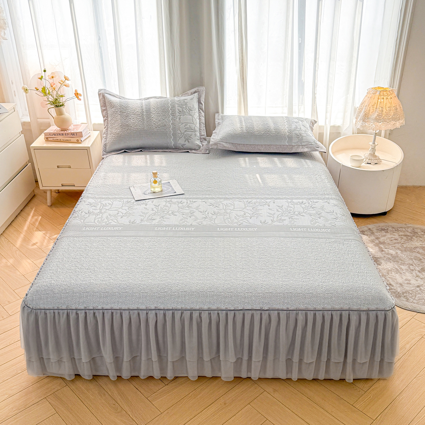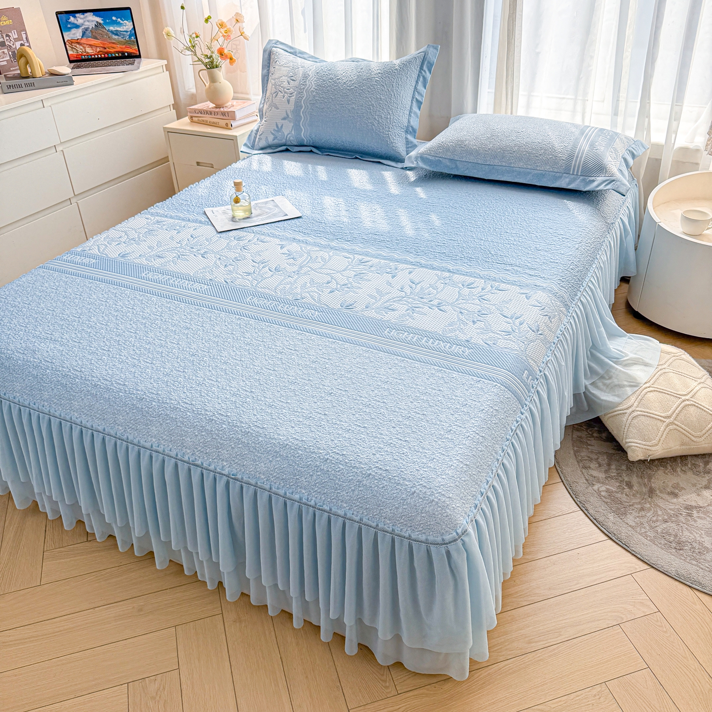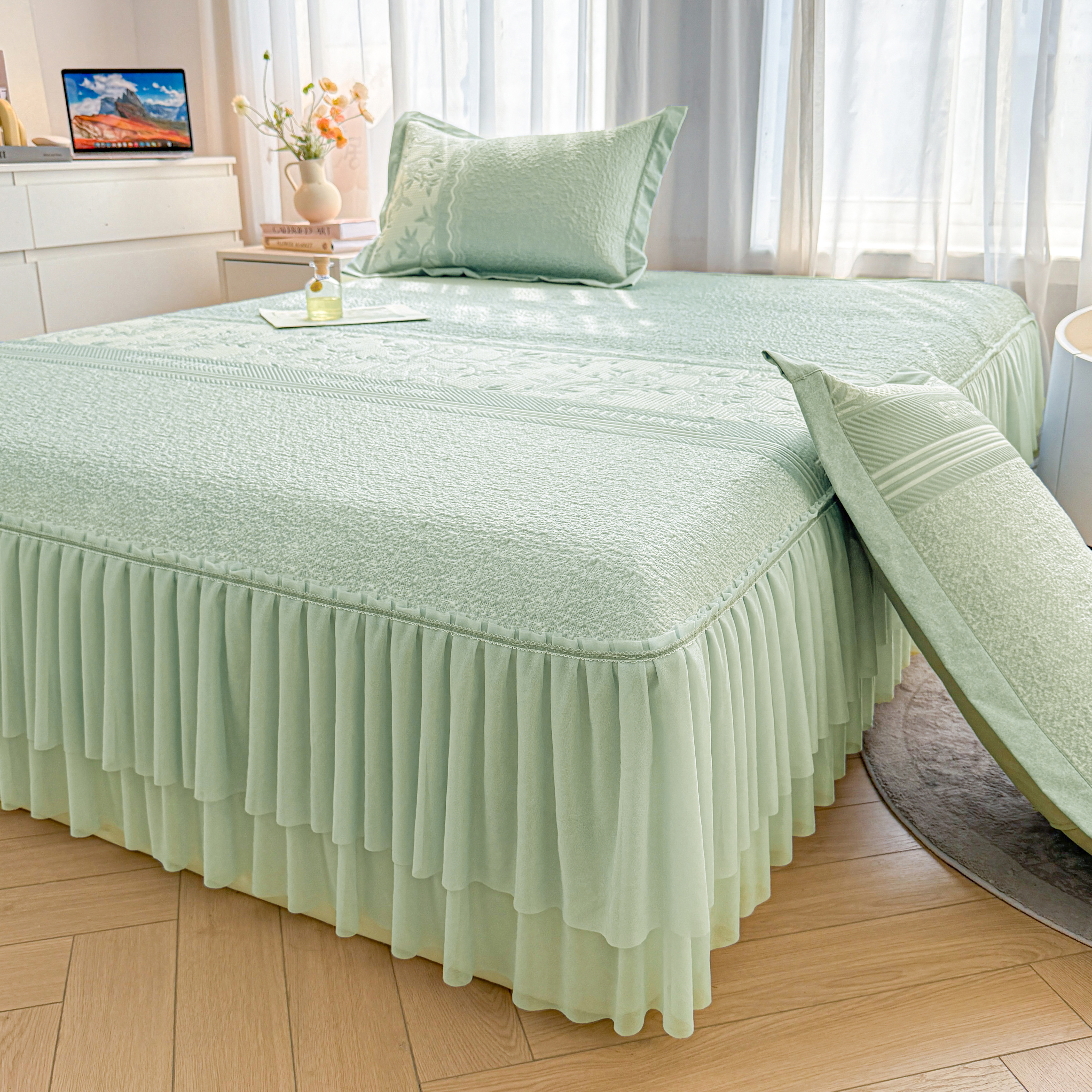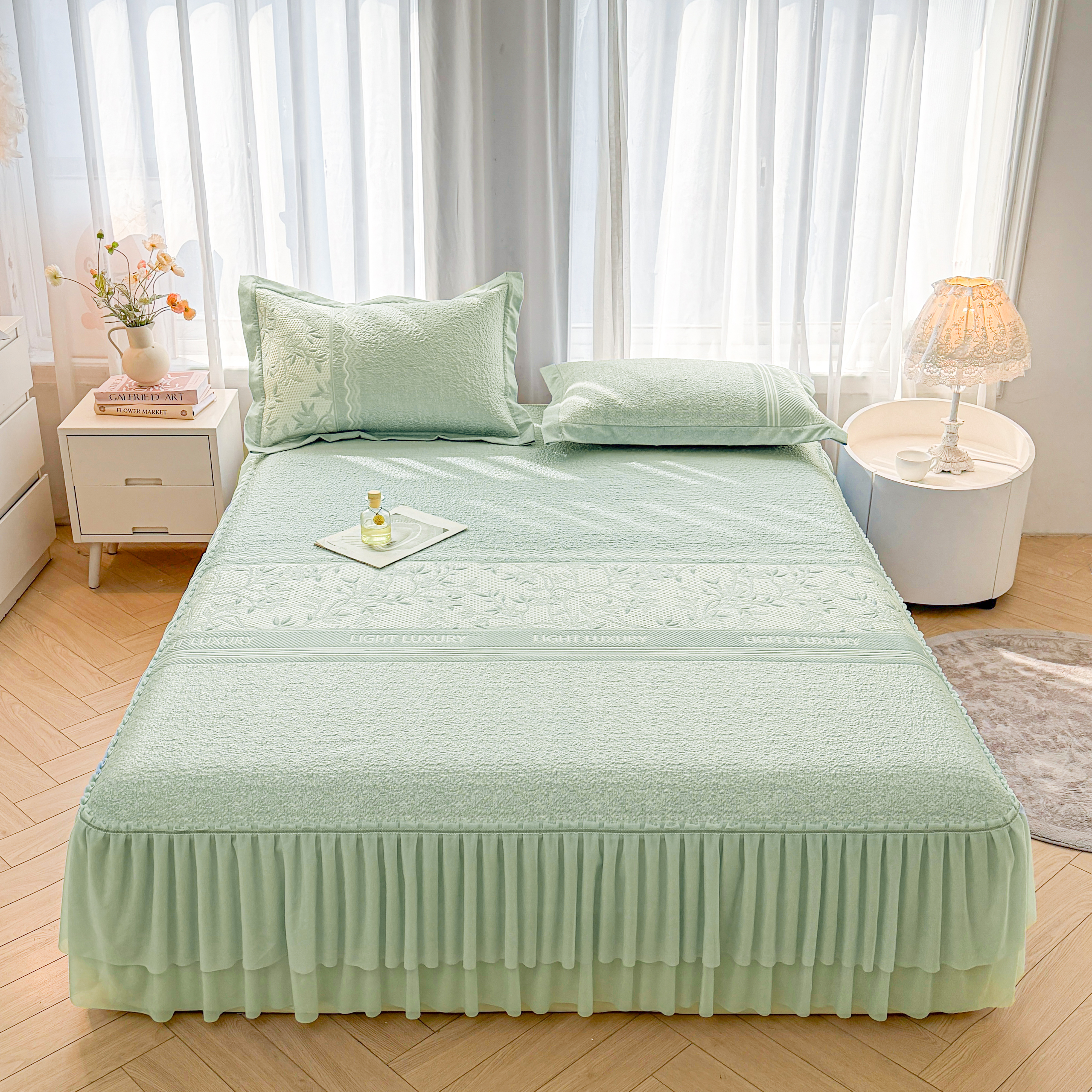商品名称:(总)席都凉席工厂店 2026年轻奢高克重豆豆凉席夏季凉感冰丝提花床裙款三件套-奢序