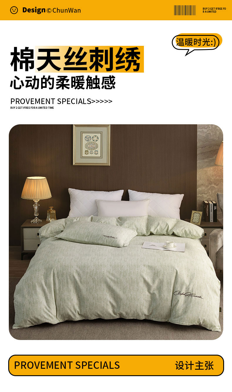 (总)春皖家纺 2026春夏新款天丝棉刺绣四件套,宝绮蓝,亮绮黄,曼妮-贝壳色,曼妮-绿萝纱,曼妮-云褐色,曼妮-紫,苔绮绿,钛绮灰,樱绮丝