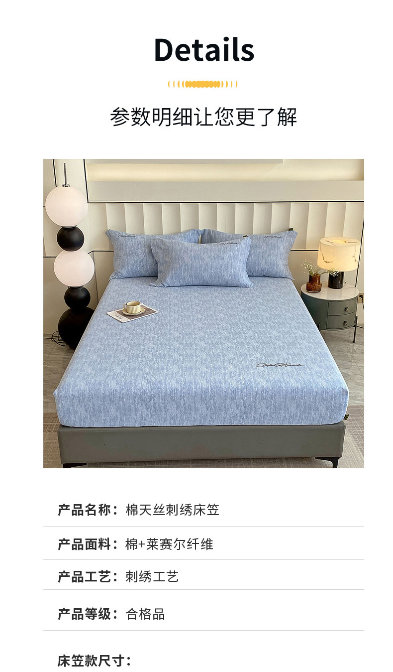 商品名称:春皖家纺 2026春夏新款天丝棉刺绣单床笠 床笠单件 宝绮蓝