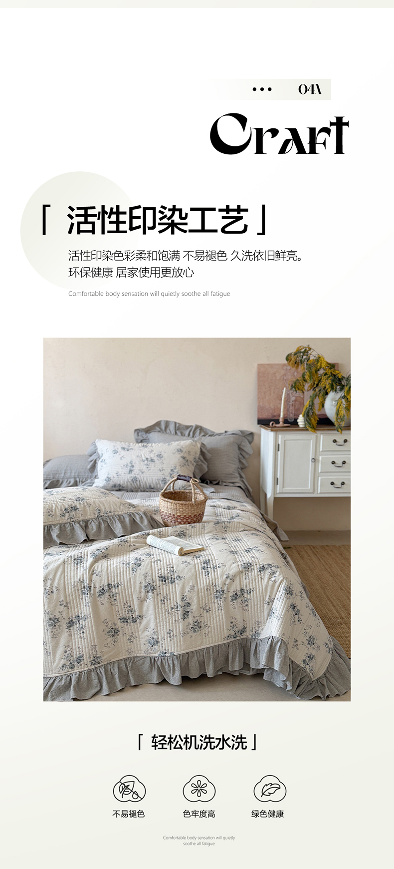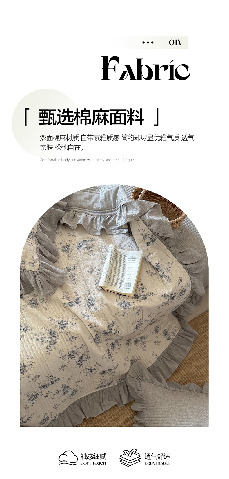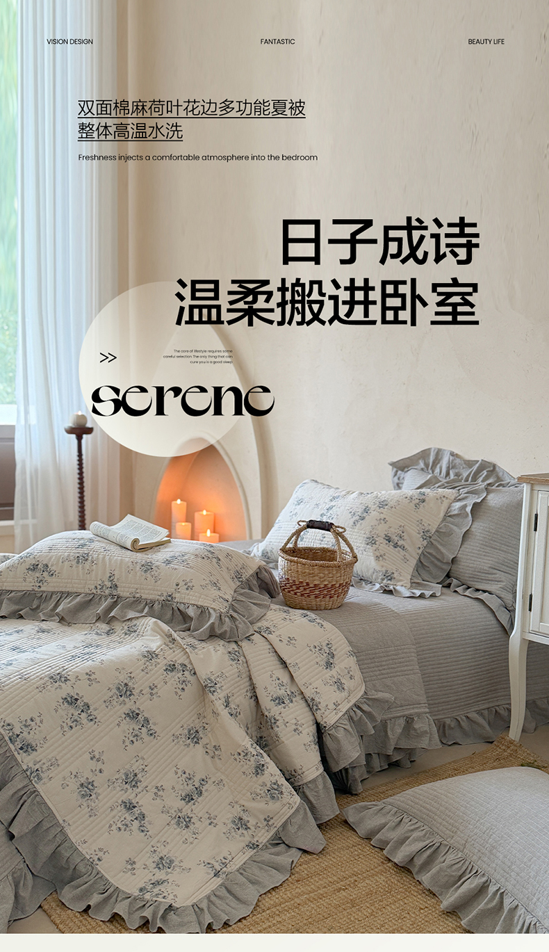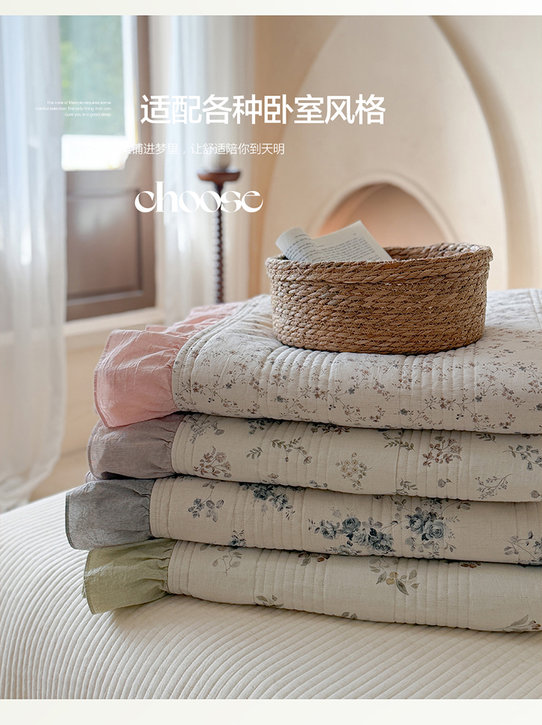 (总)漫调家纺 2026春夏新品双面棉麻法式荷叶边高温水洗夏被可配夏被四件套床单床盖四件套(夏被四件套咨询微信),粉雾花甸,蓝雾花影,奶杏枝蔓,青枝野果,组合