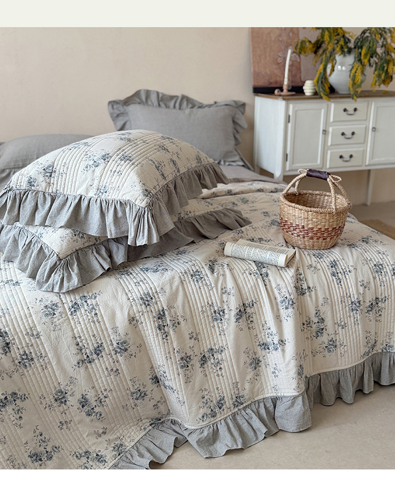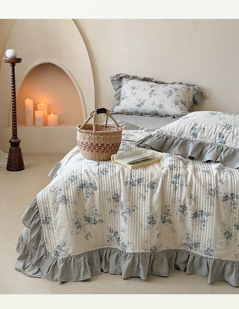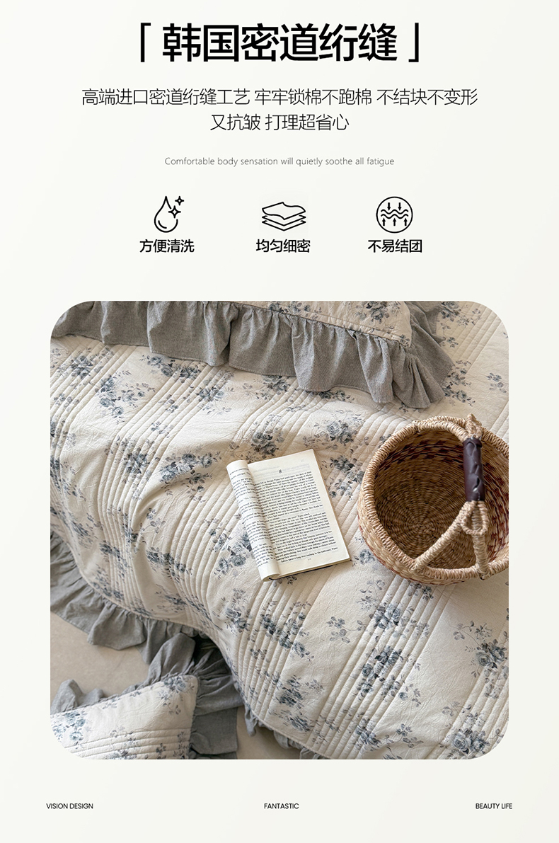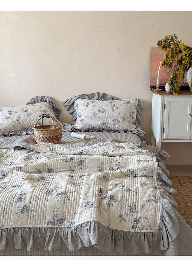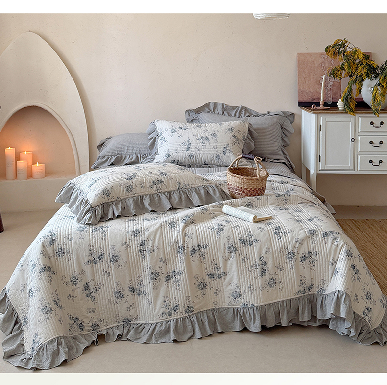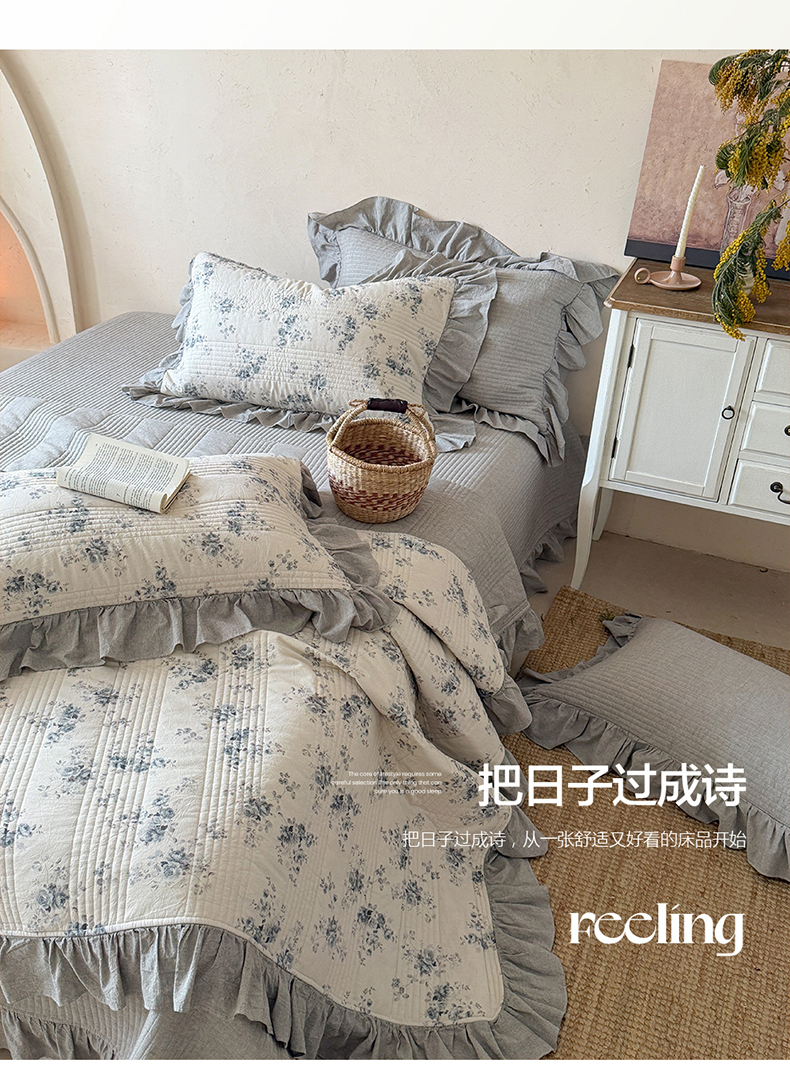 漫调家纺 2026春夏新品双面棉麻法式荷叶边高温水洗夏被可配夏被四件套床单床盖四件套 蓝雾花影