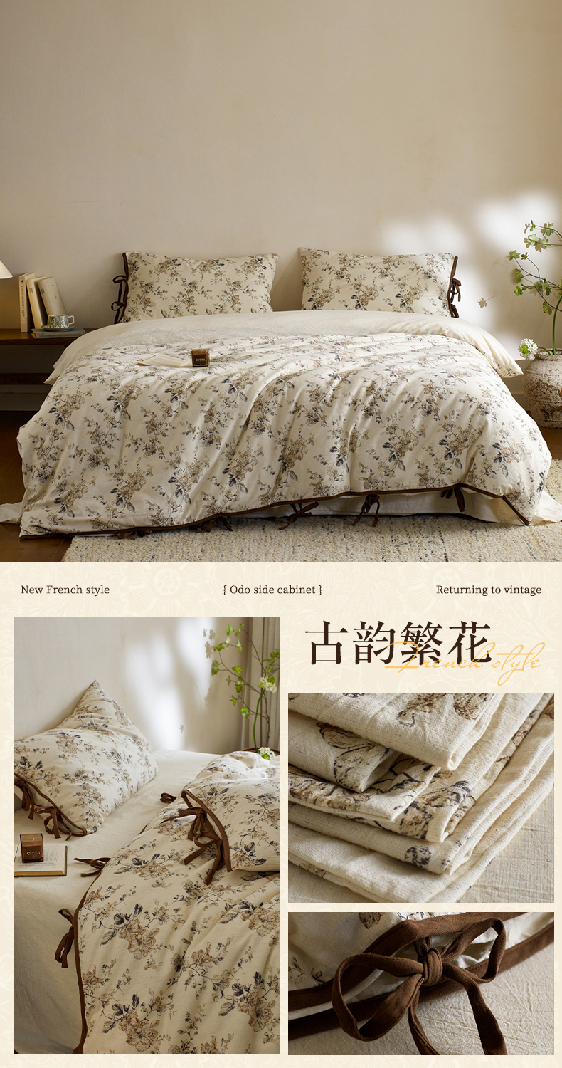 (总)由丽家纺 2026新款法式复古风棉麻绑带款四件套,古韵繁花,春枝红荔,黑绒花,剪影-白,剪影-绿,绿野仙踪,千幻梦,秀丽春色,雅韵锦花
