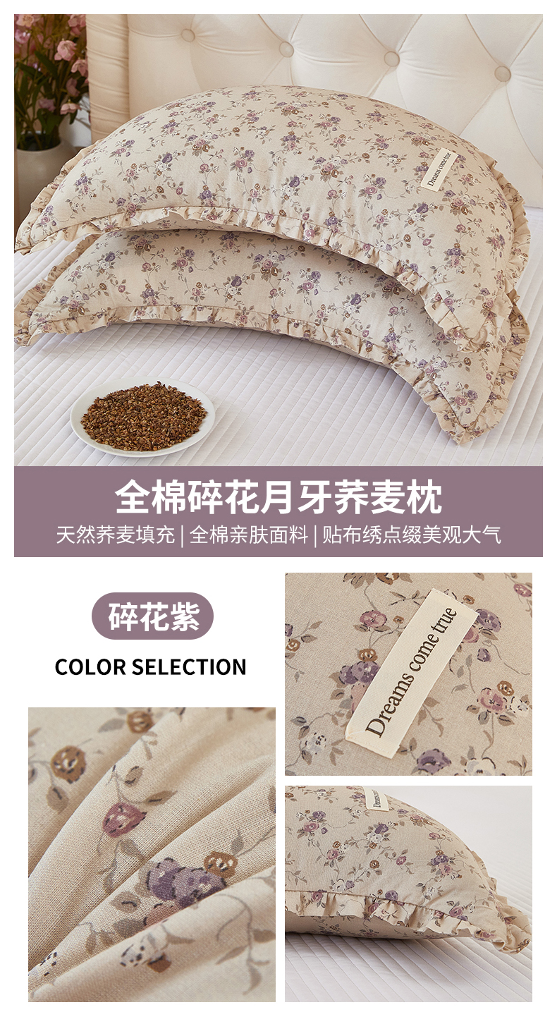 商品名称:梦叶草 2026新款全棉碎花月牙花边荞麦枕 全棉碎花月牙荞麦枕-碎花紫