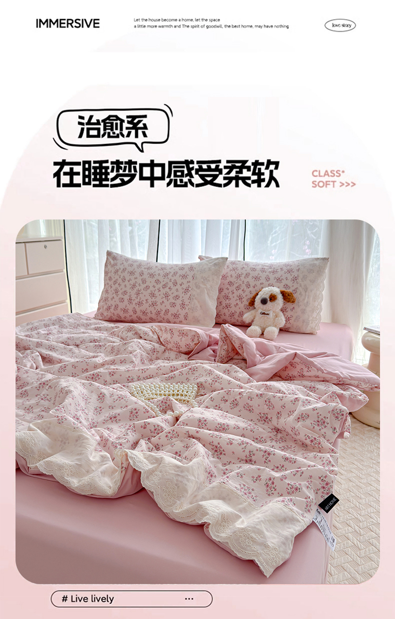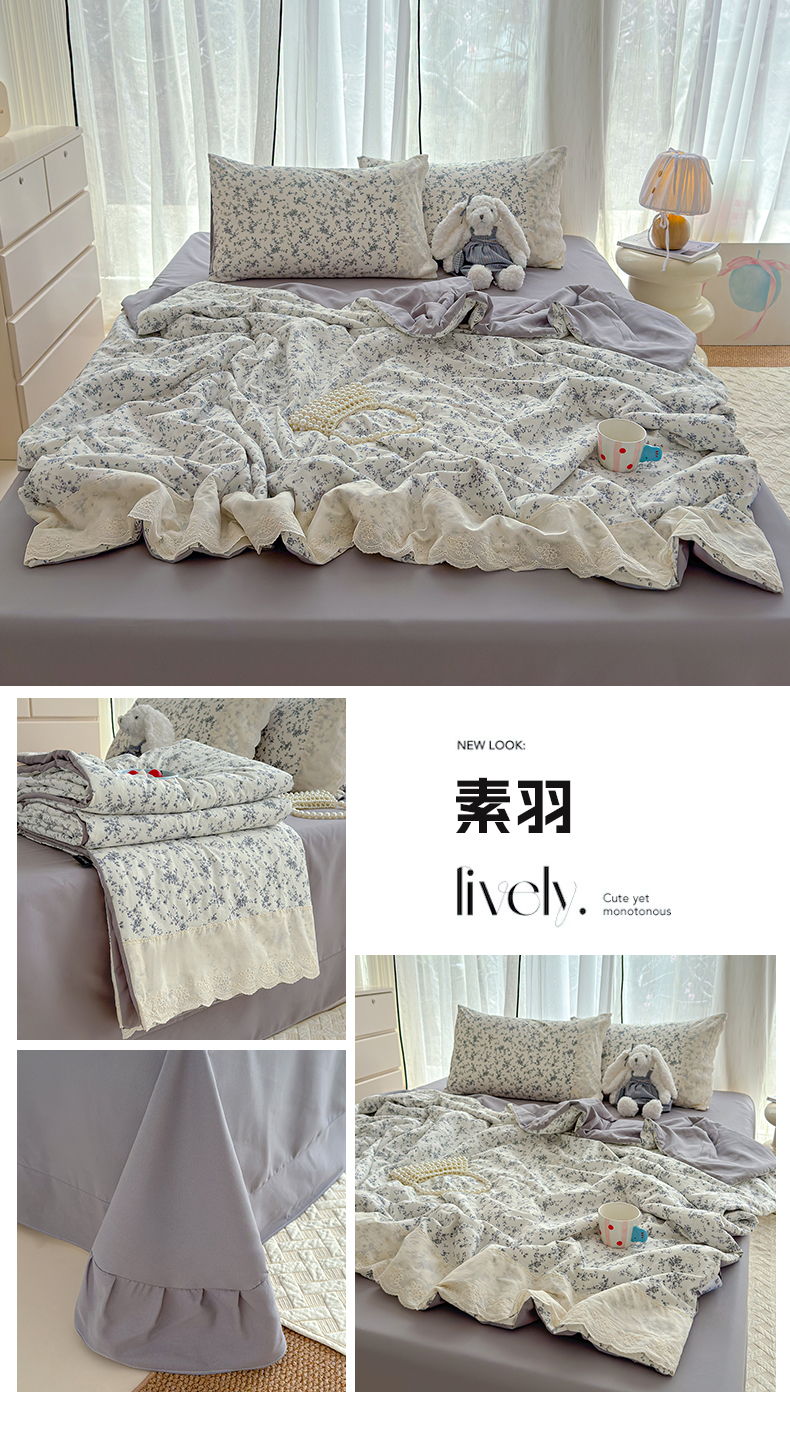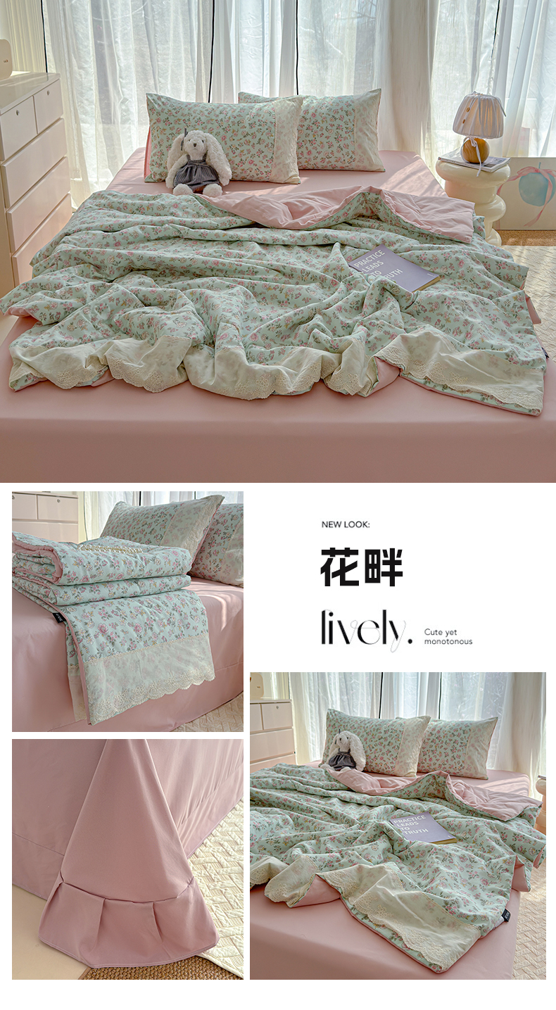 竹合家纺 2026春夏新款古法水洗仿棉云感棉夏被四件套全棉花边印花夏凉被空调被 桃笺