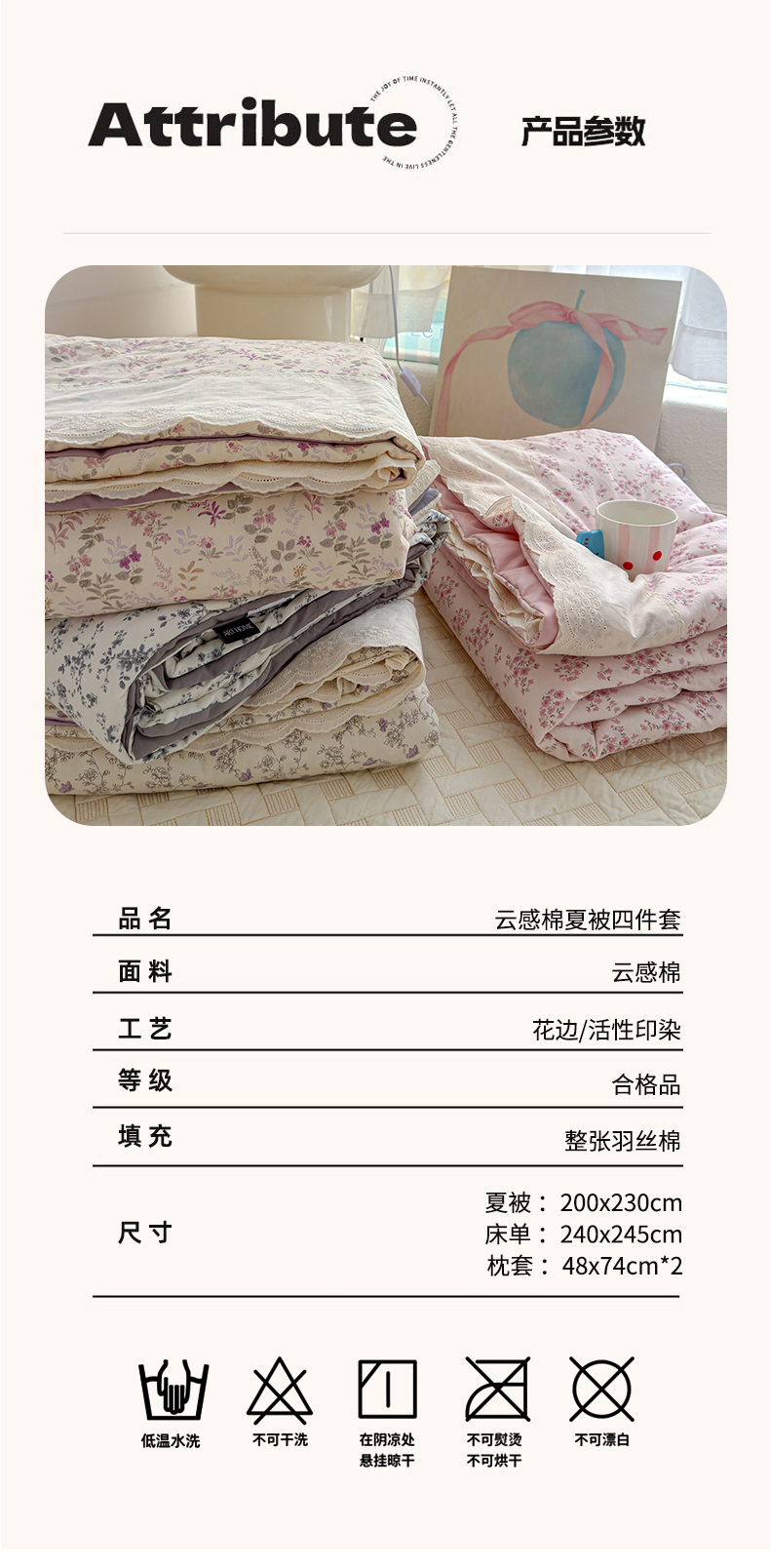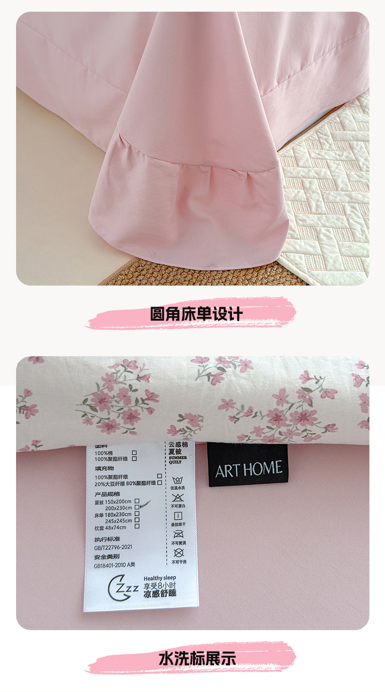 商品名称:竹合家纺 2026春夏新款古法水洗仿棉云感棉夏被四件套全棉花边印花夏凉被空调被 桃笺