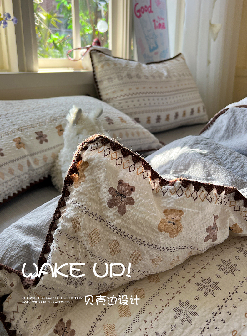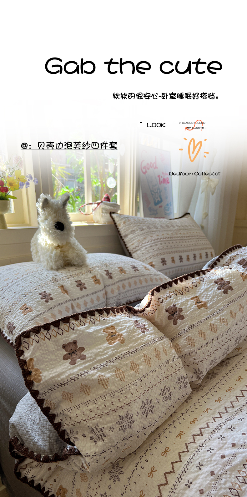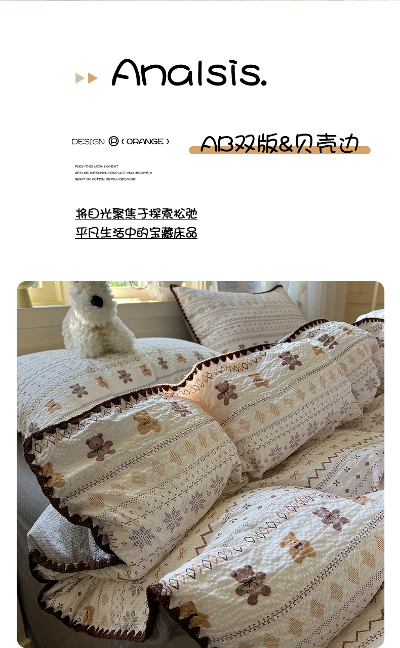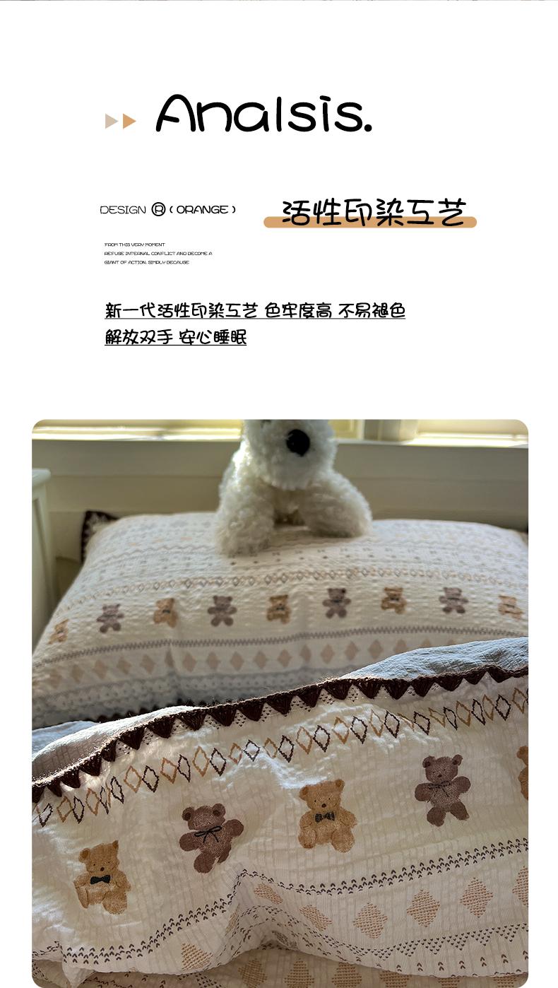 当前位置: 91家纺网 > 商品网购 > 床品套件 > 四件套 > 其它四件套 > 水墨江南 2026新款贝壳边泡芙纱时尚印花四件套 咖啡小熊