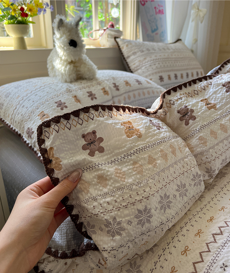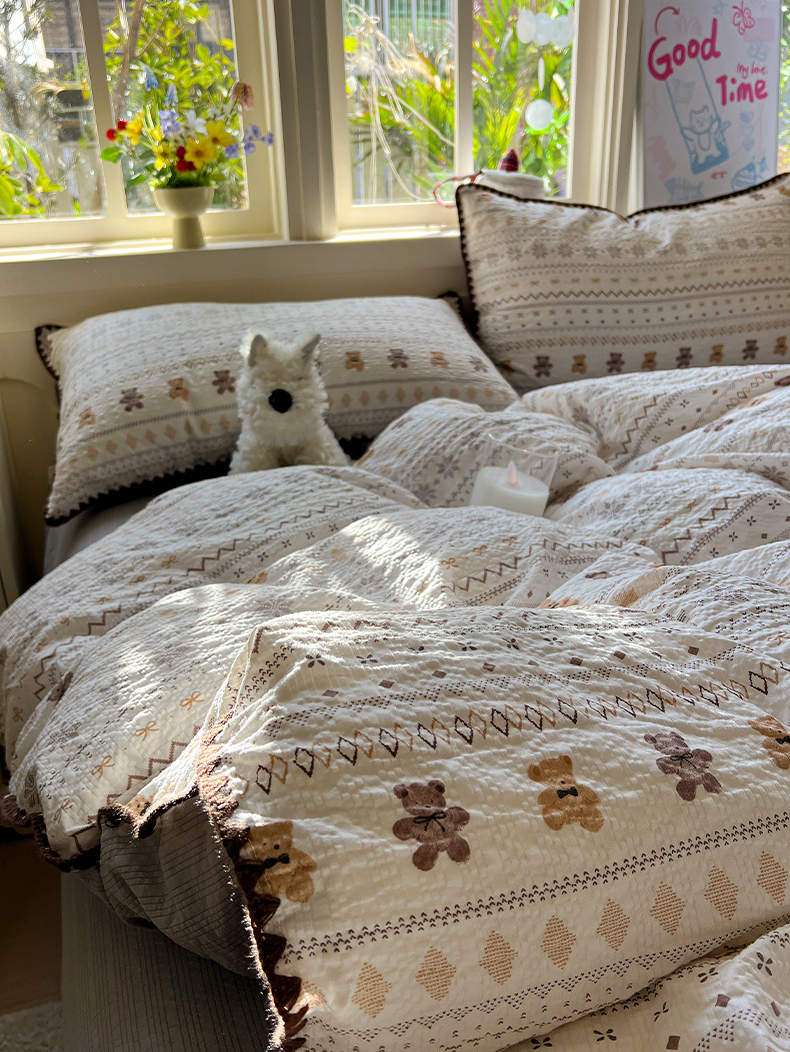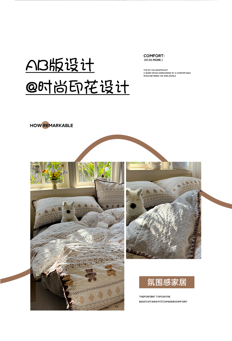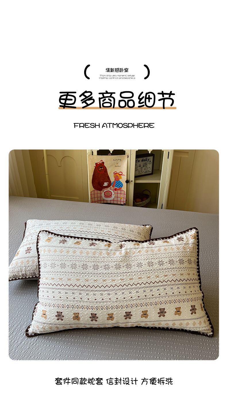 当前位置: 91家纺网 > 商品网购 > 床品套件 > 四件套 > 其它四件套 > 水墨江南 2026新款贝壳边泡芙纱时尚印花四件套 咖啡小熊