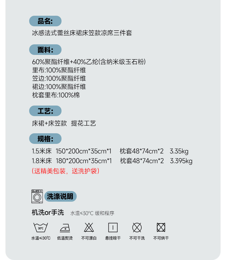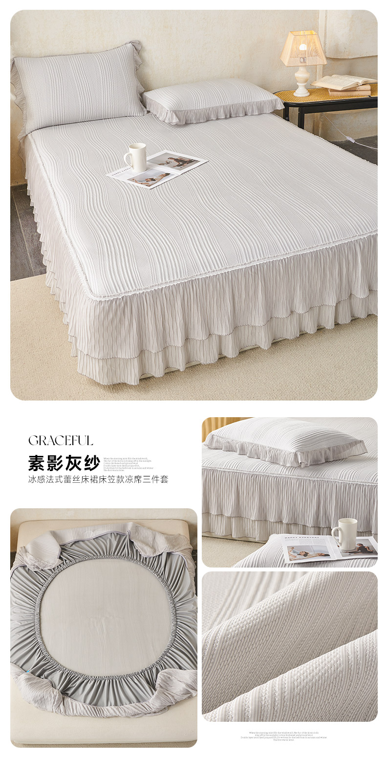 商品名称:桂雅居 2026新款高分子冰感蕾丝床裙床笠款凉席三件套 素影灰纱