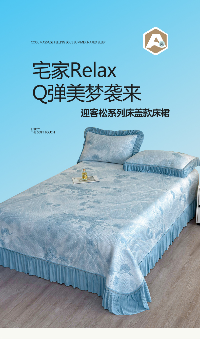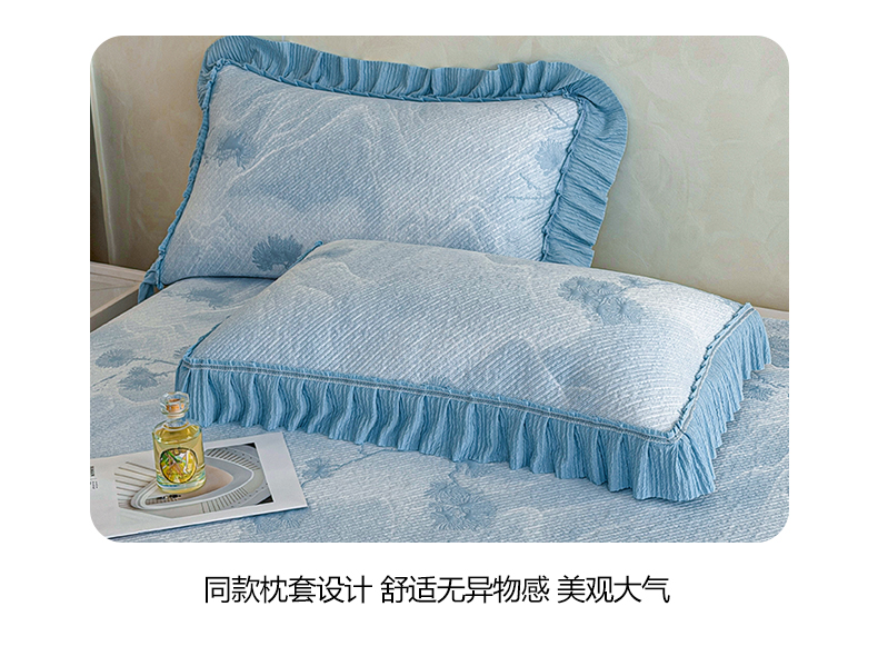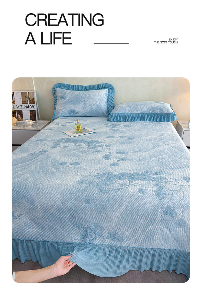商品名称:(总)慕木家纺 2026新款A类乙纶双面提花560克冰豆豆花边床盖款床裙迎客松系列(提供买家秀)