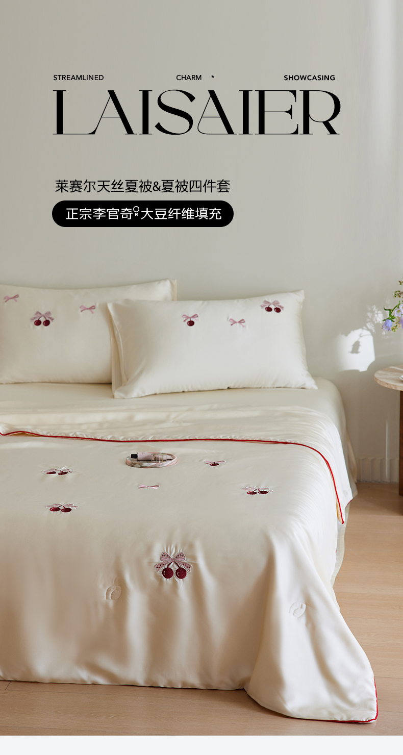 • 91家纺网 家纺一手货源 找家纺 安莱生活 2026新款50莱赛尔天丝夏被夏凉被空调被四件套嵌绳款 蝴蝶结樱桃