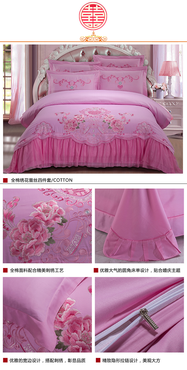 (总)慕她家纺 婚庆四件套大红蕾丝刺绣全棉纯棉花蔓喜多