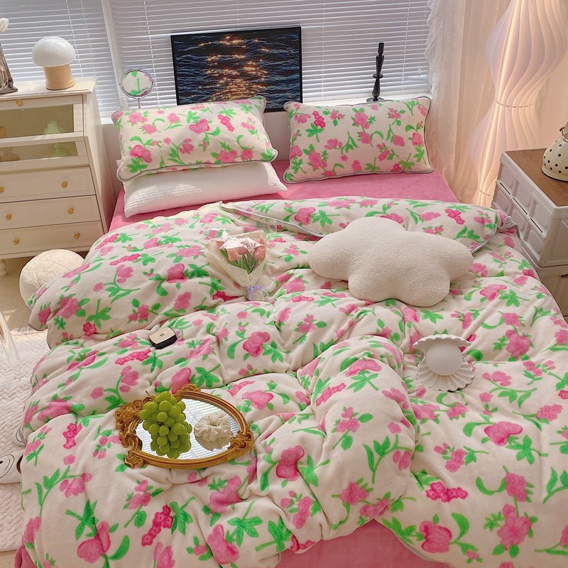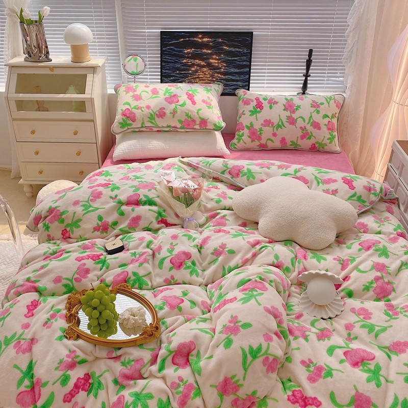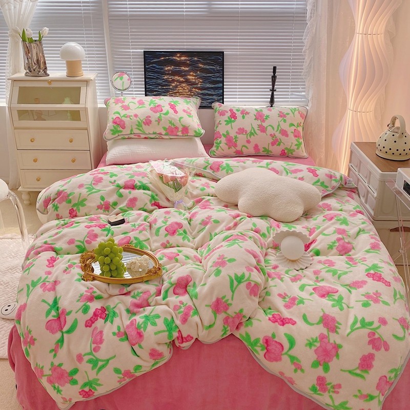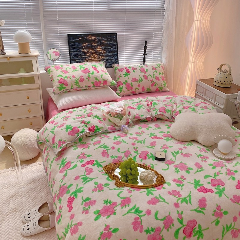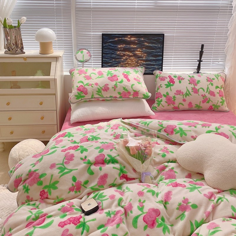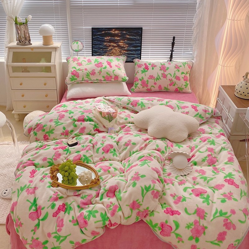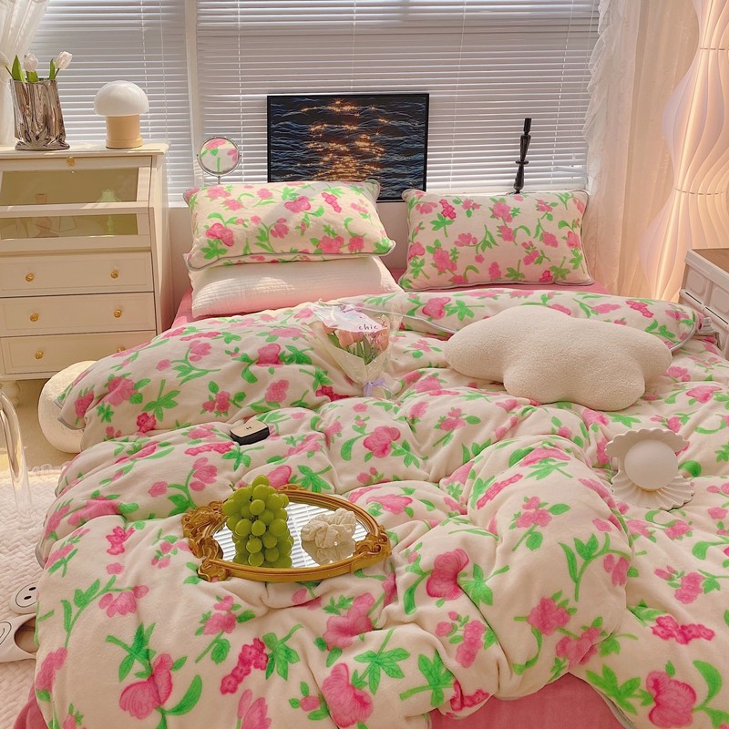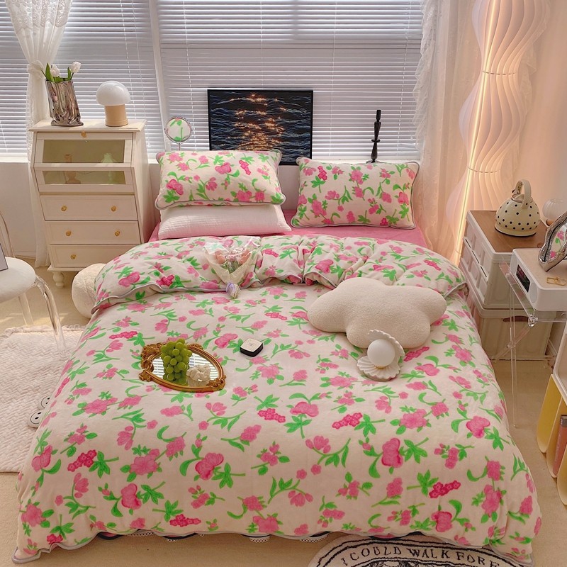 顾里家纺2021新款ins韩国高端保暖牛奶绒四件套春系玫花