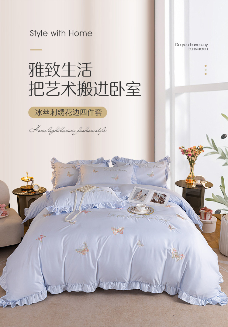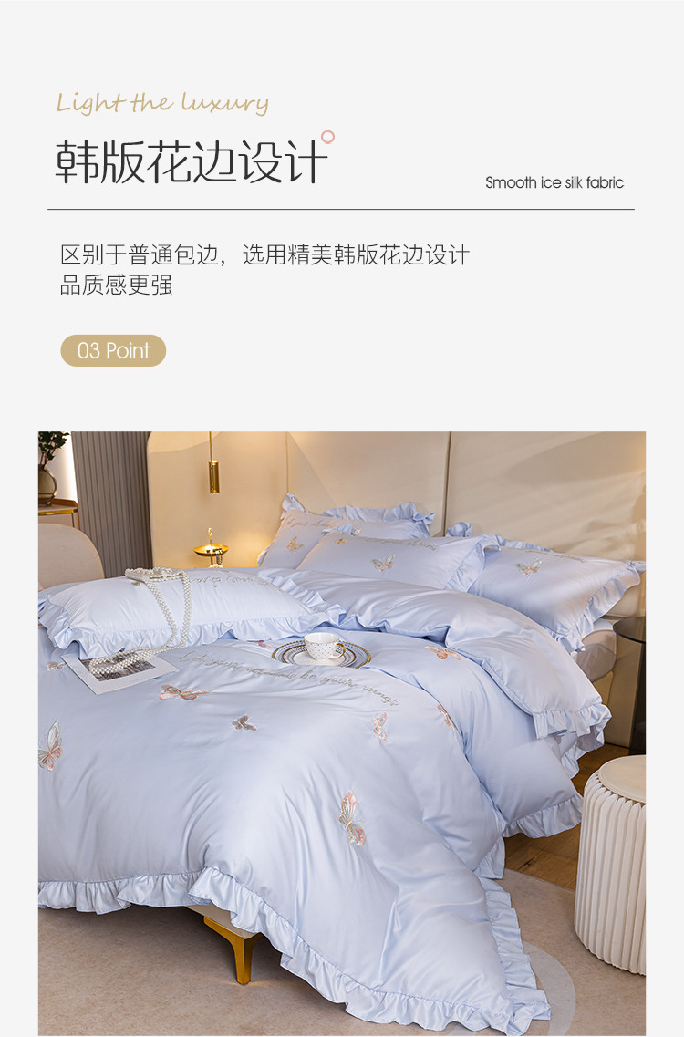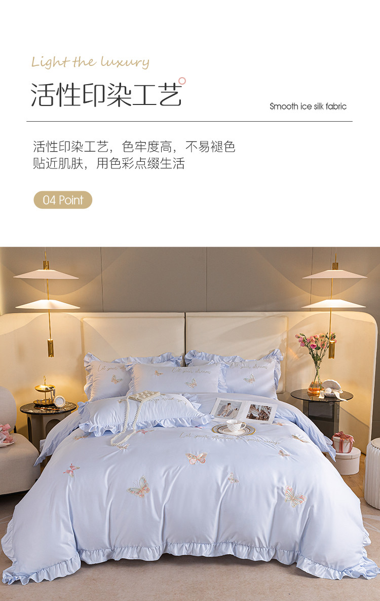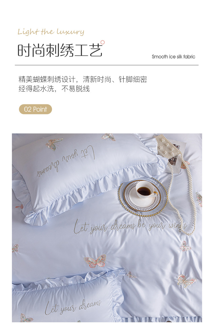 商品名称:理想家家纺 2022新款冰丝刺绣花边蝴蝶四件套 蓝