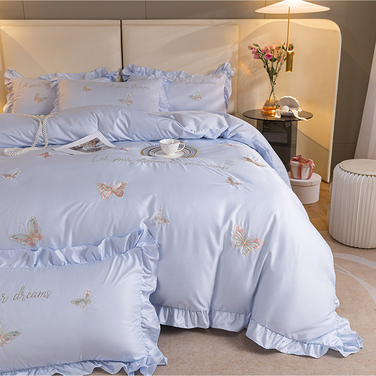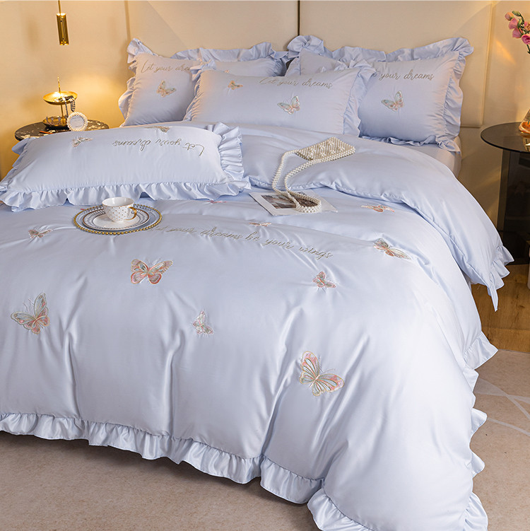 理想家家纺 2022新款冰丝刺绣花边蝴蝶四件套 蓝