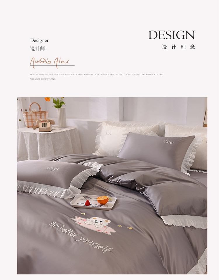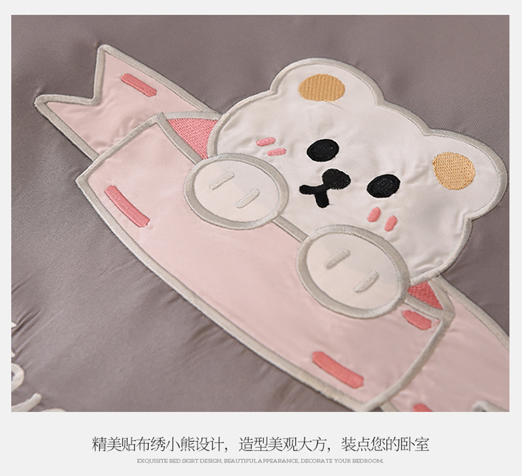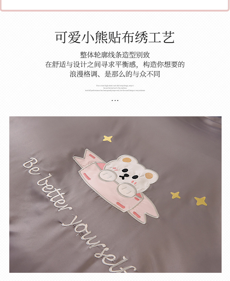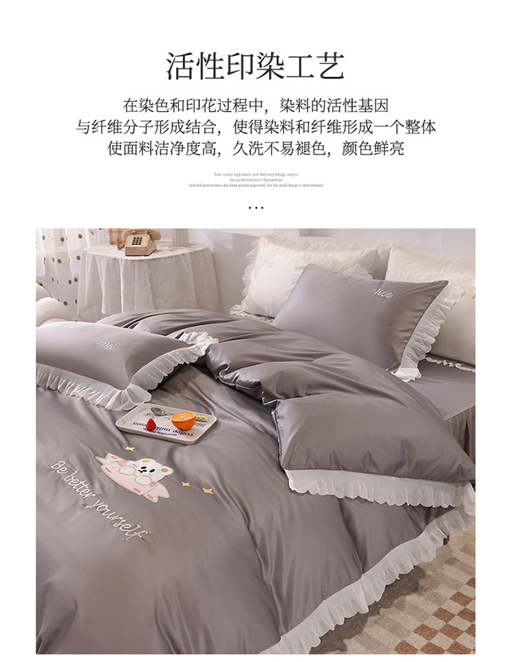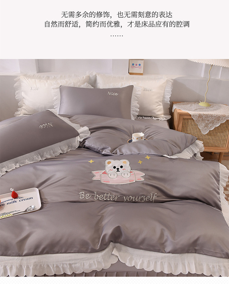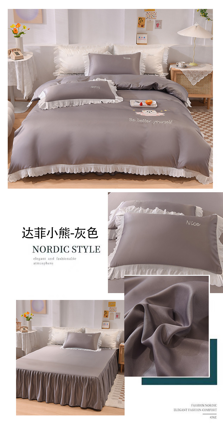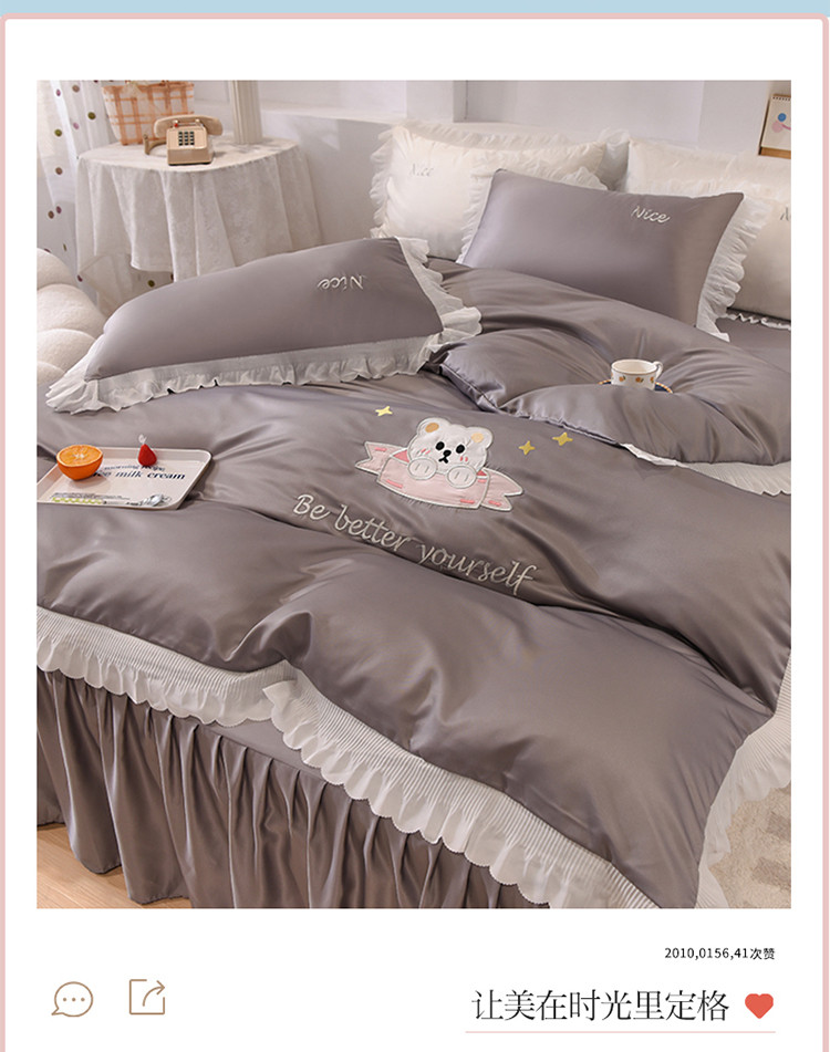 商品名称:艾米家居 2025新款水洗真丝雪纺花边贴布绣四件套-达菲小熊 灰色