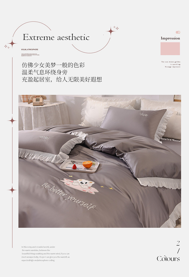 总艾米家居2025新款水洗真丝雪纺花边贴布绣四件套-达菲小熊,白色,薄荷绿,宾利蓝,淡粉,豆沙,鹅黄,灰色,天蓝,香槟,玉色