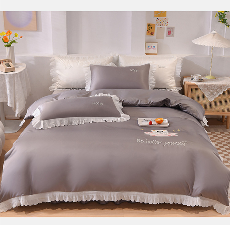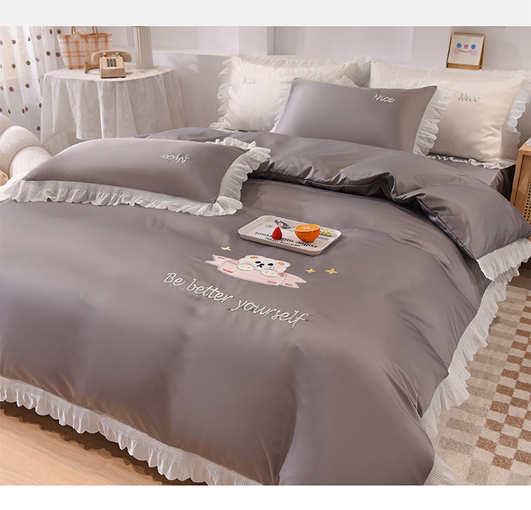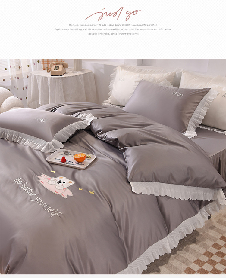 艾米家居 2025新款水洗真丝雪纺花边贴布绣四件套-达菲小熊 灰色