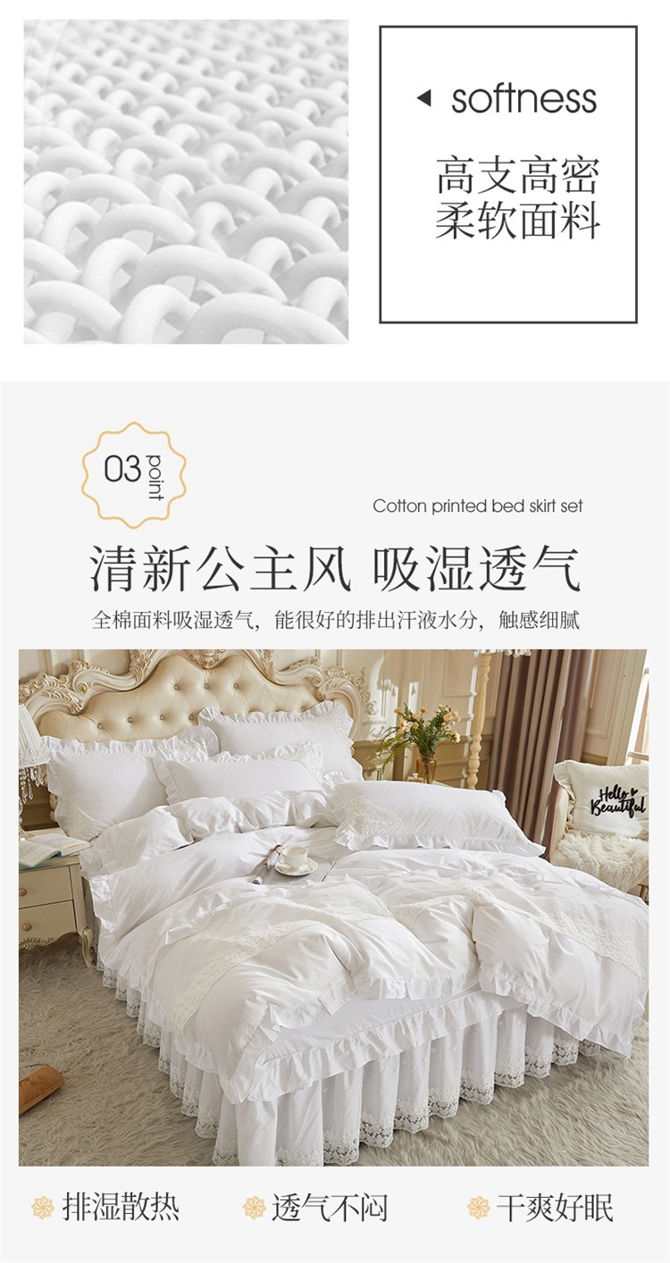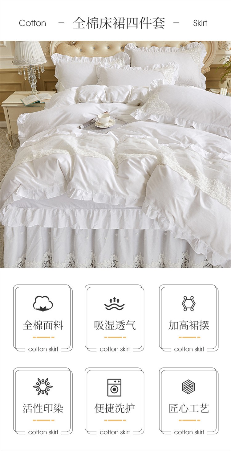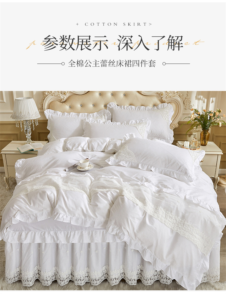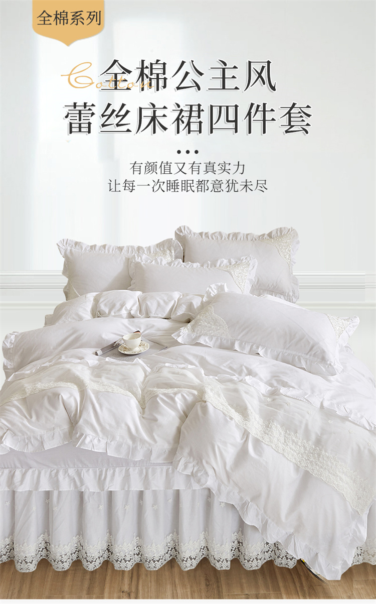 当前位置: 91家纺网 > 商品网购 > 床品套件 > 四件套 > 全棉普通四件套 > 十个点 2022新款纯色全棉公主风蕾丝花边床裙四件套 白色