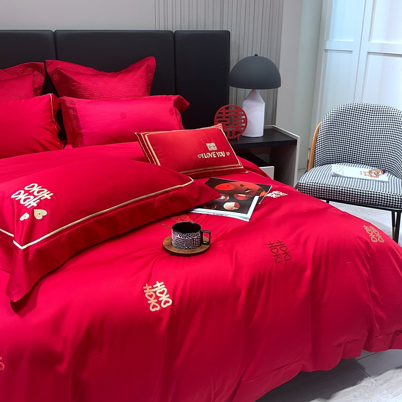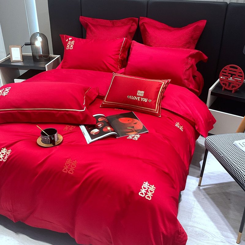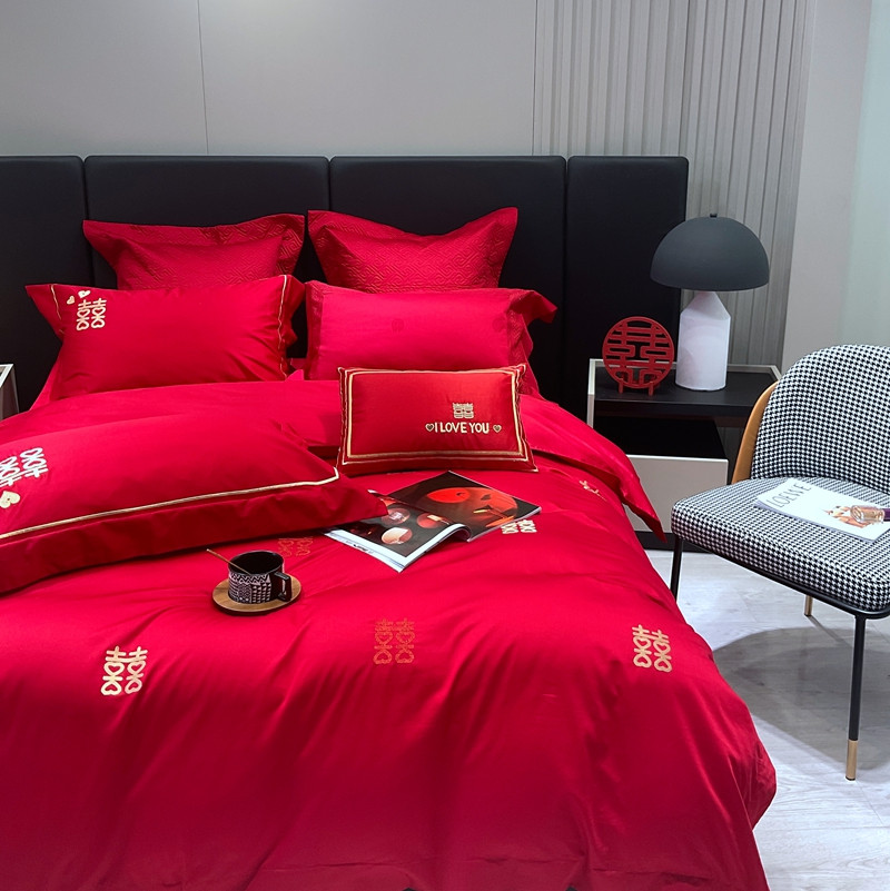 总橘滋 2022秋冬高端全棉婚庆新品大红重工刺绣四件套喜临门