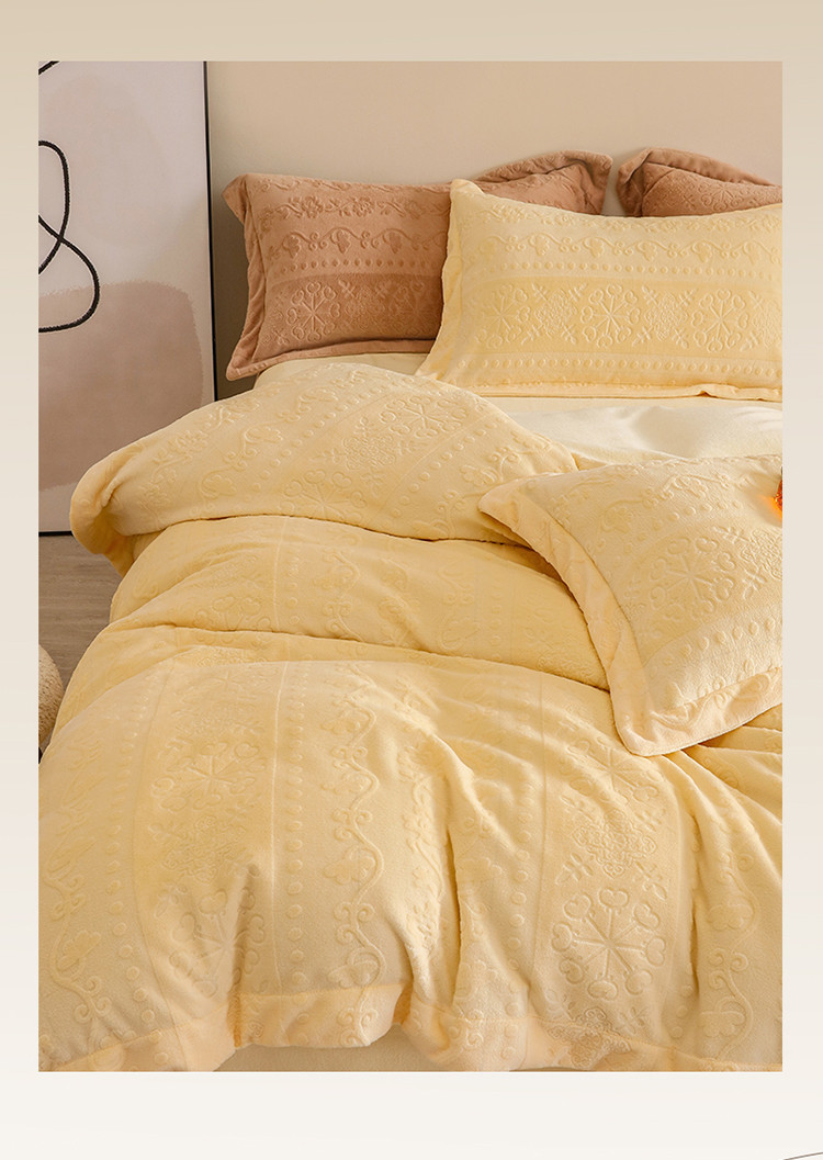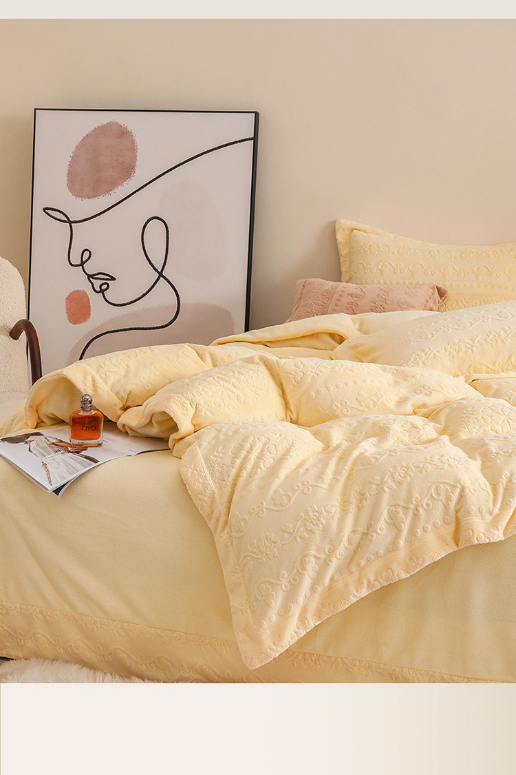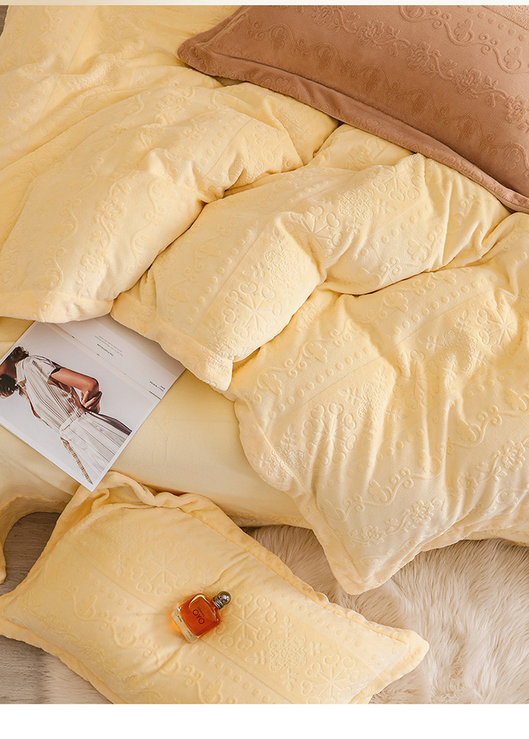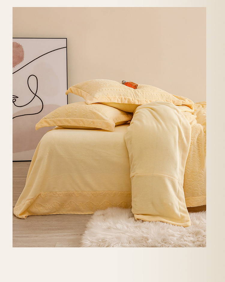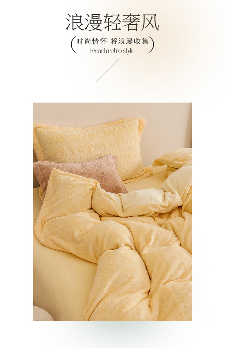 商品名称:名品优仓 2022新款辛西娅系列230g牛奶绒雕花四件套 辛西娅-细腻黄