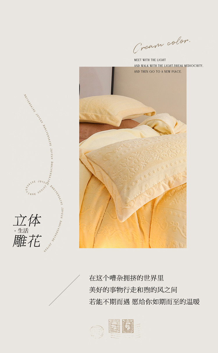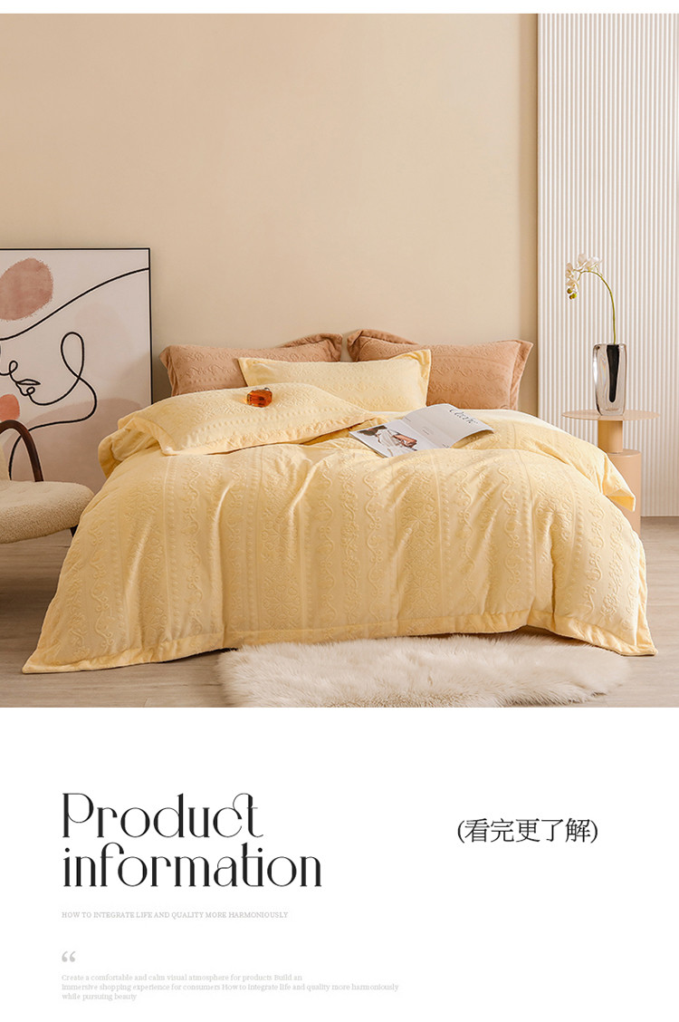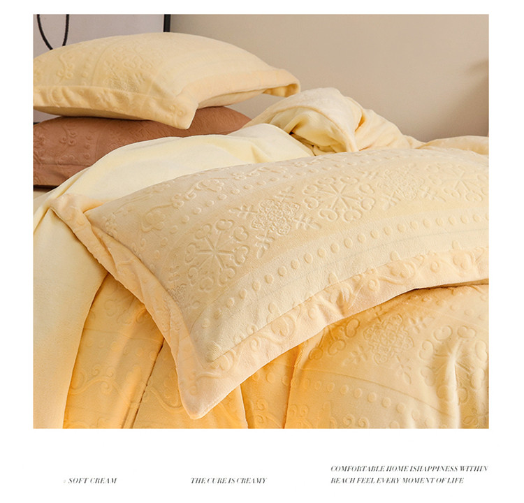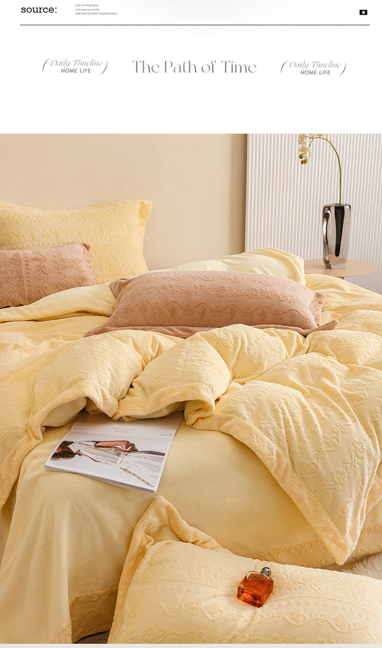 商品名称:名品优仓 2022新款辛西娅系列230g牛奶绒雕花四件套 辛西娅-细腻黄