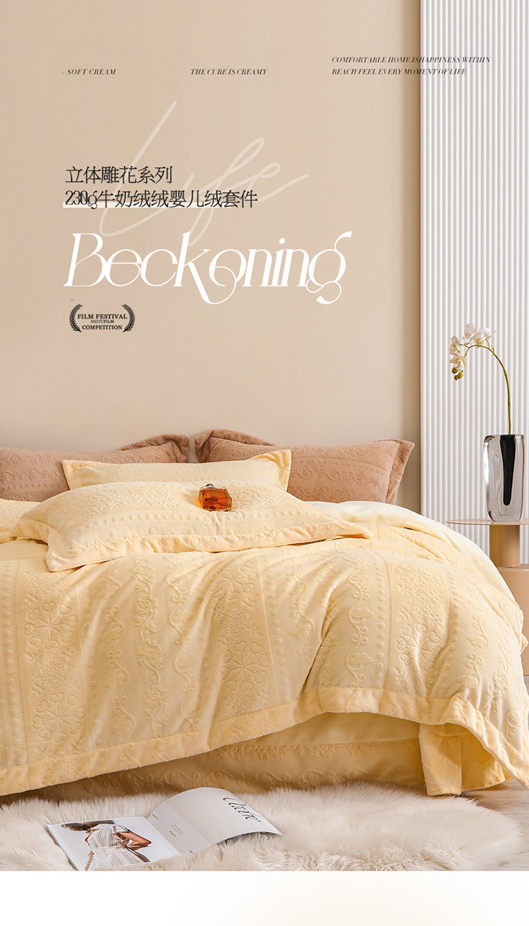 名品优仓 2022新款辛西娅系列230g牛奶绒雕花四件套 辛西娅-细腻黄