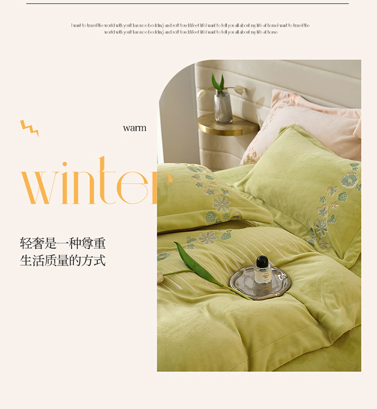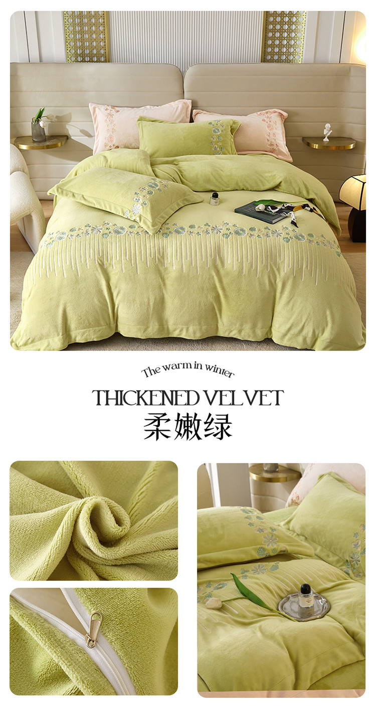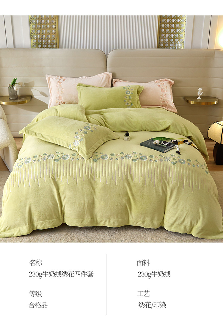商品名称:名品优仓 2022新款轻歌曼舞系列230g牛奶绒绣花四件套 轻歌曼舞-柔嫩绿