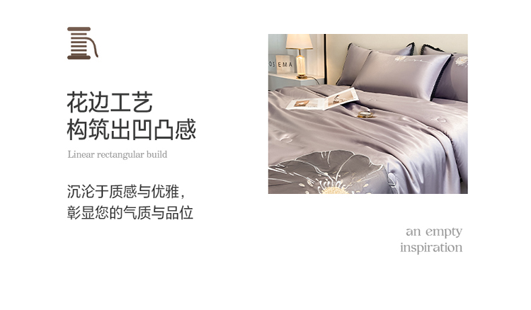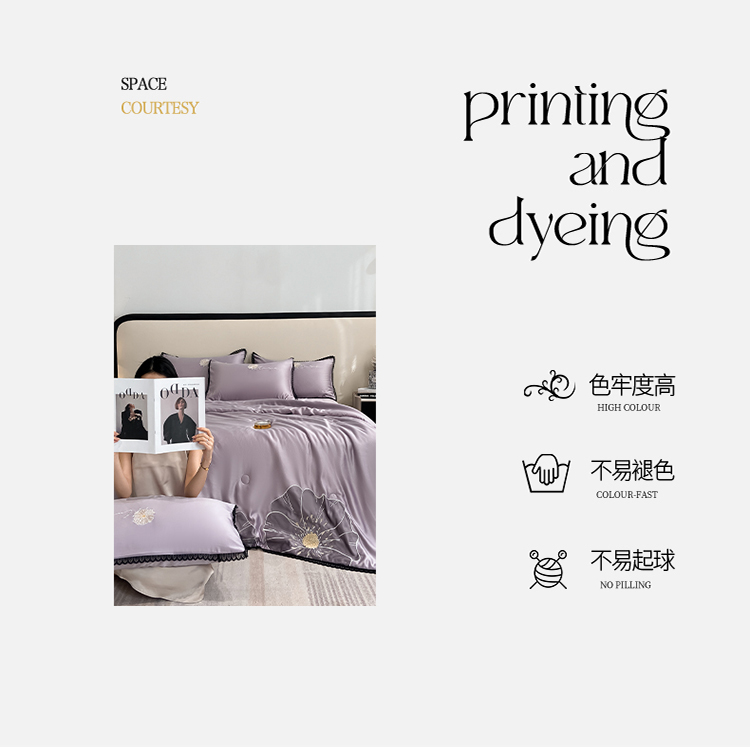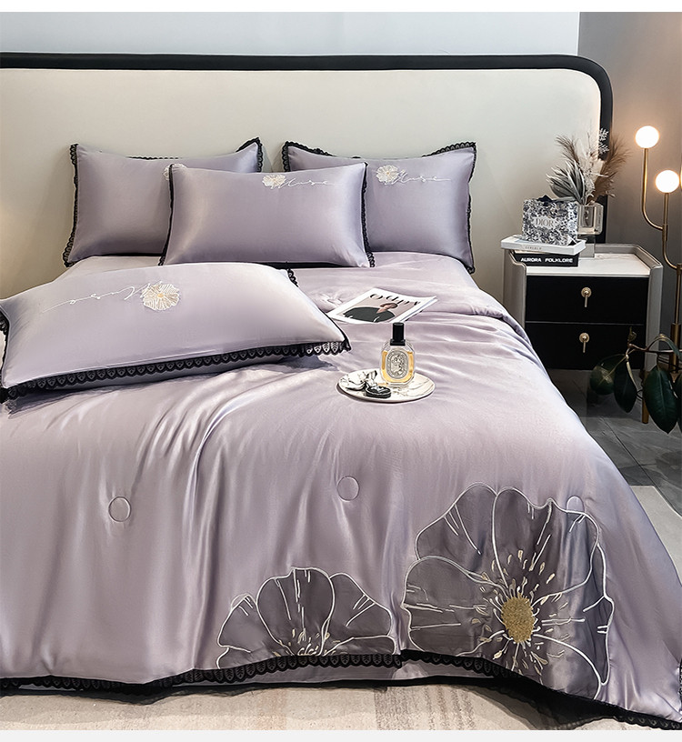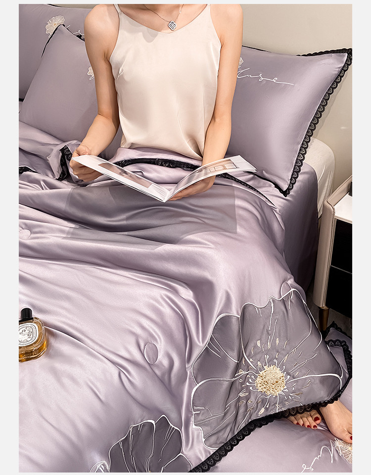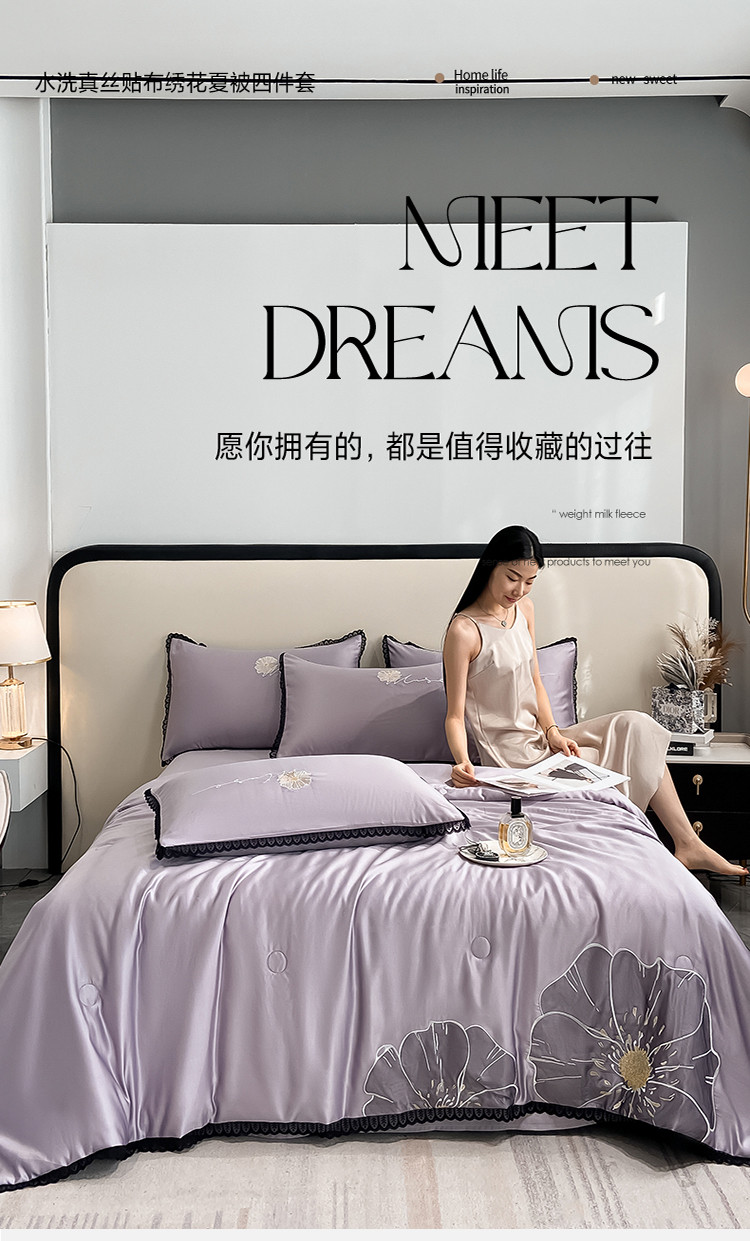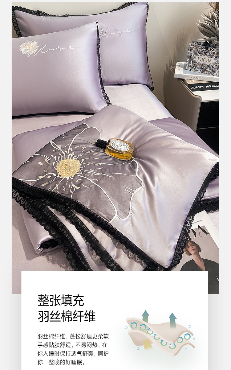 当前位置: 91家纺网 > 商品网购 > 床品套件 > 四件套 > 夏被四件套 > 2024子由家居水洗真丝贴布绣花花边夏被四件套 太阳花-浅紫