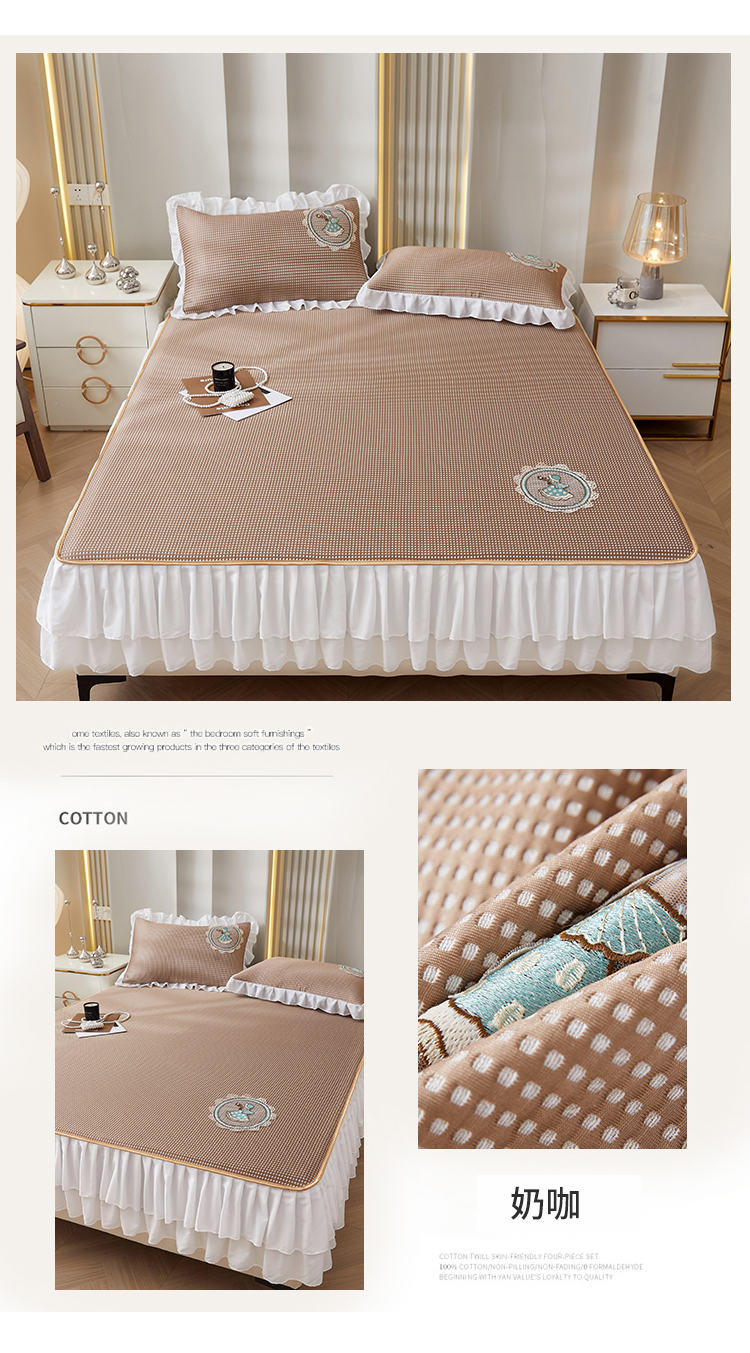 家之硕2024新款A类华夫格床笠花边床裙款软凉席三件套奶咖