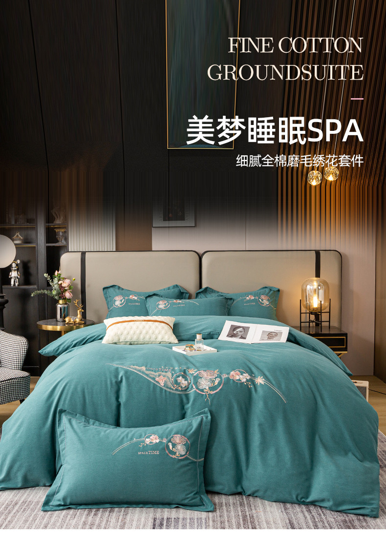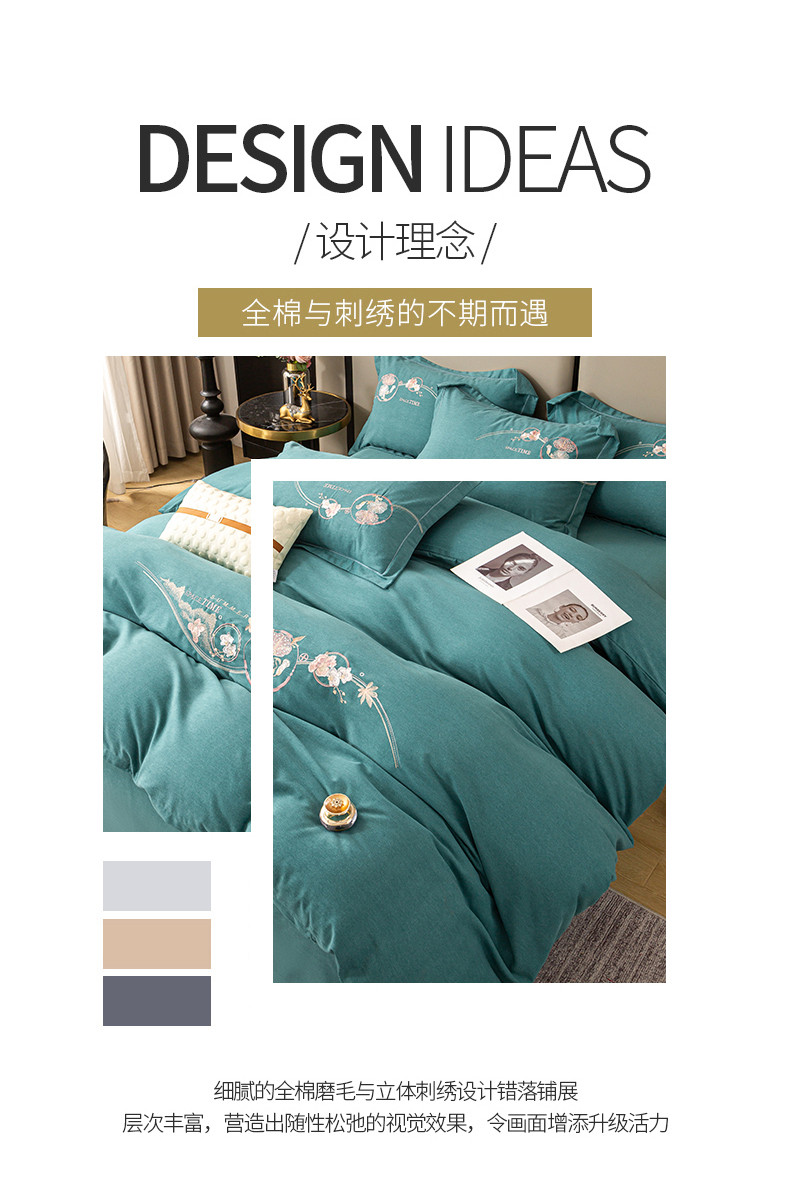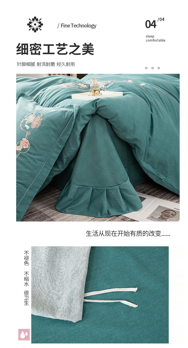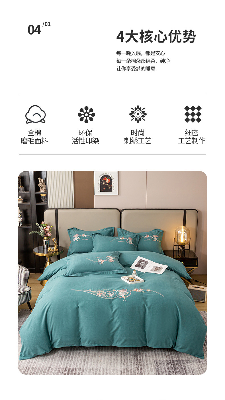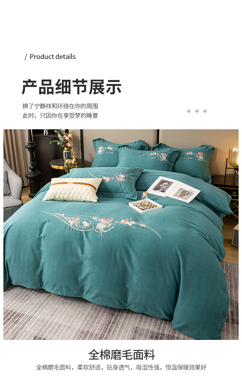 商品名称:昊翔2024新款绣花全棉磨毛刺绣工艺款四件套量大优惠花意浓-薄荷绿